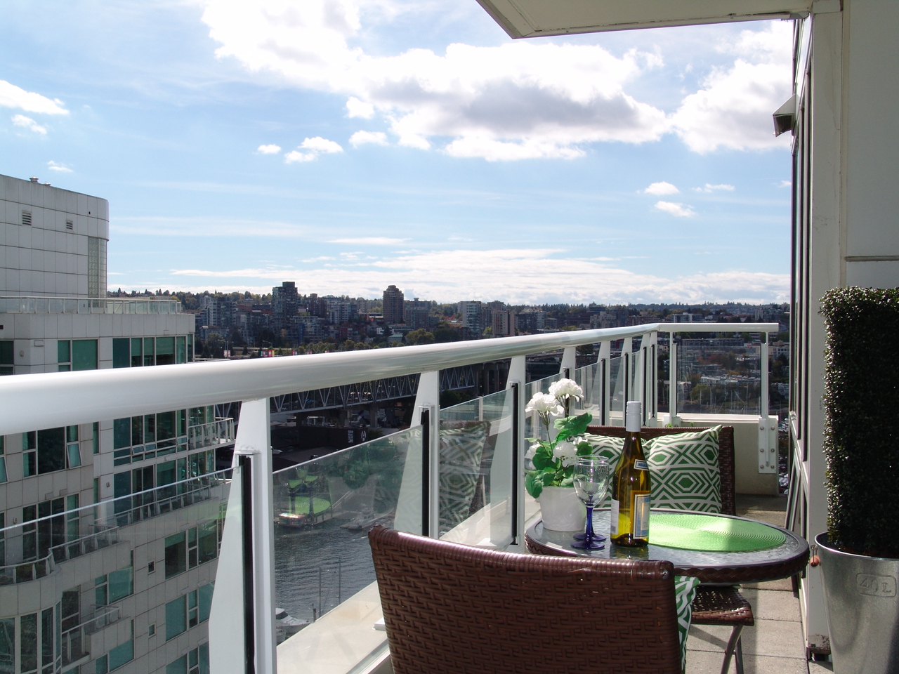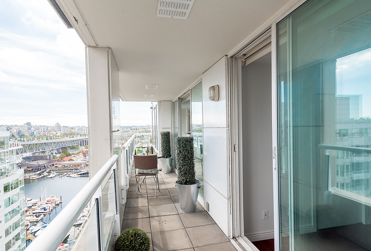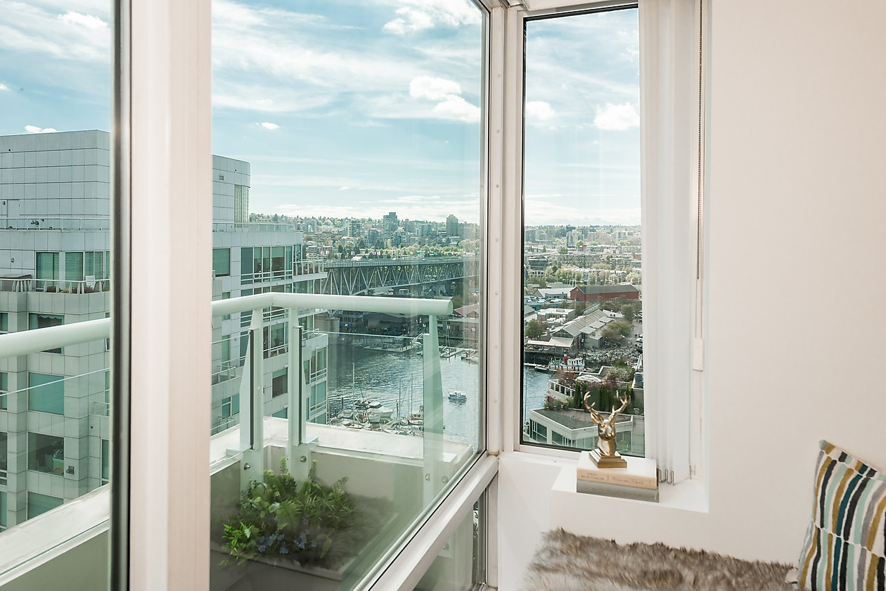 Bright and spacious 1008sqft semi-waterfront condo featuring water views to False Creek, the city, and Granville Island. Two good-sized bedrooms, 2 baths, gleaming hardwood floors, gas fireplace, floor-to-ceiling windows, stone counters, new paint and large 182 sq ft balcony accessible from every room. Resort-style amienites include well-equipped fitness facility, indoor swimming pool, sauna, and 24 hour concierge at your disposal. Fabulous location within steps of the seawall, restaurants, Aquabus to Granville Island, beaches, parks and Aquatic Centre, and all that vibrant False Creek area has to offer. 1 parking, and storage locker, rentals ok, 2 cats or 1 dog welcome.