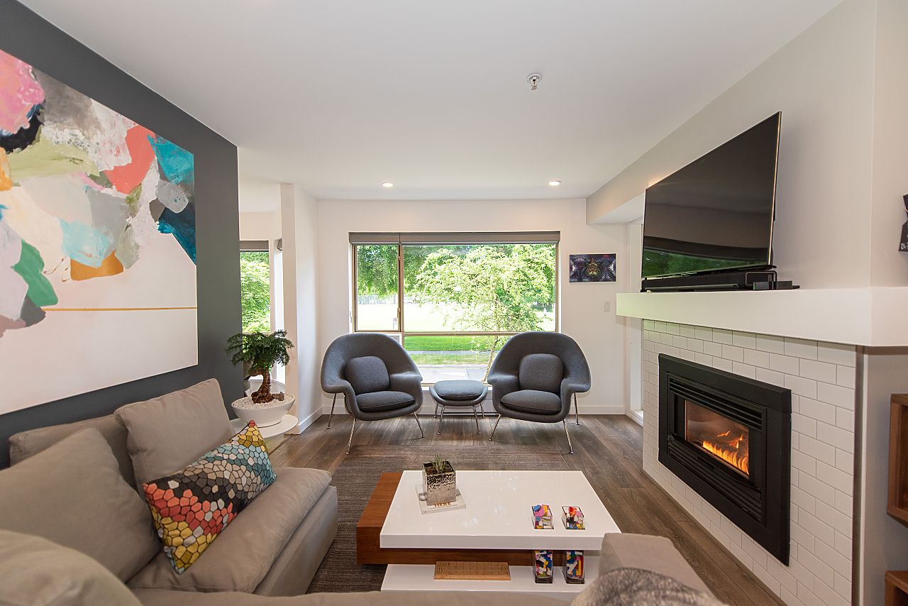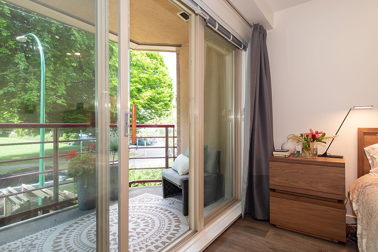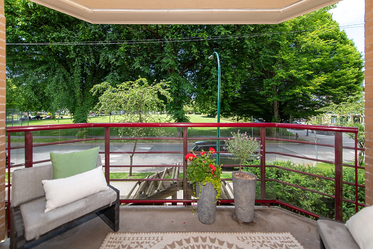 PERFECT! Set on the quiet side of a rainscreened building overlooking Mcbride Park this spacious, beautifully renovated 1-bedroom condo ticks all the boxes: west-facing park view, wide-plank laminate flooring, king-size bedroom with walk-in-closet, 16’ living room with space for an office, cozy gas fireplace, chef’s kitchen with Bosch SS appliances, sunny deck for BBQs, lots of insuite storage plus a storage locker, and the list goes on! Blenheim Place offers a large communal water-view roof deck for sun-lovers and is great for watching the fireworks. 1 parking in secure underground parkade. 2 pets OK. You will love this fabulous vibrant Kits location within steps of shops, park, and the beach nearby. Look no further, this is it!