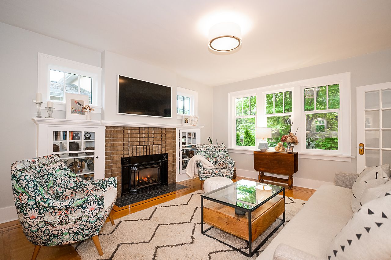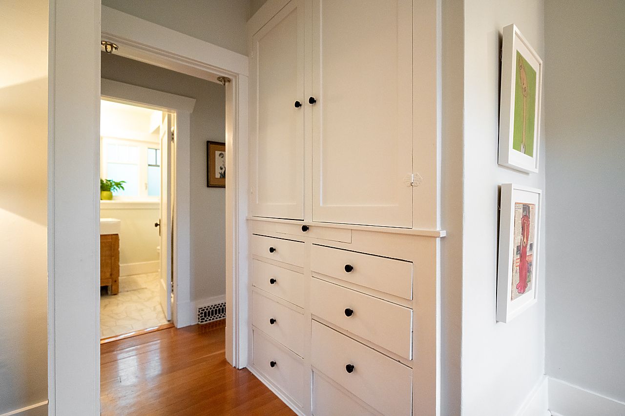 Gorgeous heritage elements including inlaid hardwood floors, classic built-in cabinets and window and door casings