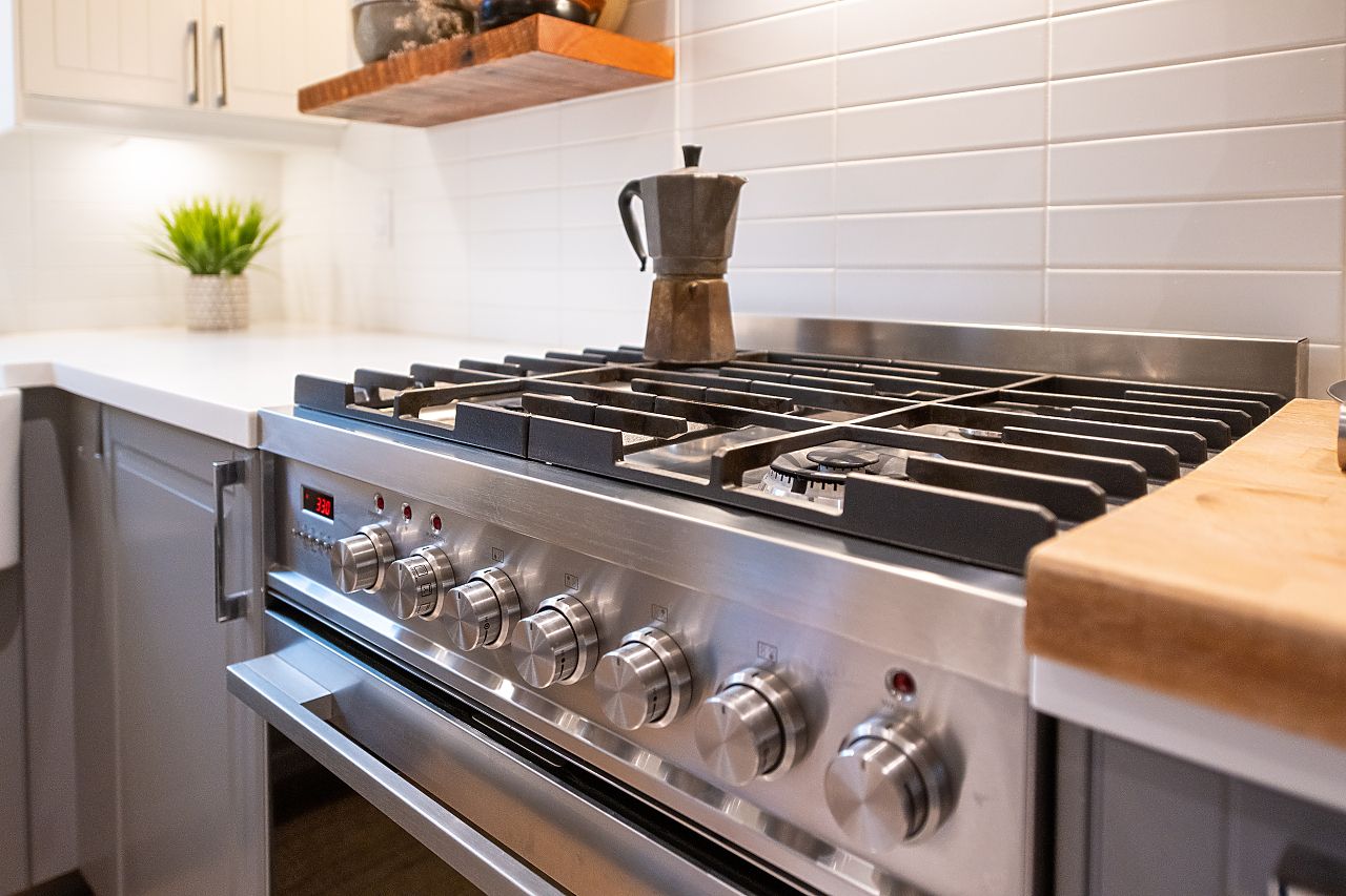 Renovated chef's kitchen, SS appliances, gas range, Corian counters, farmhouse apron kitchen sink