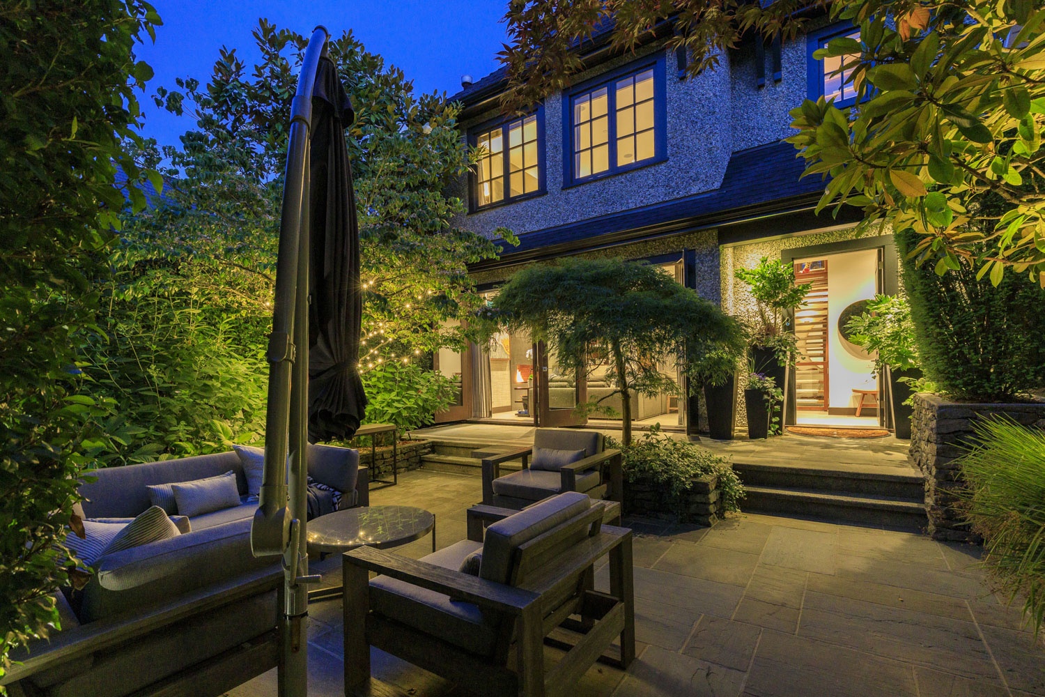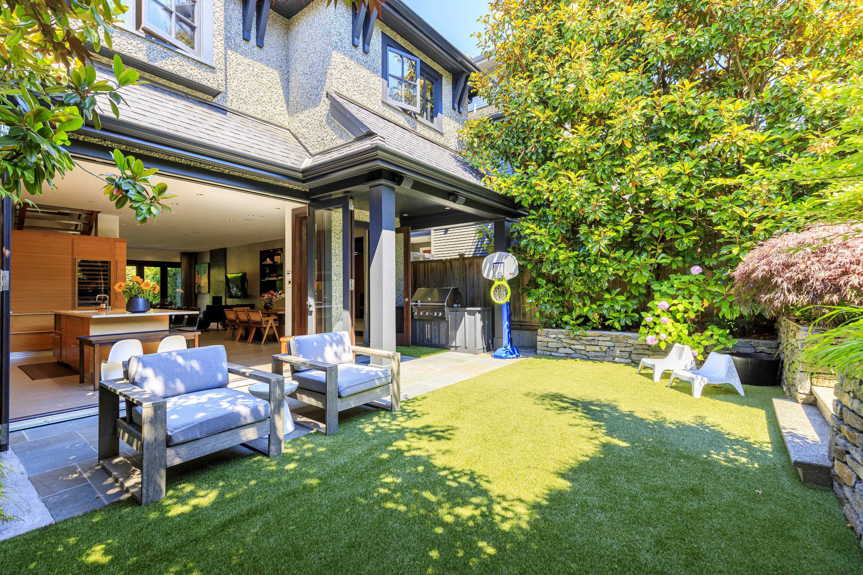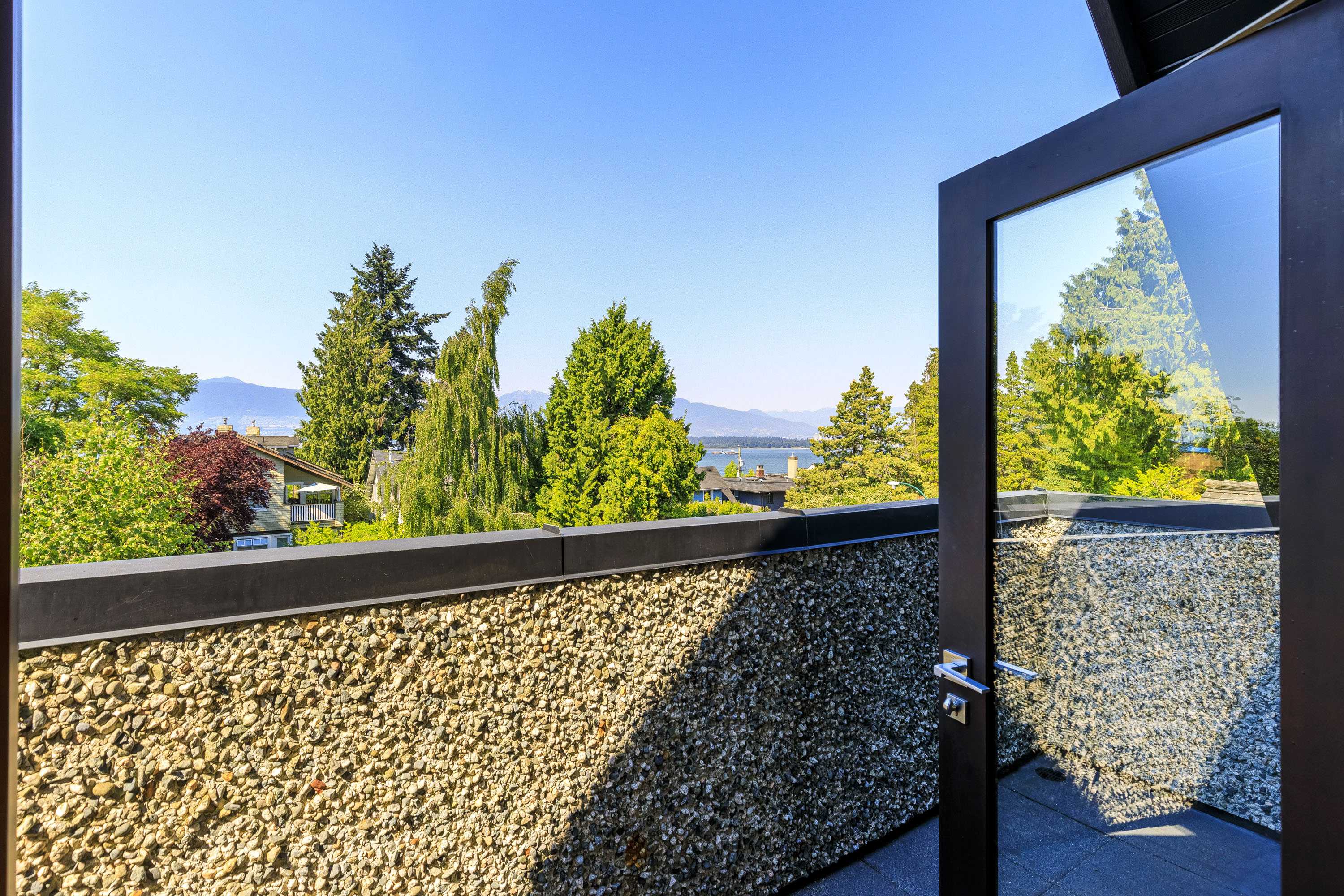 This IMPECCABLY designed home is located on a charming quiet lane in a popular Kitsilano neighbourhood within steps of the beach. Showcasing ocean and city views from the upper floors, the homes stunning contemporary interior perfectly compliments its heritage design exterior. The entertainment level features soaring 10' ceilings, a dramatic floating staircase, dual floor-to-ceiling polished concrete fireplaces, and a state-of-the-art chef's kitchen. Foldaway "Eclipse" French doors open to extremely private landscaped front and rear patios with a covered built-in gas BBQ. 3 bedrooms and 2 bathrooms upstairs including the master w/his and hers walk-in closets & a gorgeous ensuite bath. The light filled studio/office on top floor offers gorgeous views. Lower level features large rec room, wine cellar and laundry, plus loads of storage. Double car garage. Bayview Elementary and Kitsilano High school catchment. Walk to 4th Avenue shops.