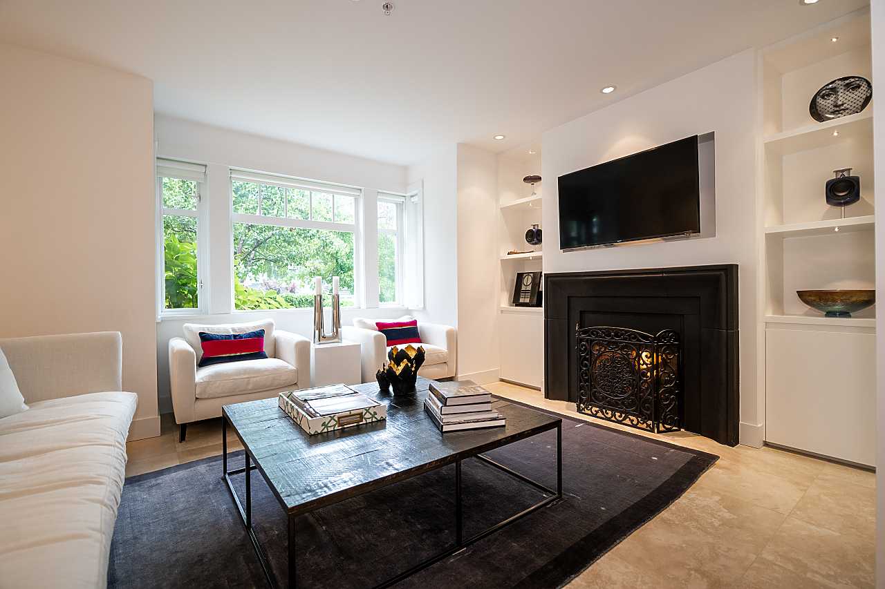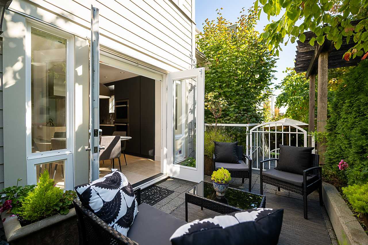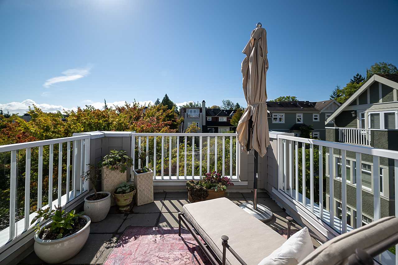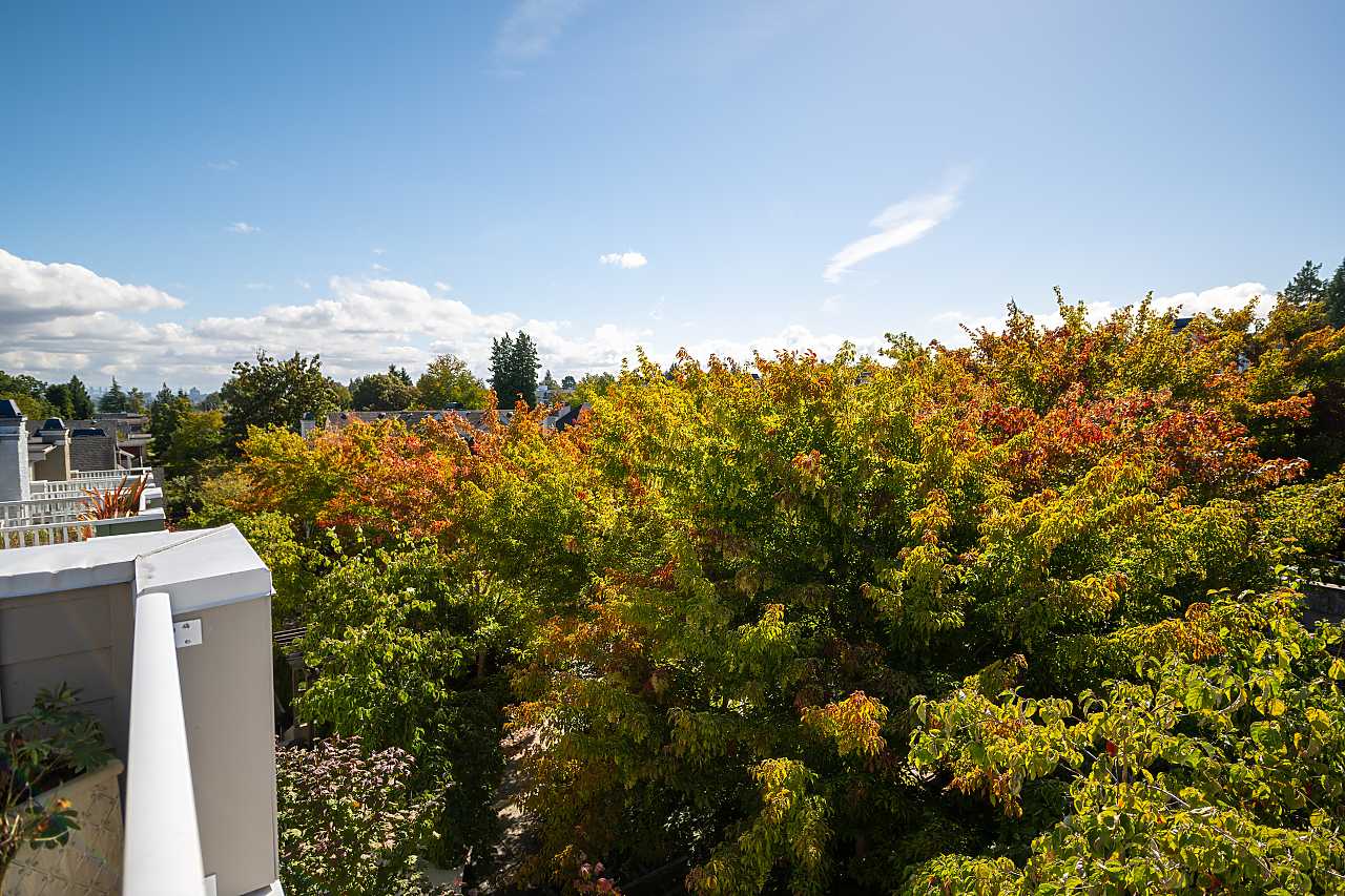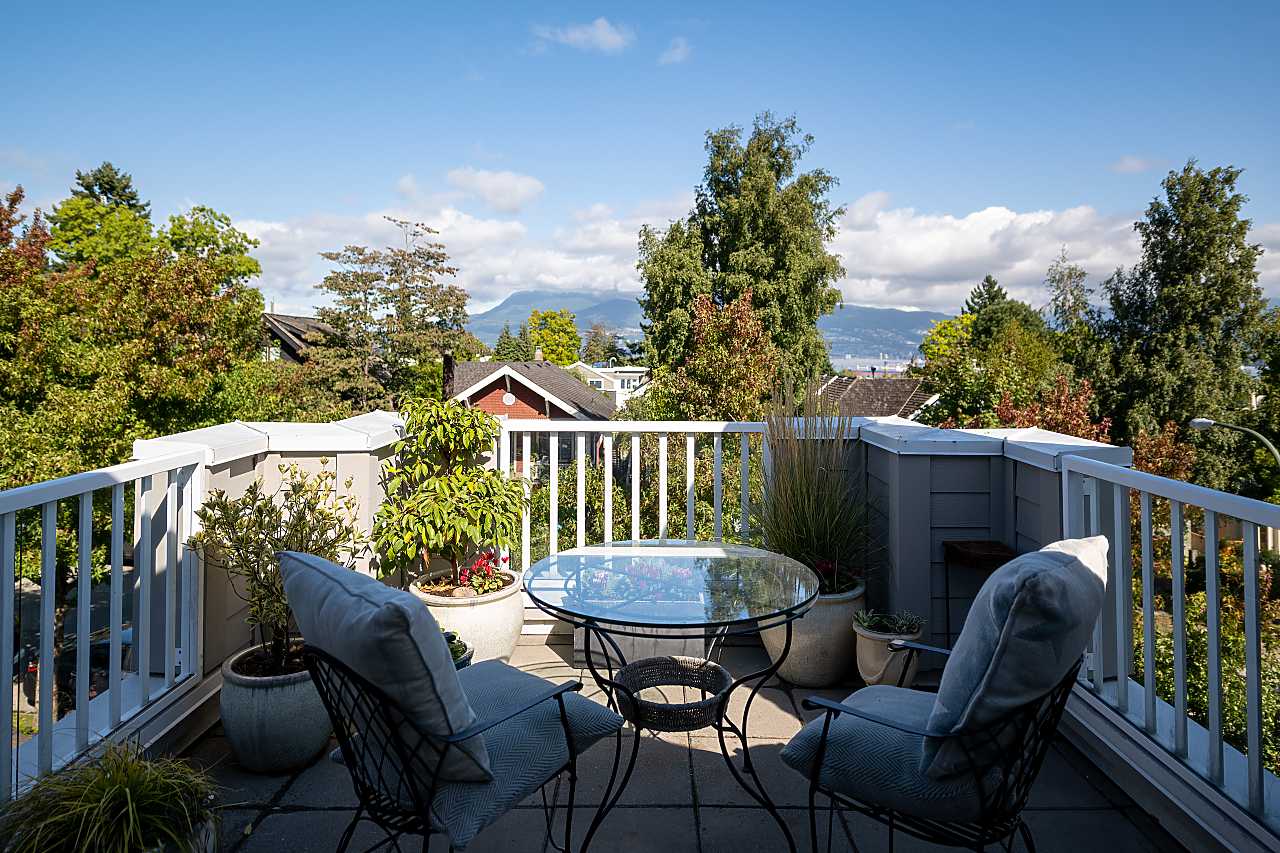 This exquisitely renovated water-view 1/2 duplex is set on a beautiful tree-lined street in an exclusive Point Grey neighbourhood in the coveted Sasamat Gardens development. Superb designer features abound throughout the spacious 2469 sq. ft. interior with 3 bedrooms, 4 bathrooms, and 2 offices. Features include gorgeous heated travertine floors on the main-level and gleaming engineered hardwood on the upper floors. The sleek contemporary kitchen and the dining area open via French doors to a sunny, wonderfully private south-facing patio. The top-level, with 2 decks, offers water and city views, built-in office and a bedroom (currently used as a rec room). The lower-level with soaring over-height ceilings offers a massive storage room, an office with built-in cabinetry, and direct access to 2 parking in the underground parkade. Sasamat Gardens features a beautiful garden courtyard, gym and meeting room. This outstanding home is within minutes of West 10th Ave shops, restaurants, transit, schools, UBC and the University Golf Club.