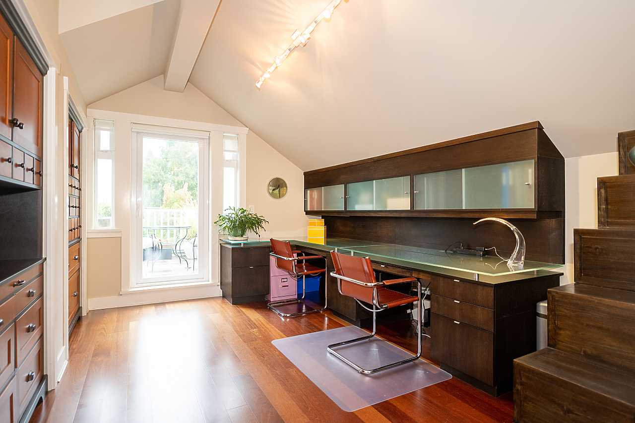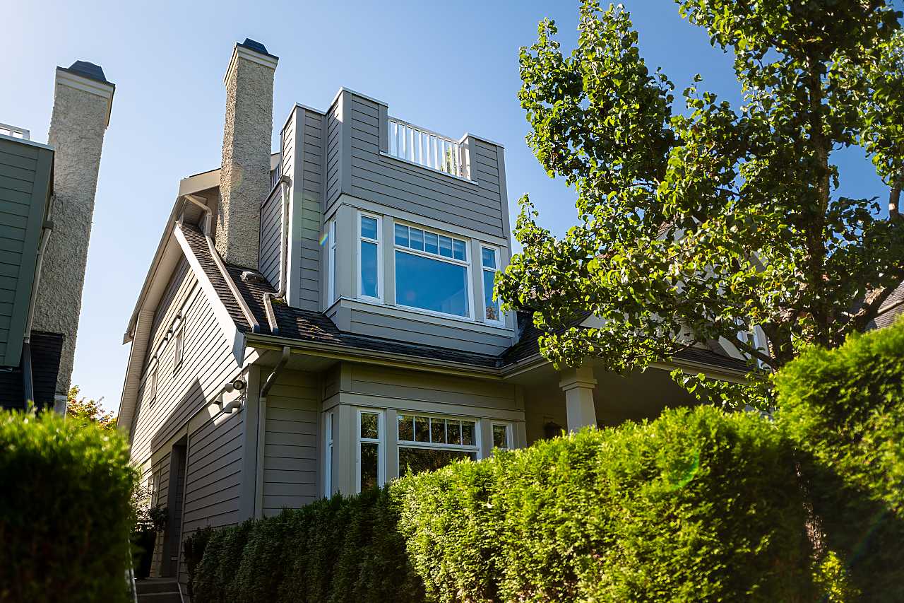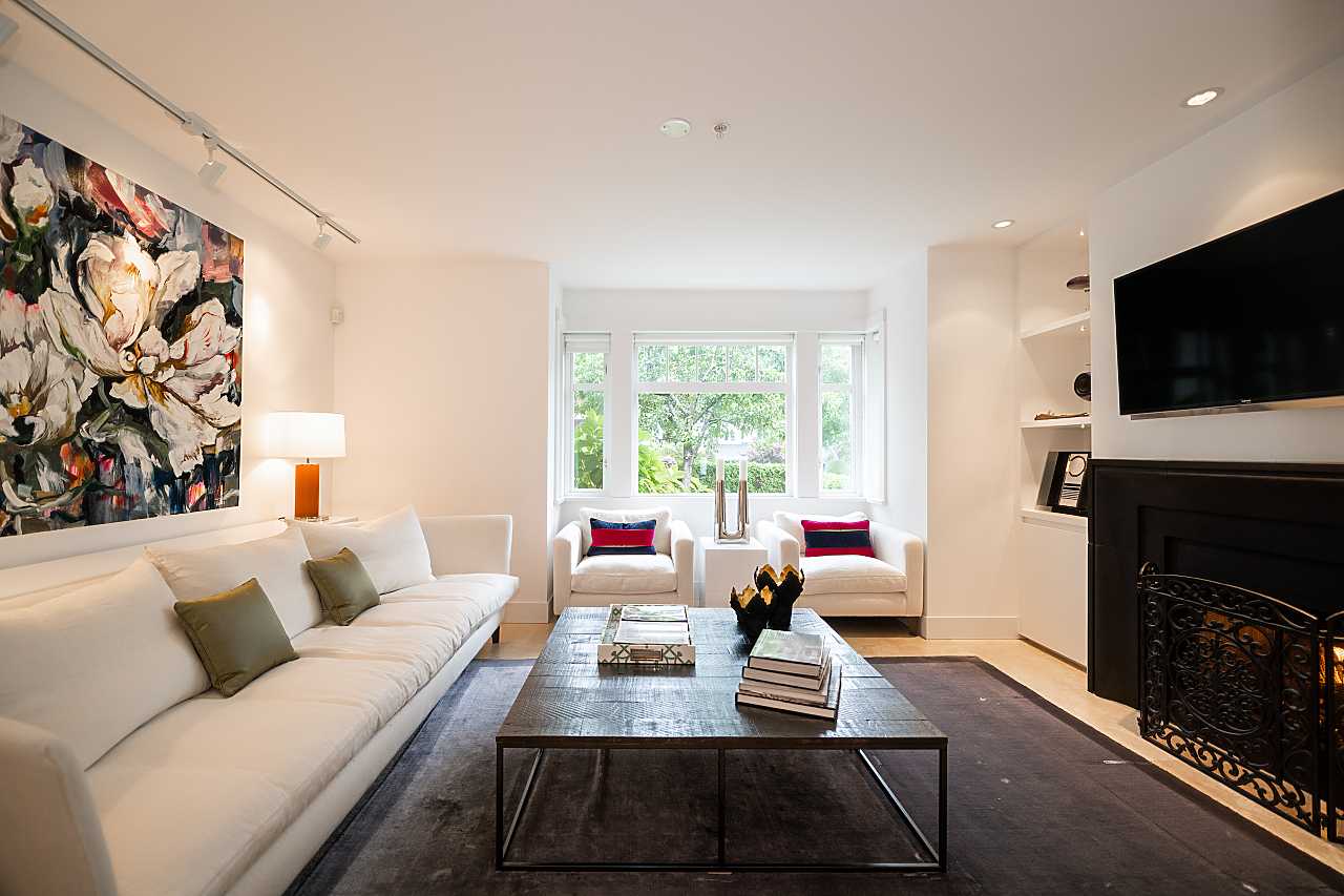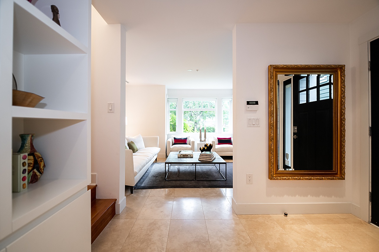 This exquisitely renovated water-view 1/2 duplex is set on a beautiful tree-lined street in an exclusive Point Grey neighbourhood in the coveted Sasamat Gardens development. Superb designer features abound throughout the spacious 2469 sq. ft. interior with 3 bedrooms, 4 bathrooms, and 2 offices. Features include gorgeous heated travertine floors on the main-level and gleaming engineered hardwood on the upper floors. The sleek contemporary kitchen and the dining area open via French doors to a sunny, wonderfully private south-facing patio. The top-level, with 2 decks, offers water and city views, built-in office and a bedroom (currently used as a rec room). The lower-level with soaring over-height ceilings offers a massive storage room, an office with built-in cabinetry, and direct access to 2 parking in the underground parkade. Sasamat Gardens features a beautiful garden courtyard, gym and meeting room. This outstanding home is within minutes of West 10th Ave shops, restaurants, transit, schools, UBC and the University Golf Club.
