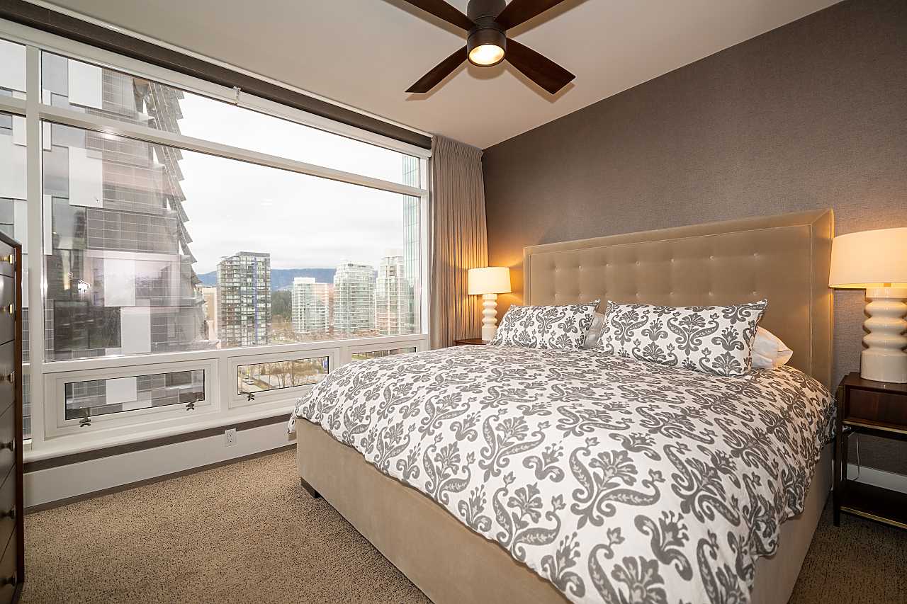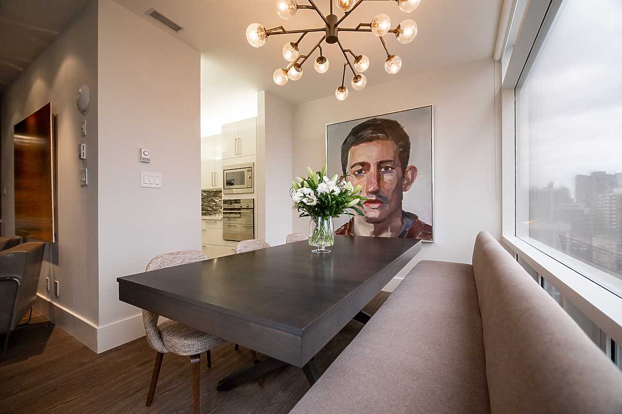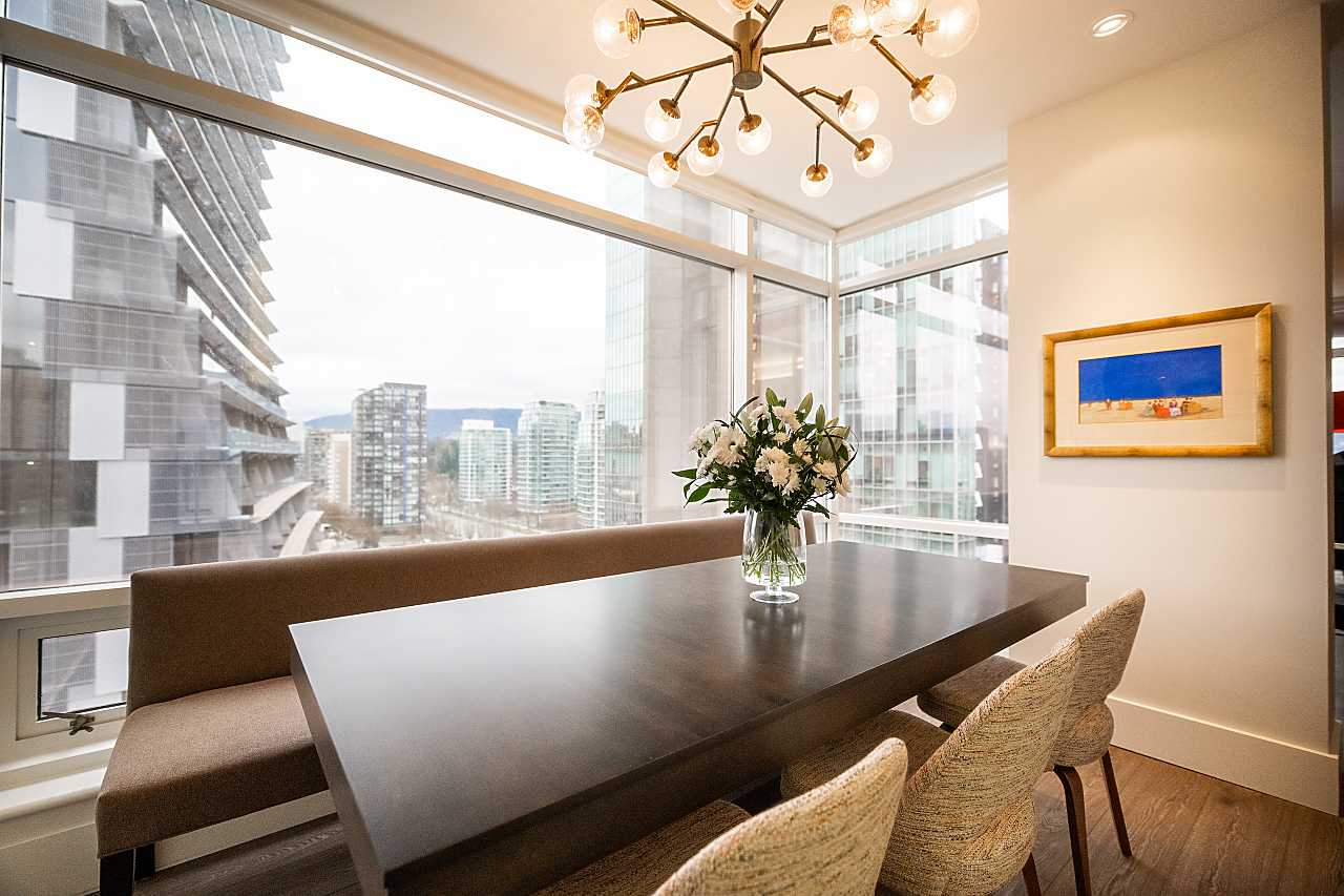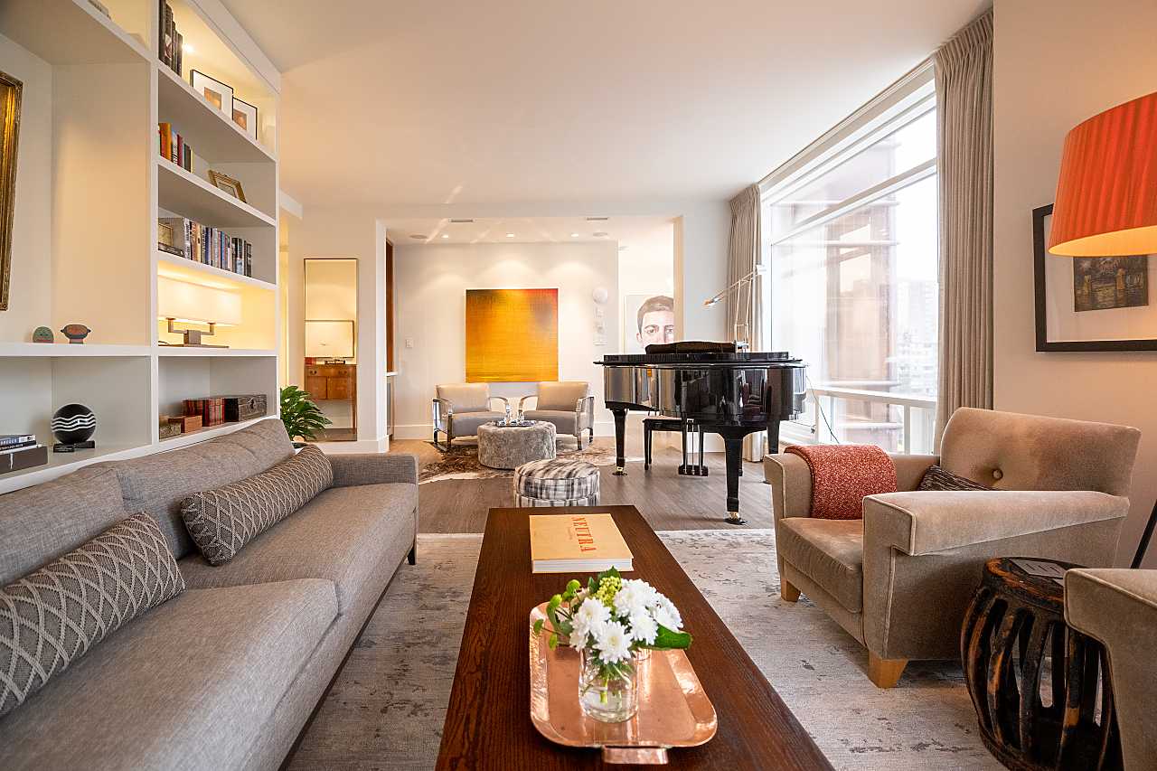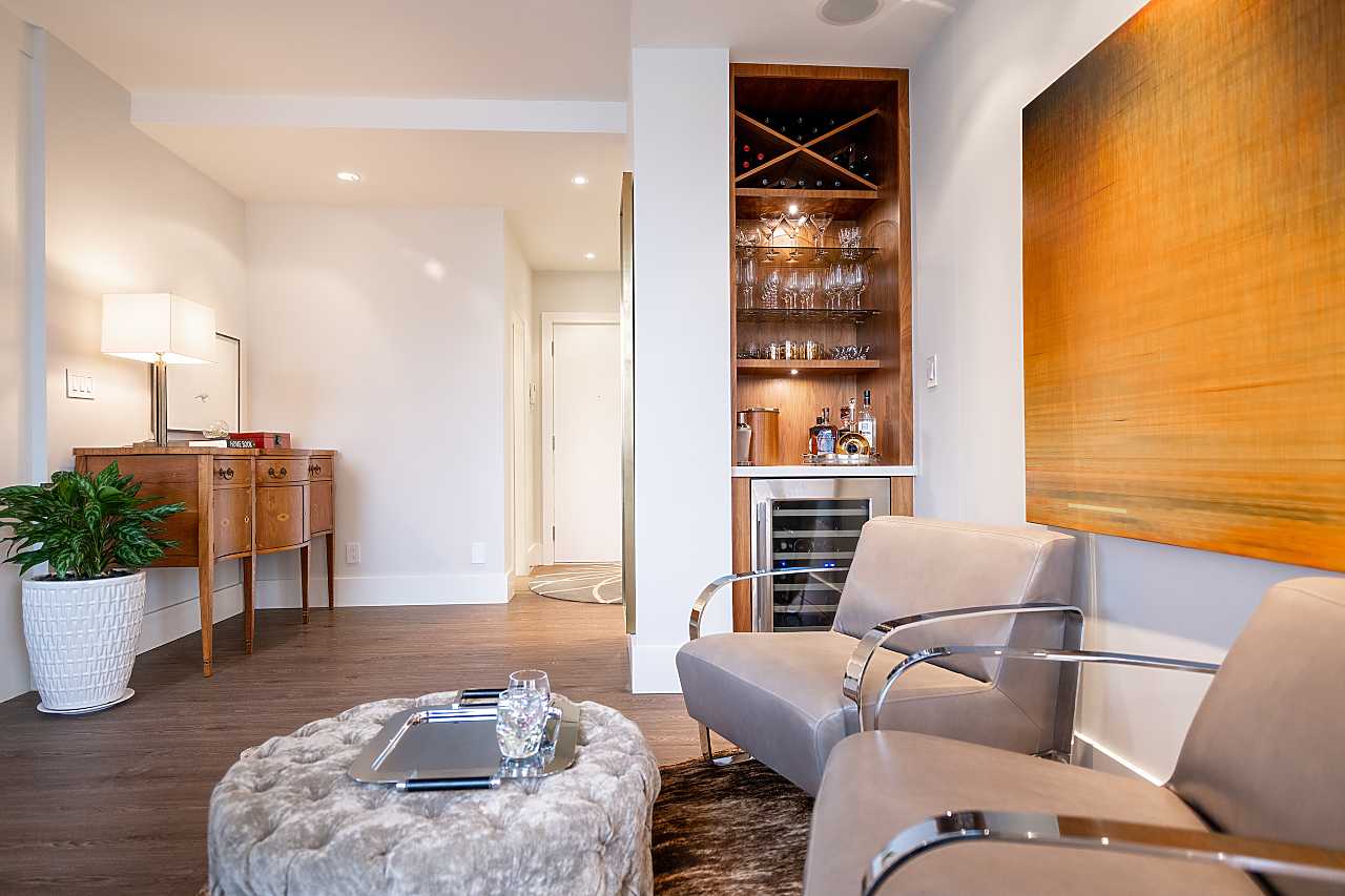Exuding elegance and sophistication, this spectacular, masterfully renovated apartment comprises 1656 sq. ft. of luxurious living space. With impeccable design, custom details, and quality finishes, this outstanding air-conditioned home offers 2 bedrooms, 2 1/2 bathrooms, a family room (could be 3rd bedroom), chef's kitchen with eating area, and corridor views of the water and mountains. The iconic James Cheng designed building features a dramatic 3-storey lobby, 24/7 1st class concierge service, and resort-style amenities, all within steps of Robson Street shops & services, the Seawall and Stanley Park. This vibrant neighbourhood is quickly becoming one of the city’s most prestigious enclaves with spectacular landmark luxury condominiums being constructed nearby. Truly exceptional!