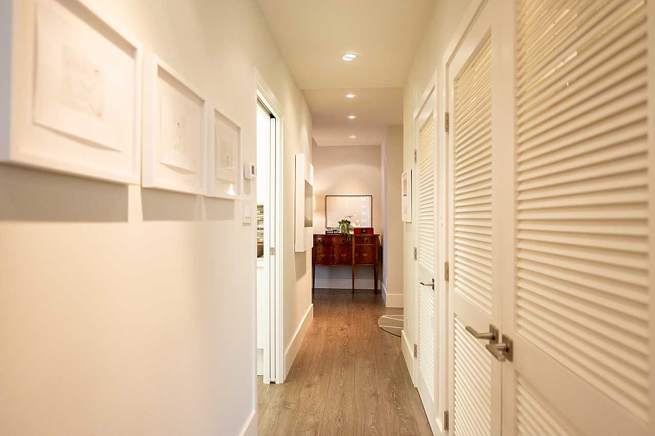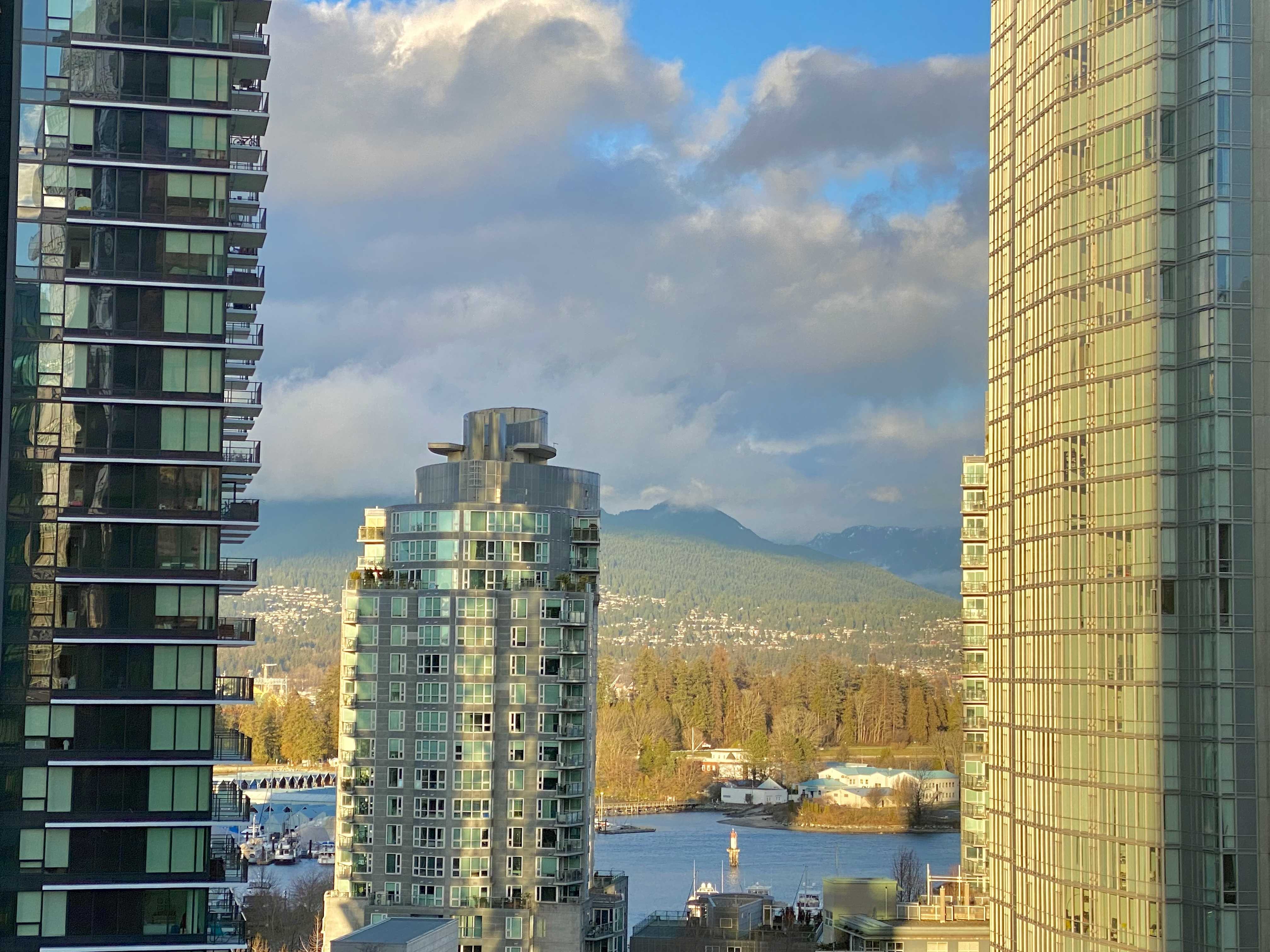 Corridor views to the water, city, and mountains