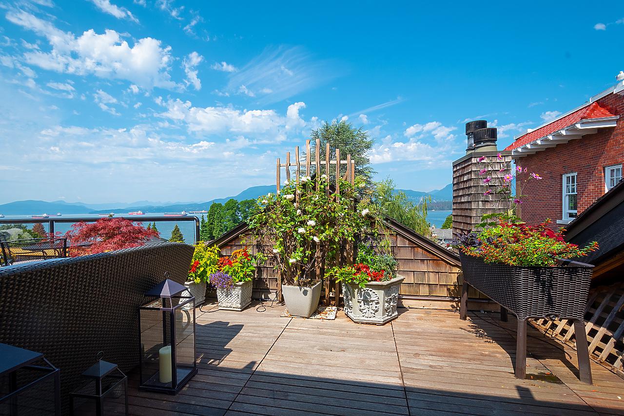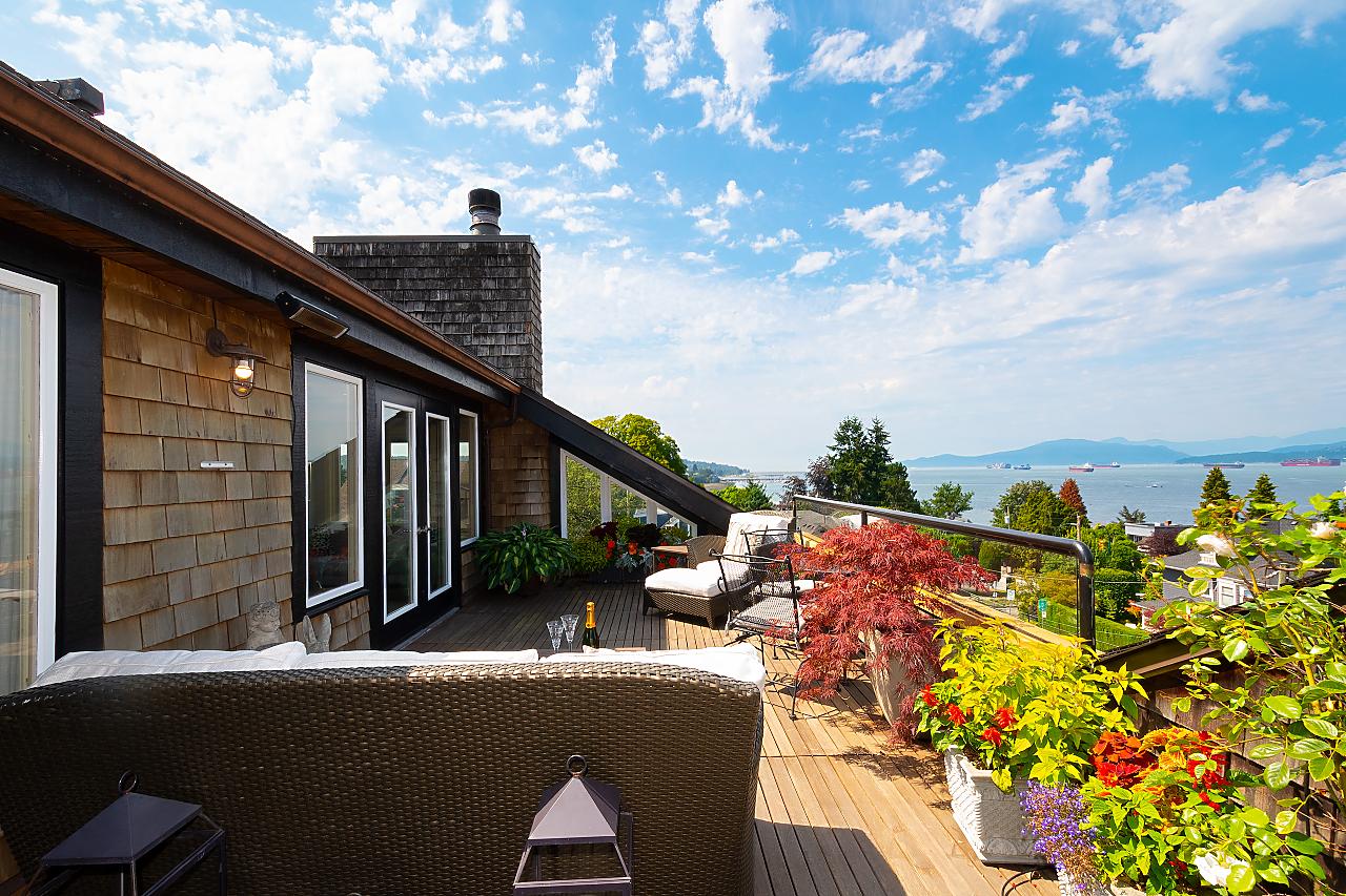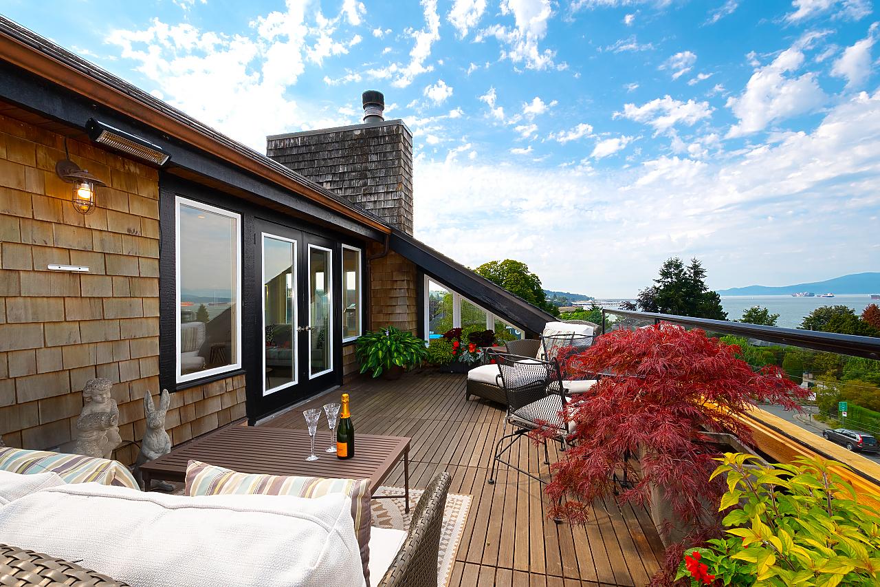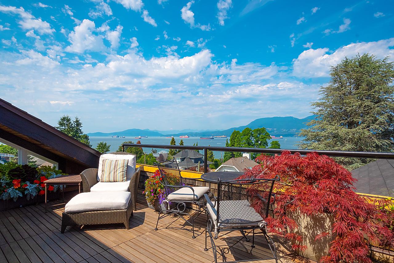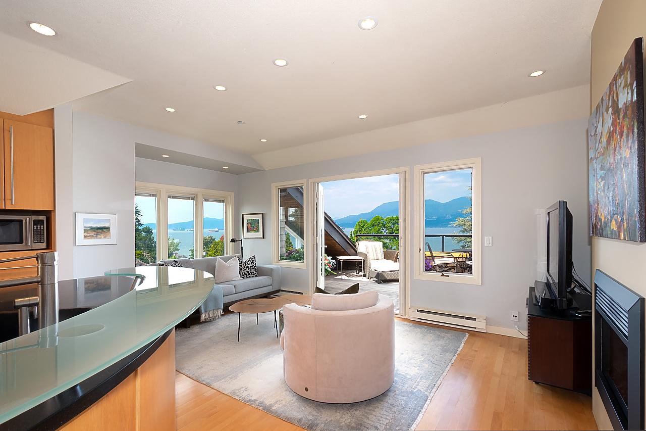 This truly unique top-floor townhouse offers SOME OF THE MOST SPECTACULAR VIEWS IN THE CITY, and from every room! French doors from the light-filled living area and the king-sized primary bedroom take you to a massive 407 Sq. Ft. walkout deck with truly breathtaking views, offering an ideal indoor/outdoor lifestyle. A private elevator takes you directly to your private garage! Thoughtful designer touches abound, tons of in-suite storage plus a large storage locker, all in a well-maintained boutique building with a friendly pro-active strata. Set high on the hill in a super-quiet enclave just a block to the beach, yet only a 2 minute drive to all shops and services, and 10 minutes to downtown, this no-compromise location offers the utmost in both lifestyle and convenience. A rare opportunity to own something extremely special!