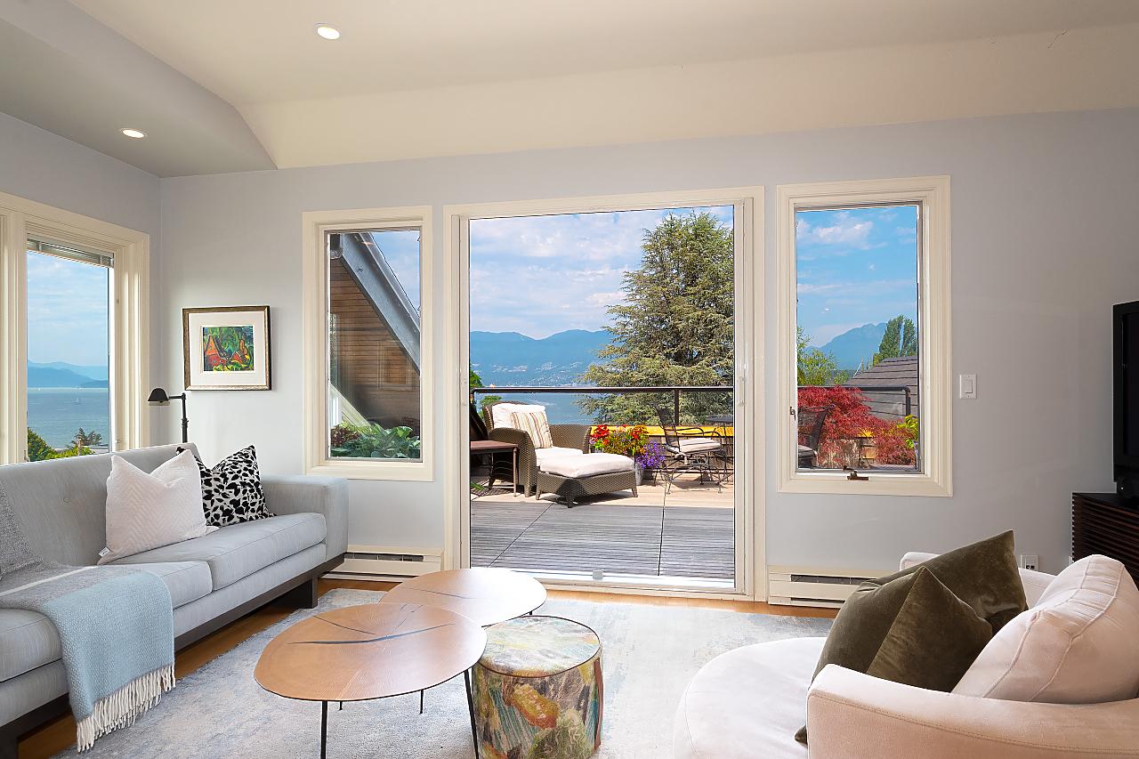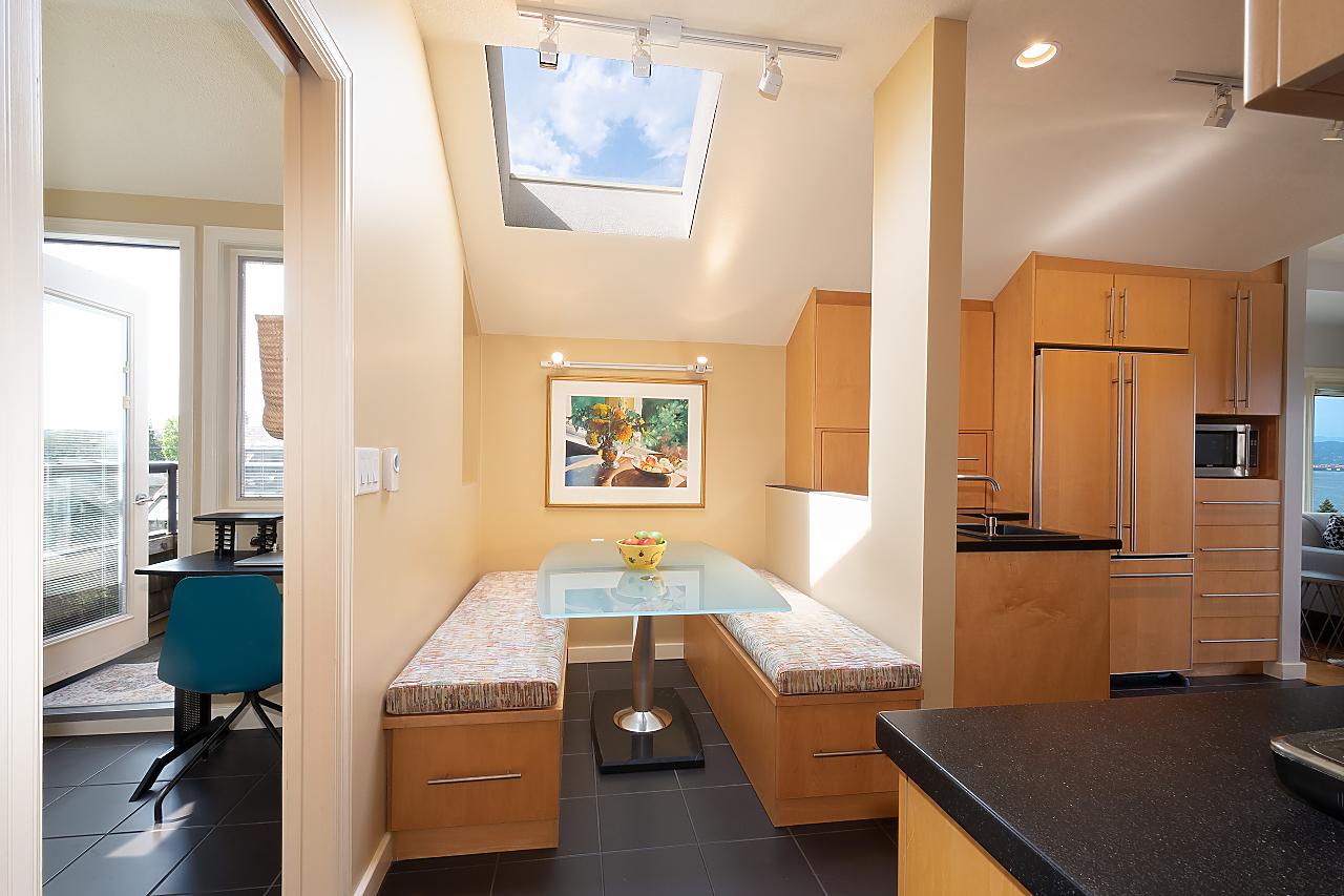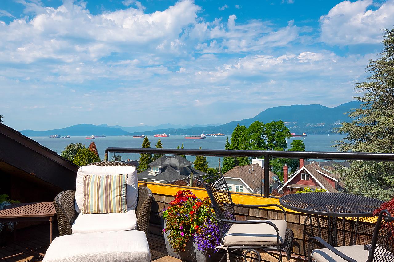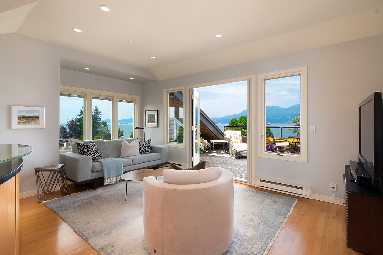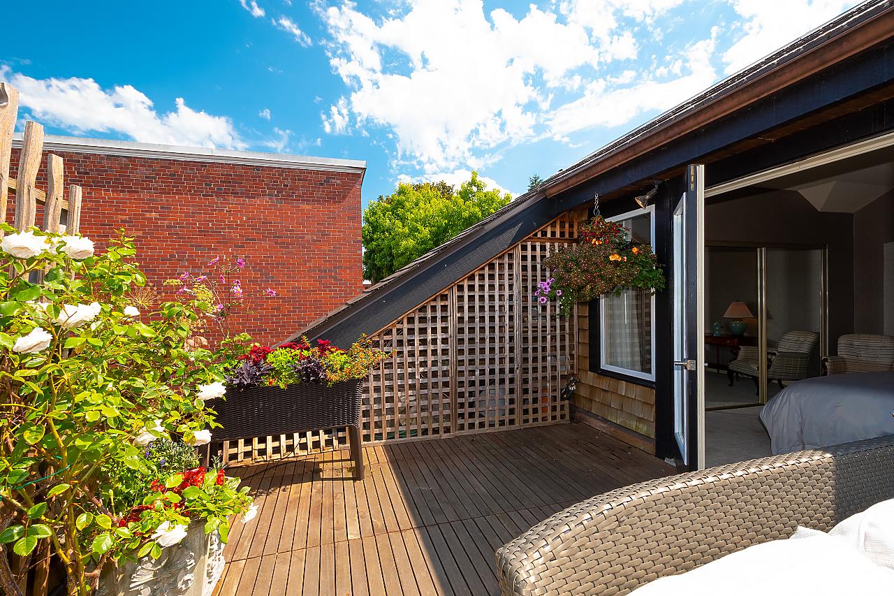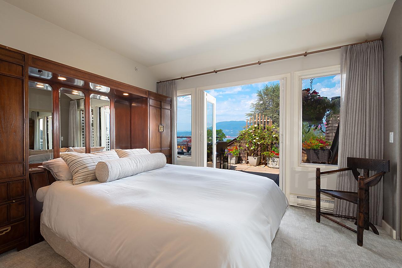 This truly unique top-floor townhouse offers SOME OF THE MOST SPECTACULAR VIEWS IN THE CITY, and from every room! French doors from the light-filled living area and the king-sized primary bedroom take you to a massive 407 Sq. Ft. walkout deck with truly breathtaking views, offering an ideal indoor/outdoor lifestyle. A private elevator takes you directly to your private garage! Thoughtful designer touches abound, tons of in-suite storage plus a large storage locker, all in a well-maintained boutique building with a friendly pro-active strata. Set high on the hill in a super-quiet enclave just a block to the beach, yet only a 2 minute drive to all shops and services, and 10 minutes to downtown, this no-compromise location offers the utmost in both lifestyle and convenience. A rare opportunity to own something extremely special!