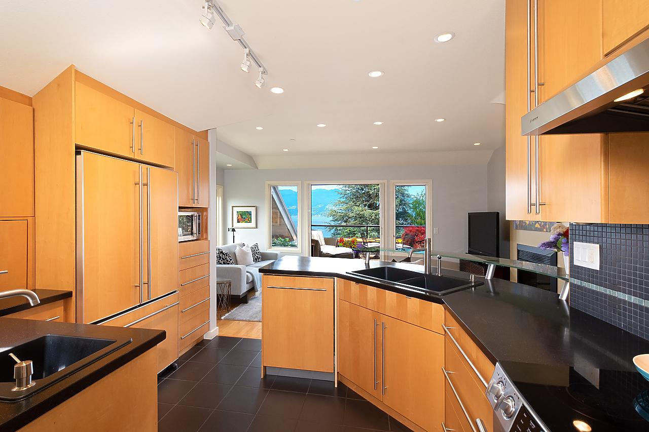 Vaulted ceilings, skylight and large windows make the home bright year round