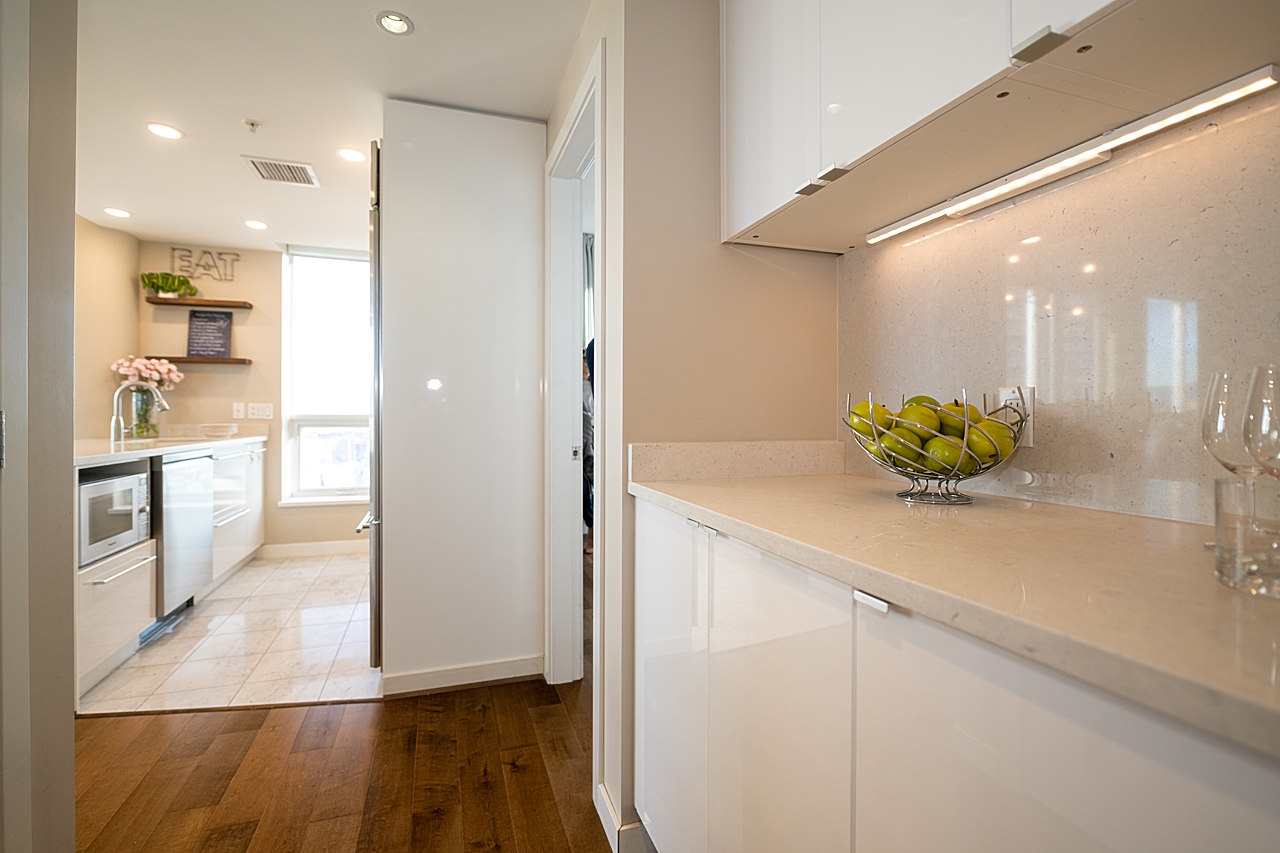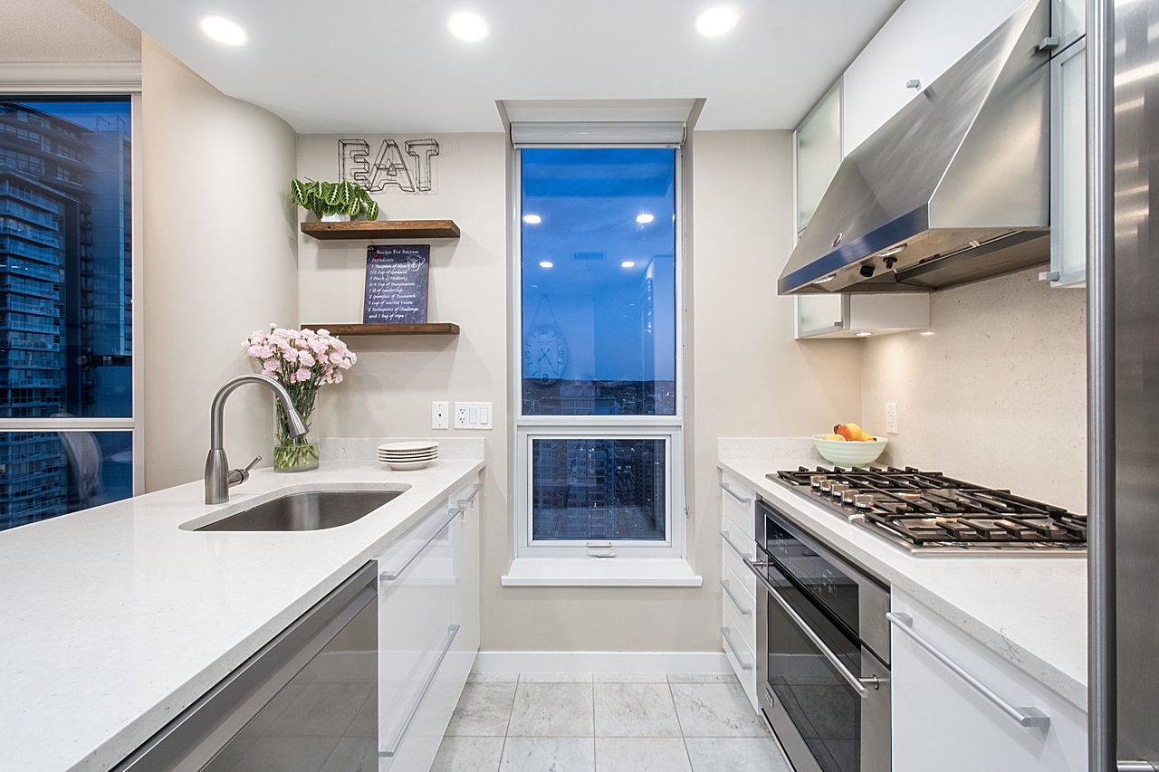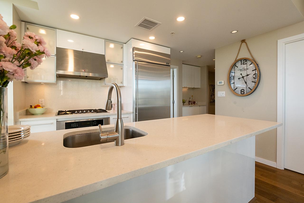 Updated and expanded kitchen with Bosch 5-burner gas stove-top, built-in oven, integrated fridge, LED lighting, new Samsung dishwasher, quartz counters and prep counter with custom cabinets and storage