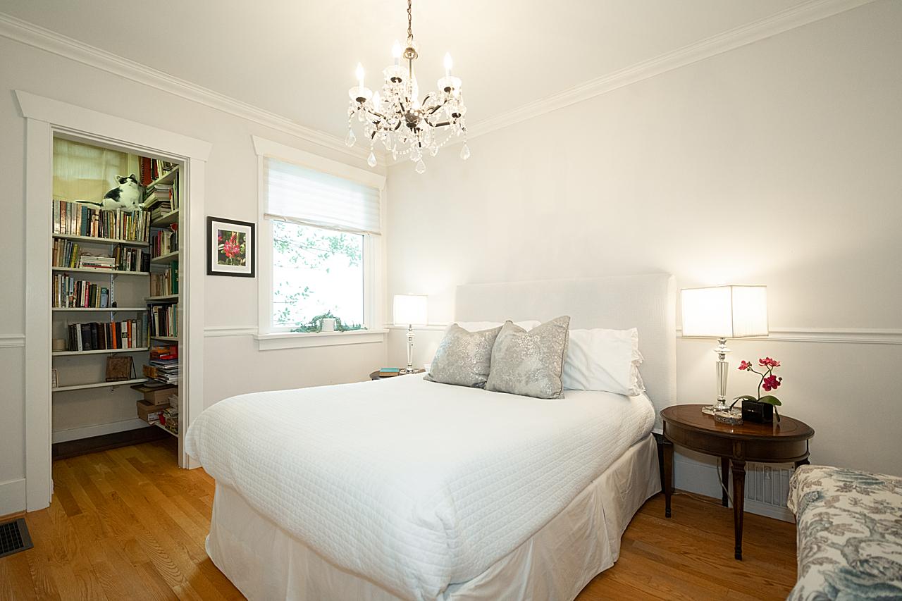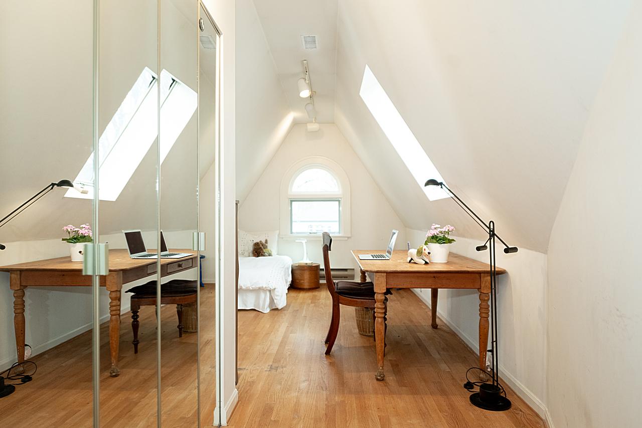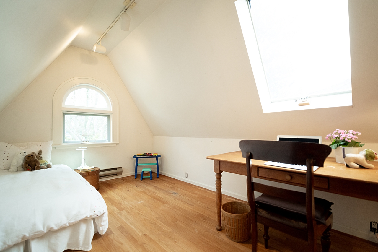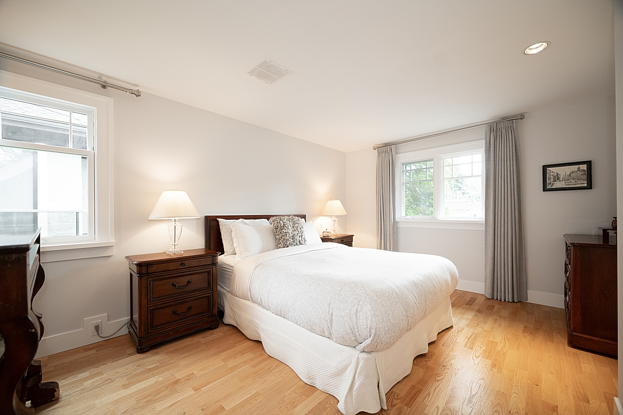Primary bedroom on top floor with elegant black-out drapery, custom built-in storage and desk and updated ensuite bathroom