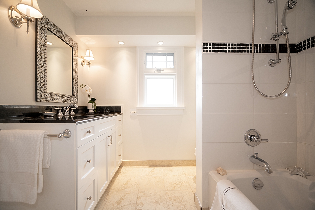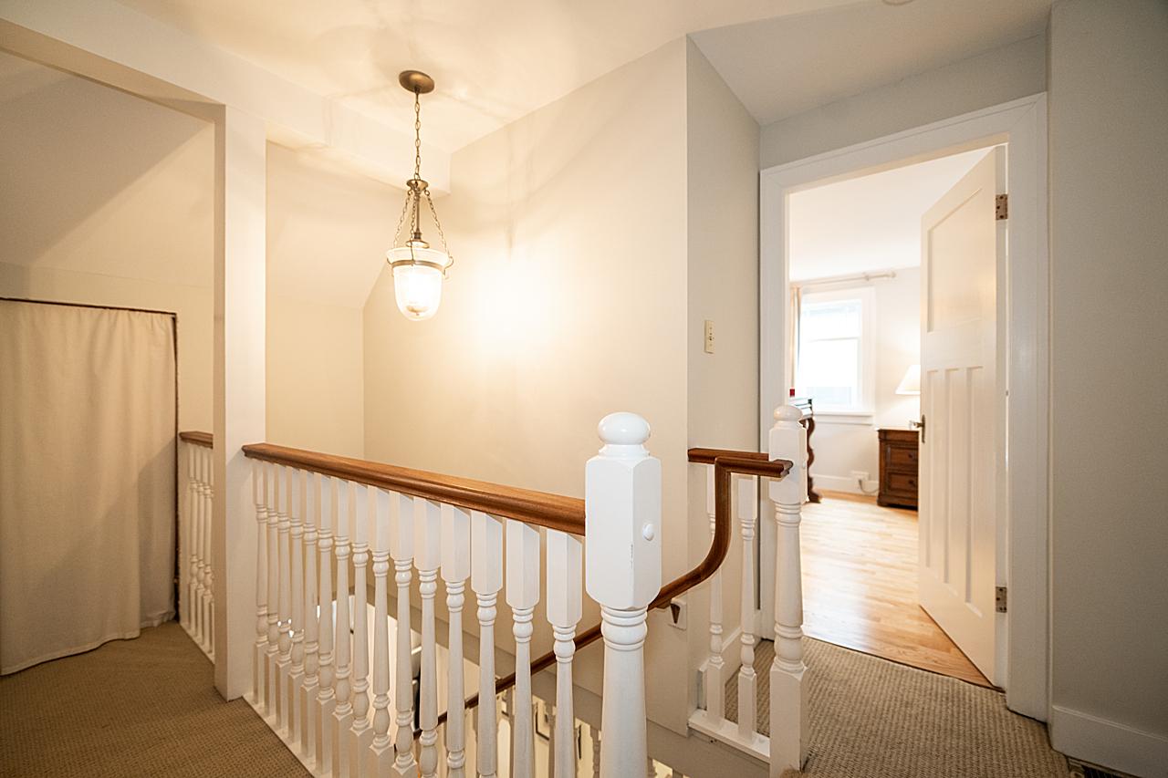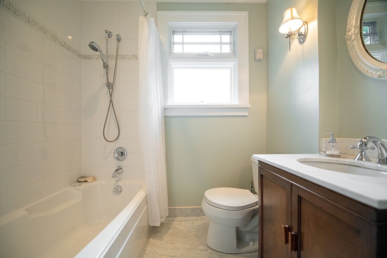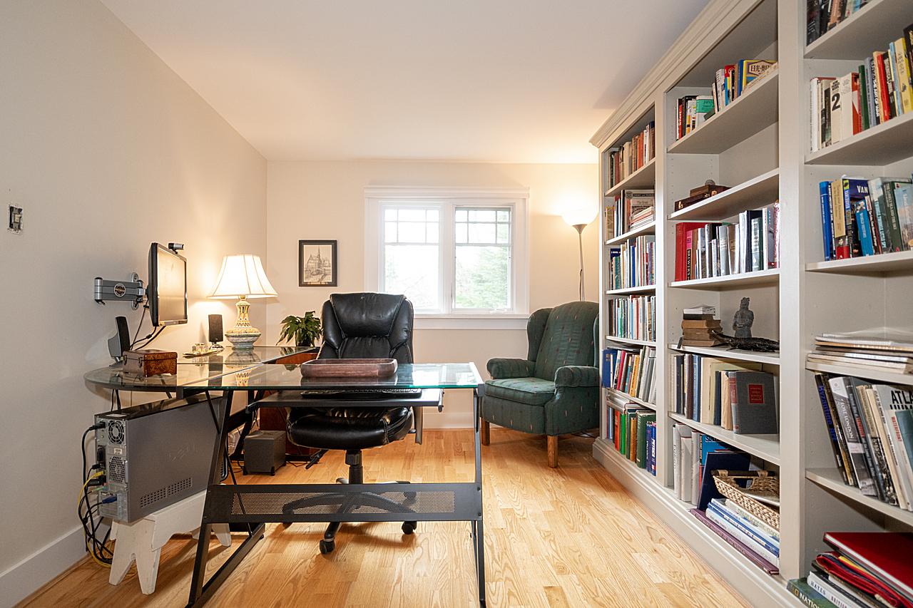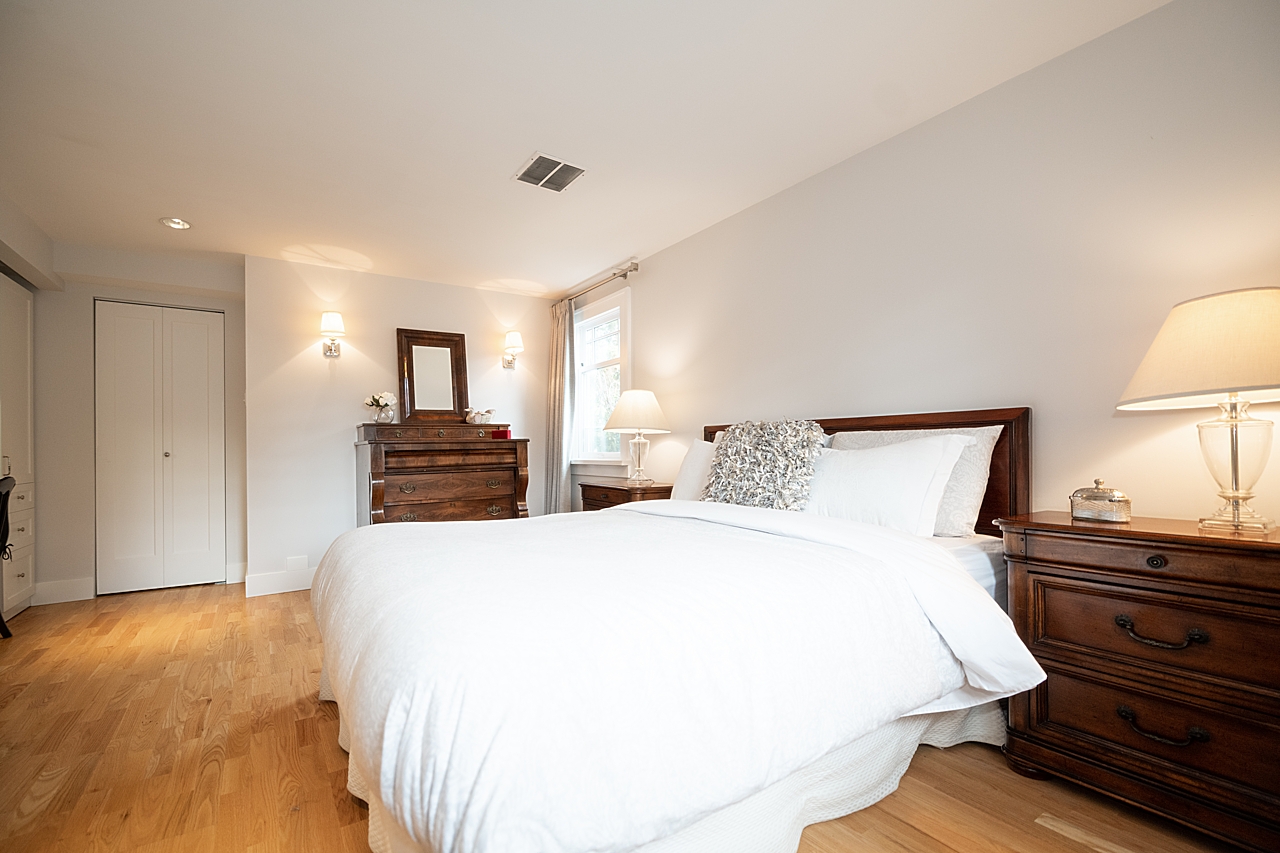 Primary bedroom on top floor with elegant black-out drapery, custom built-in storage and desk and updated ensuite bathroom