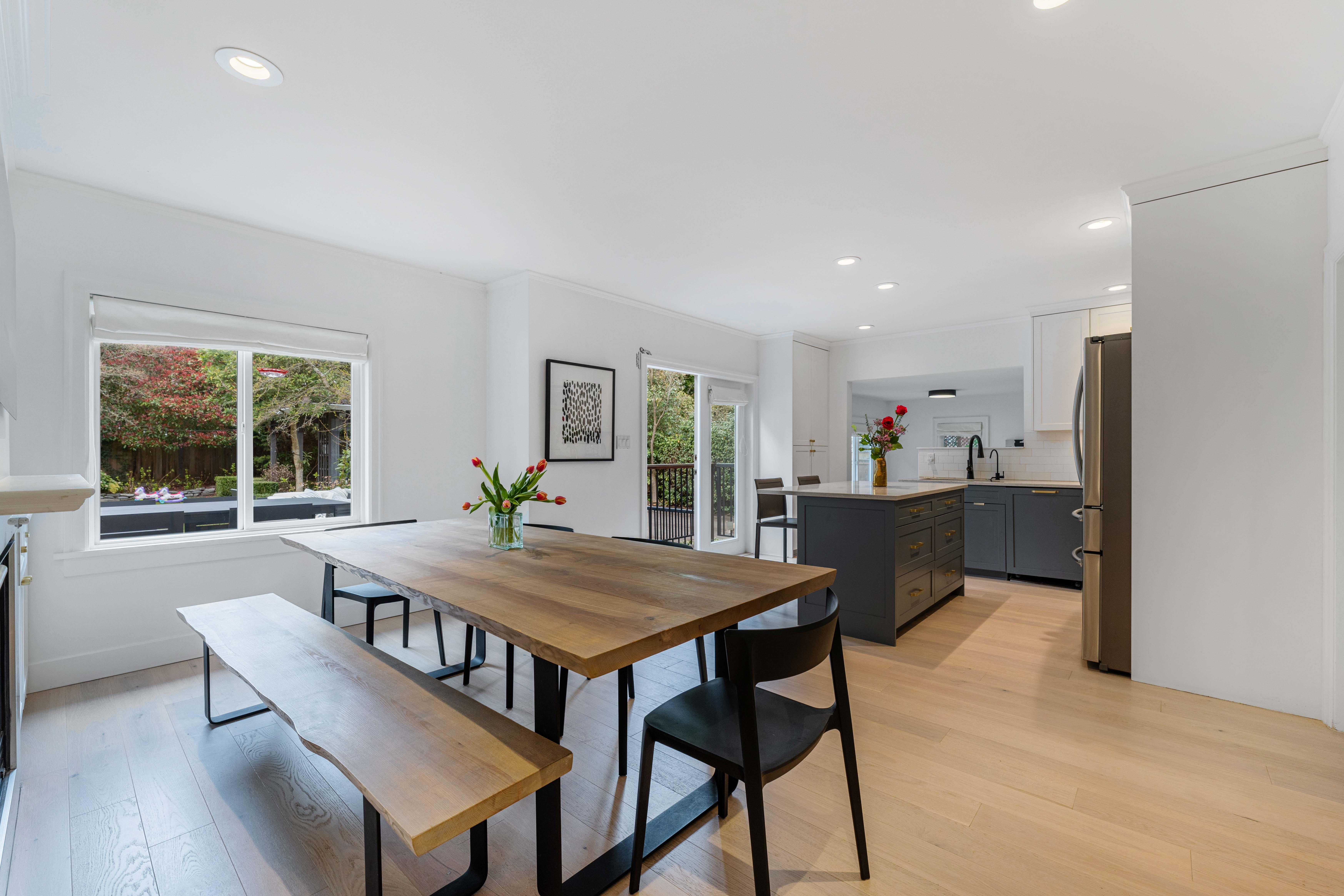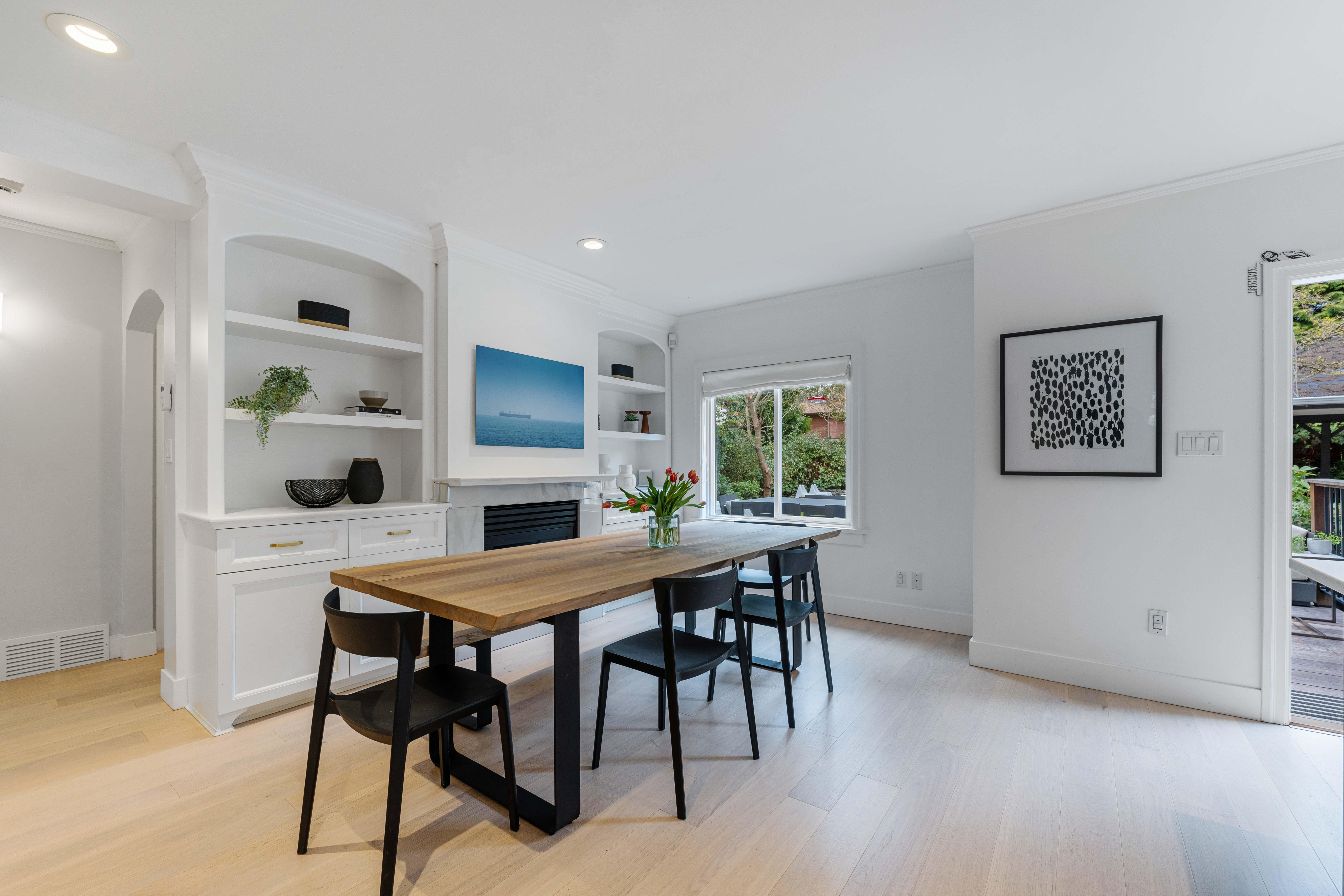 -Family-sized eating-area with fireplace and updated built-in shelving
