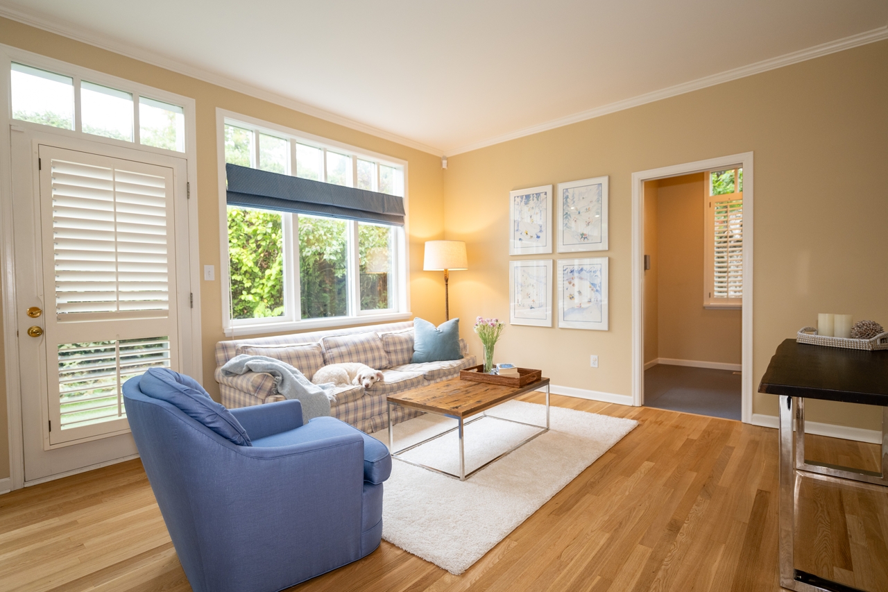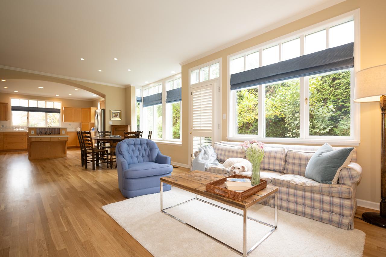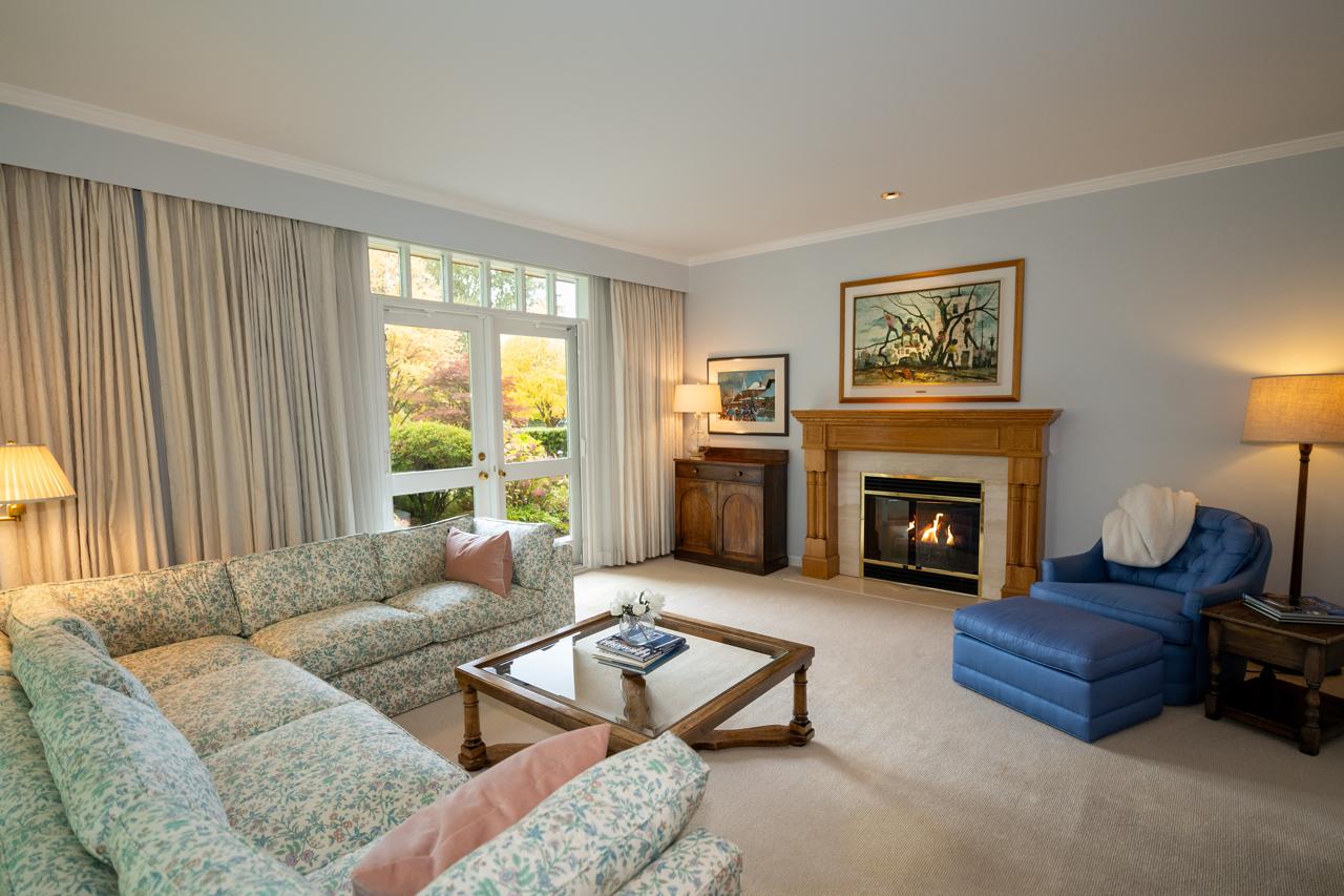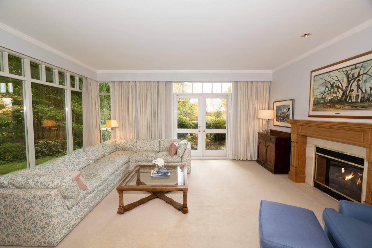 Sunlit living room with gas fireplace and French doors opening to the south facing park-view patio