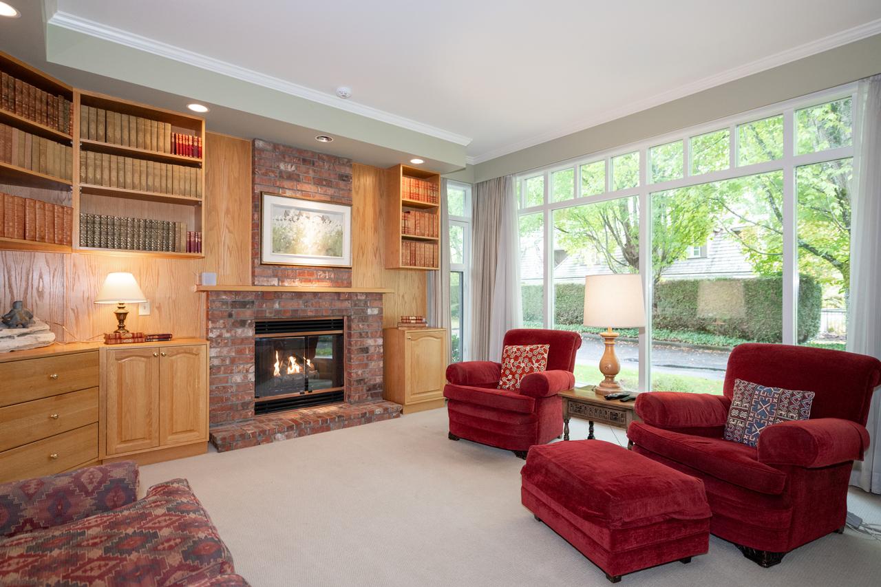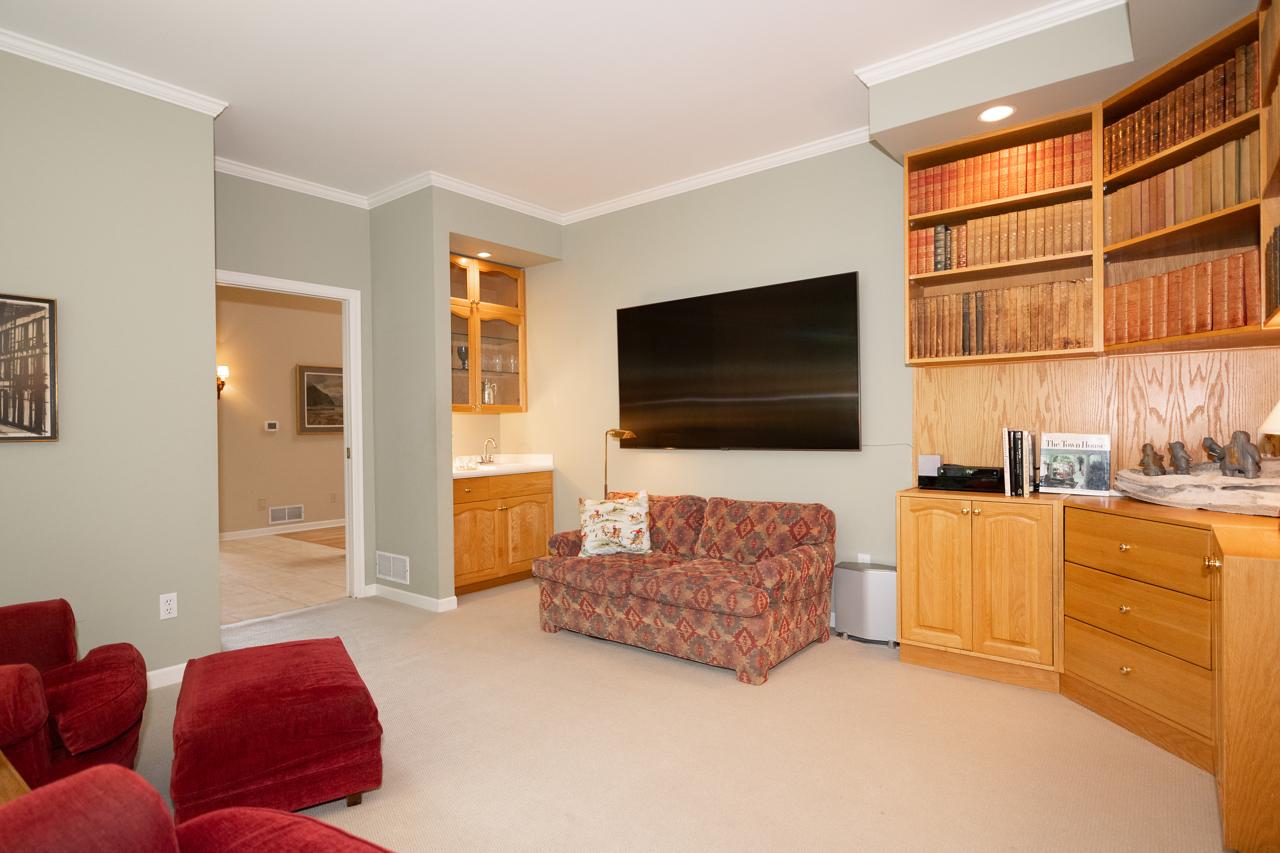Cozy den with gas fireplace, wet bar, and Oak shelving
