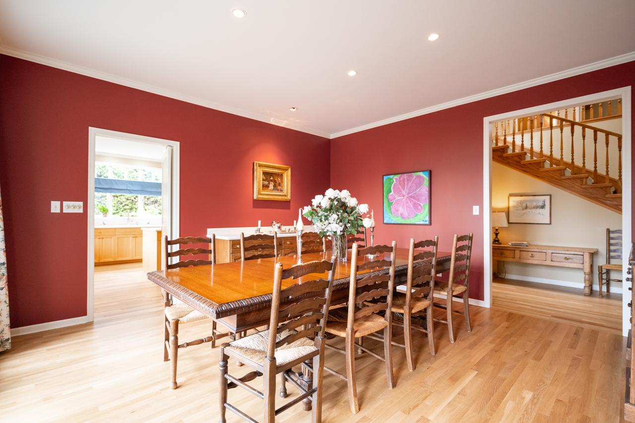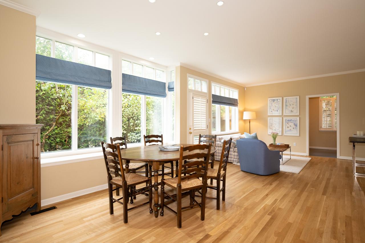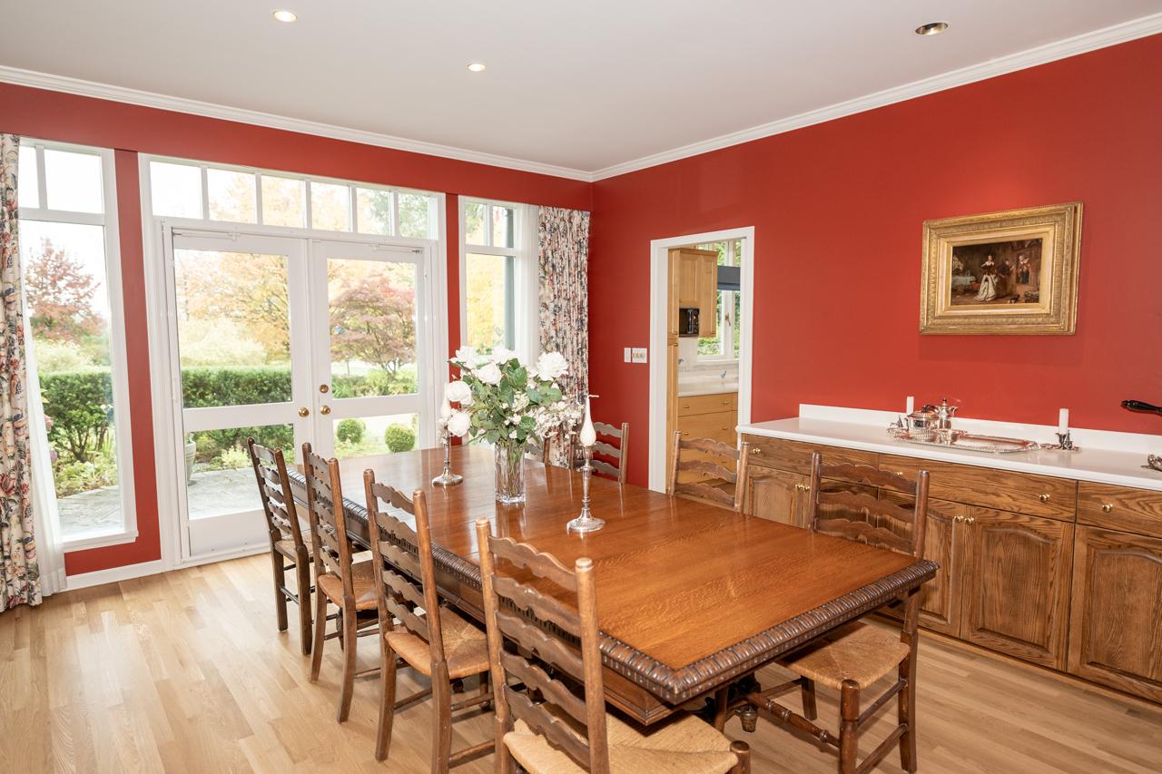 Elegant formal dining room with built-in sideboard and French doors to the park-view patio