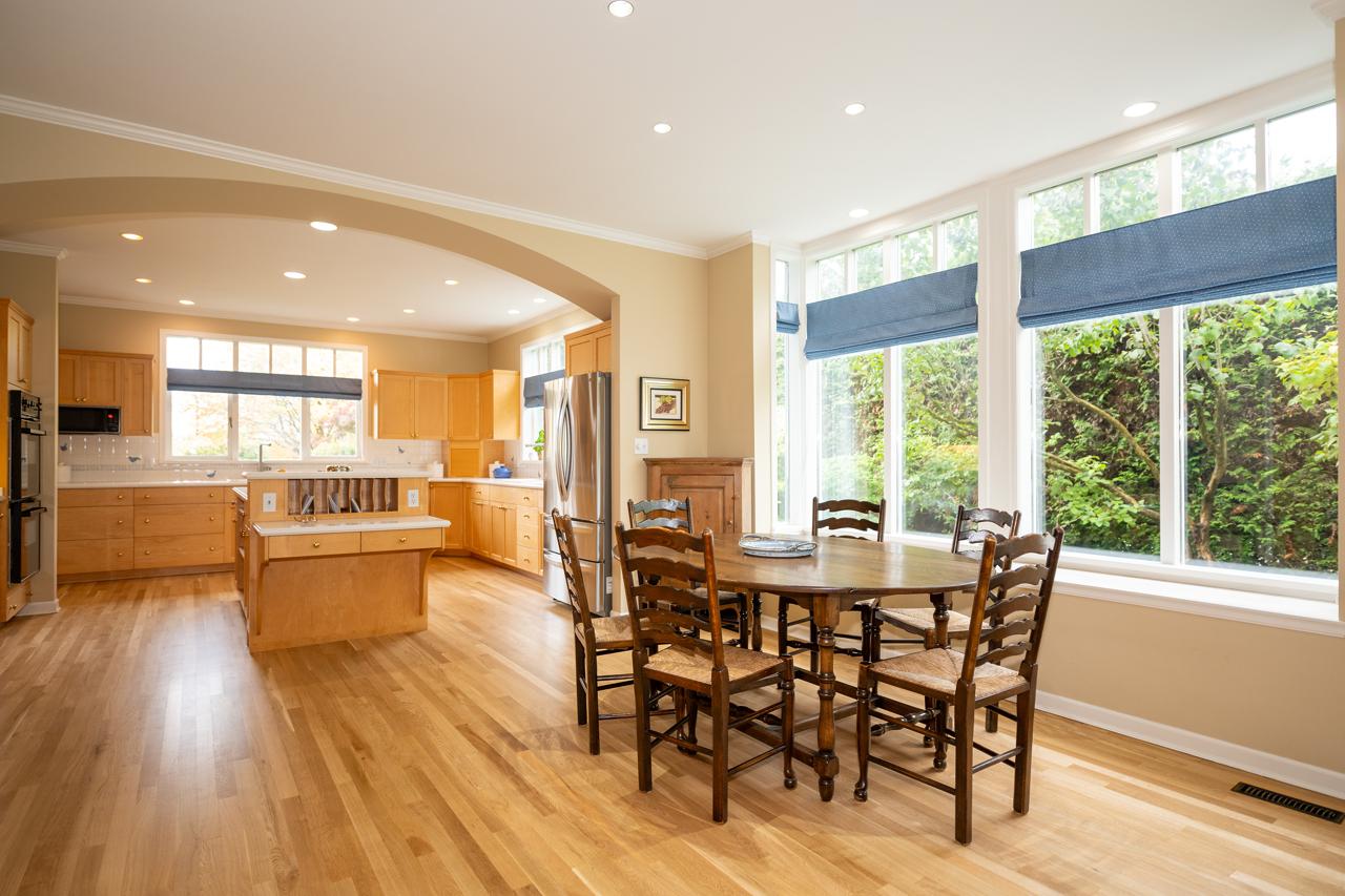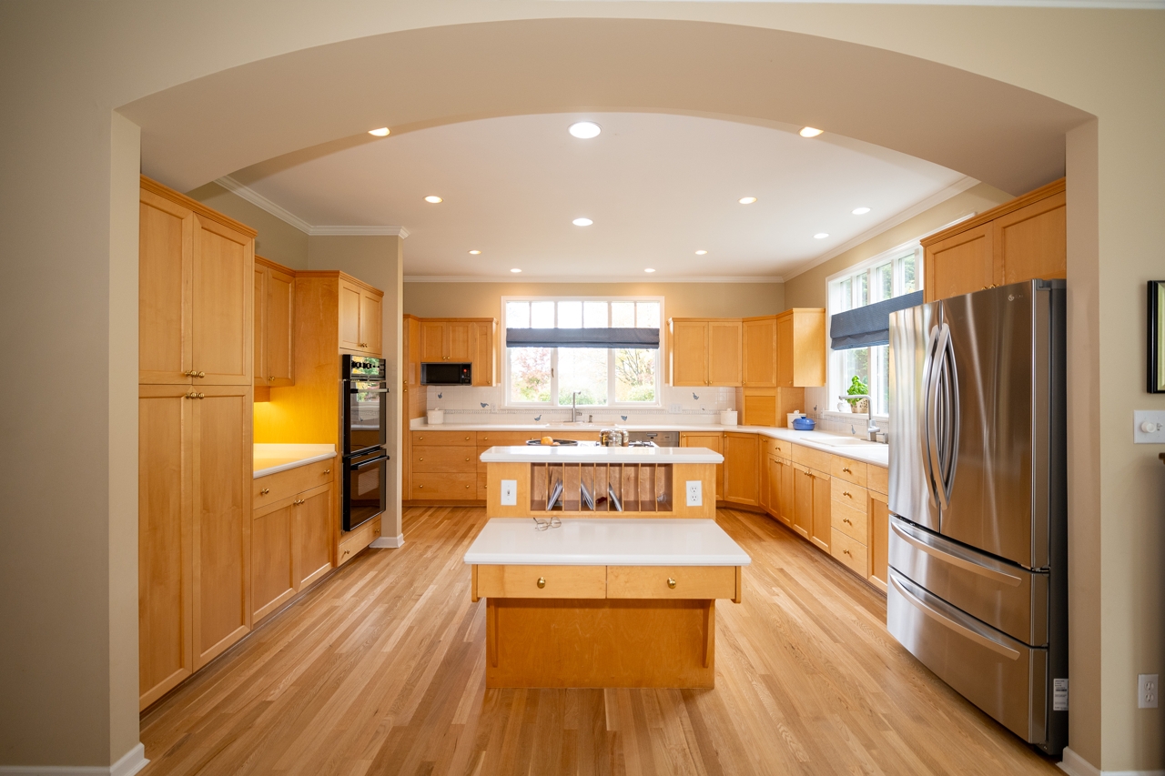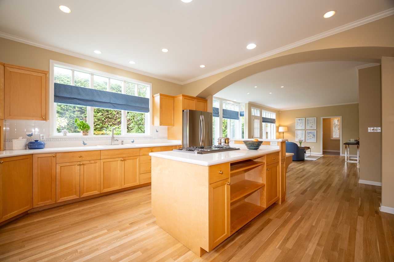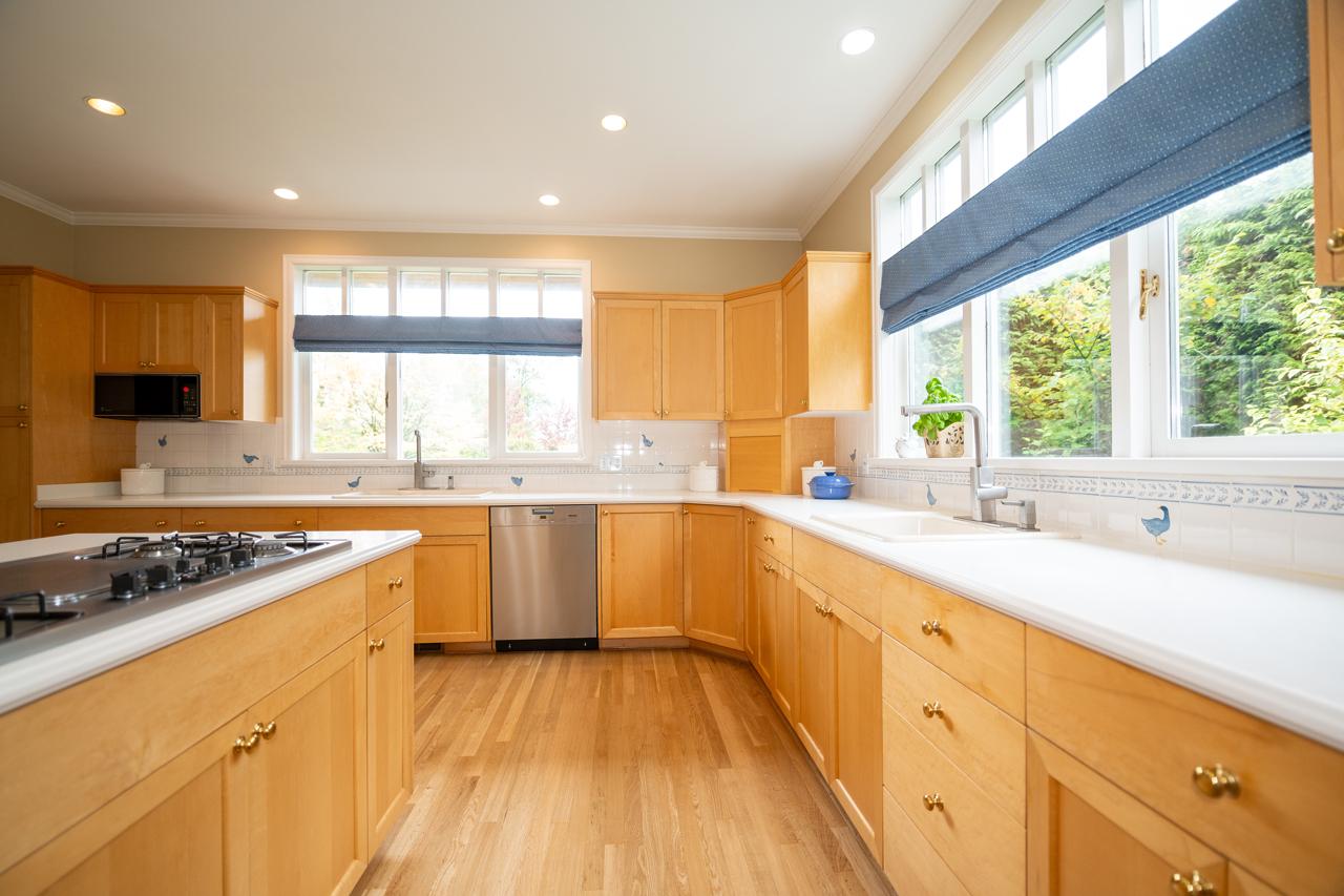 Family-size sunny and bright kitchen with loads of work space, 2 sinks, massive island with attached desk, oodles of storage and Fraser River Park views