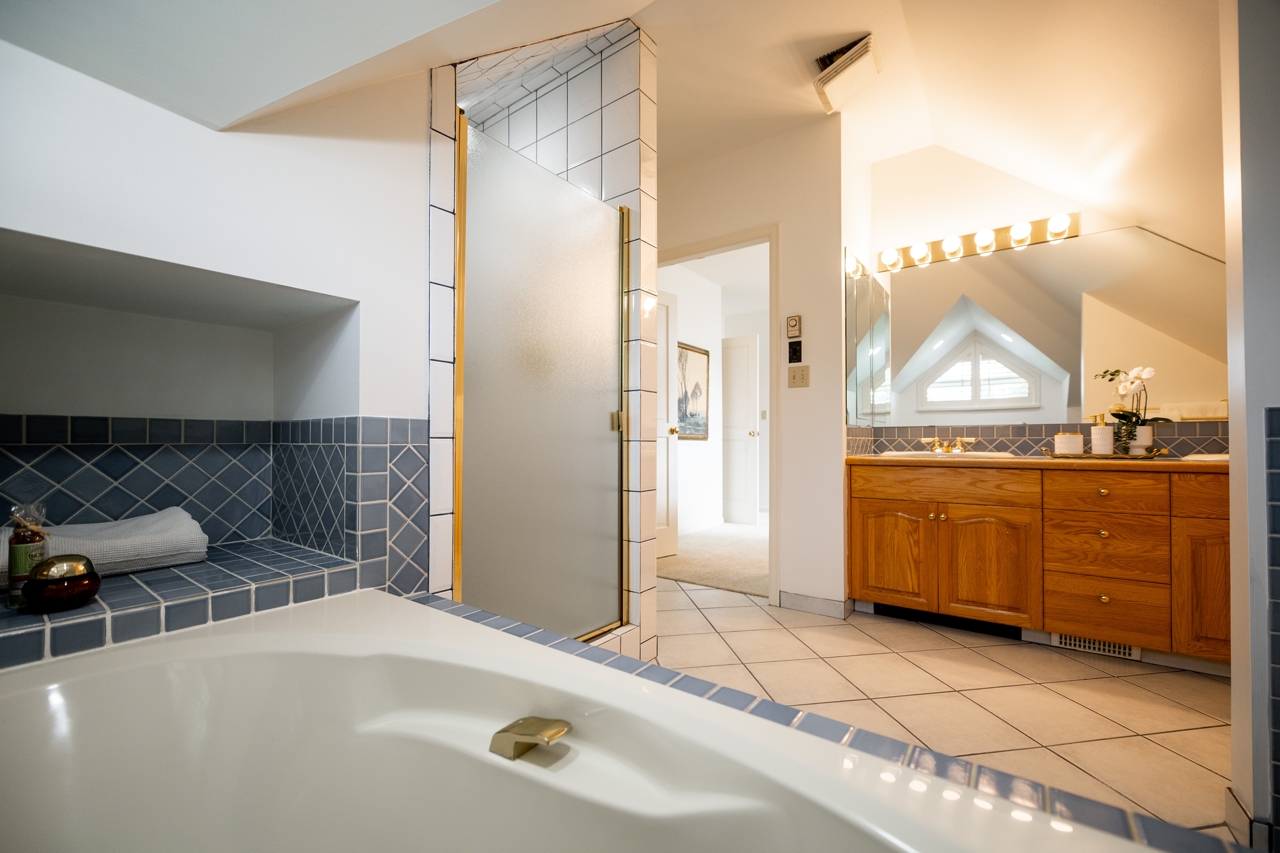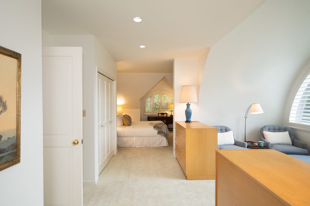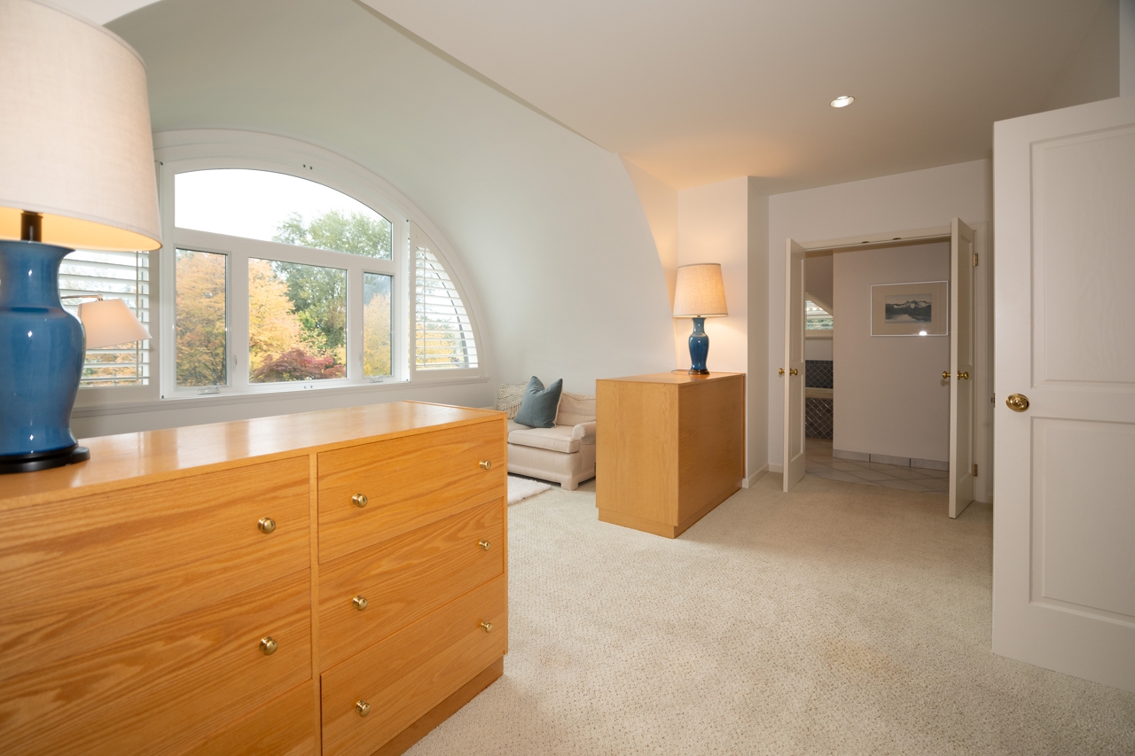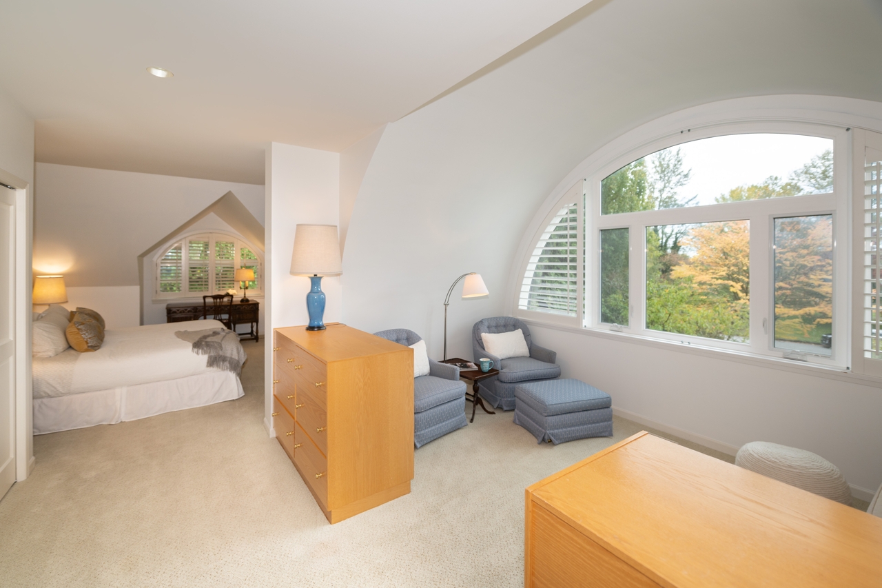 Super-spacious, privately set, primary suite with ensuite bath with soaker tub and separate shower, walk-in-closet, and lounge area with park and river views