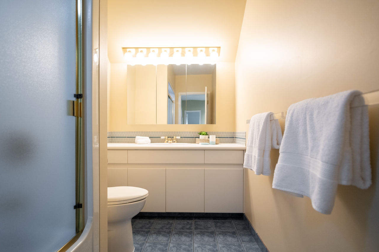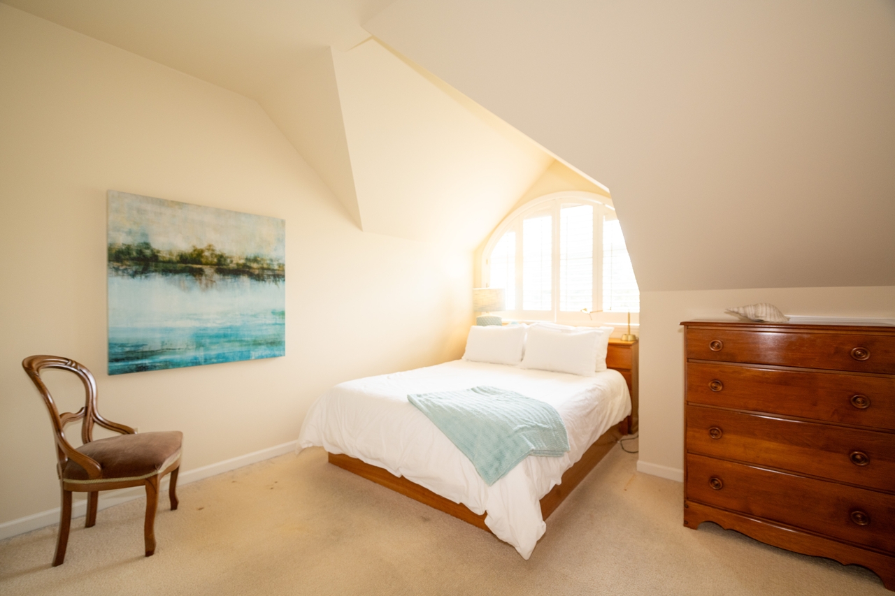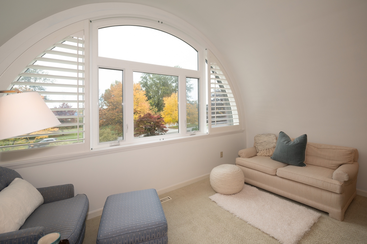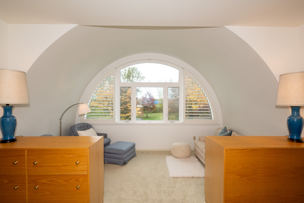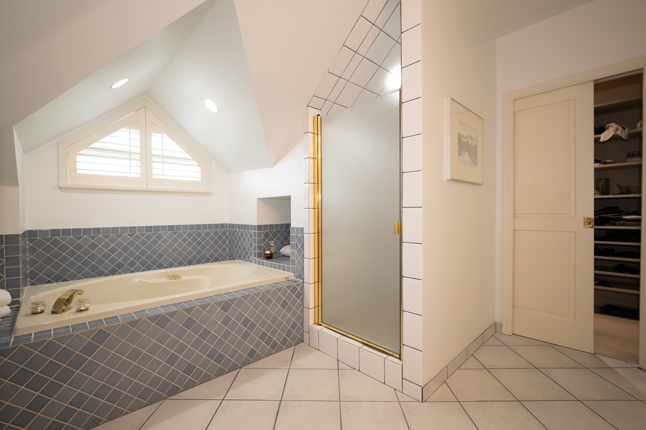 Super-spacious, privately set, primary suite with ensuite bath with soaker tub and separate shower, walk-in-closet, and lounge area with park and river views