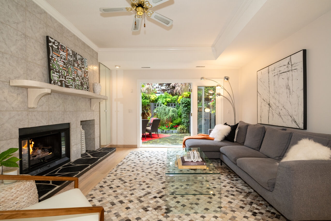 Extra-large 20' X 13' living room (room for grand piano!) features hardwood floors, gas fireplace and French doors opening to the enchanting sunny patio area - ideal for sunbathing and al fresco dining