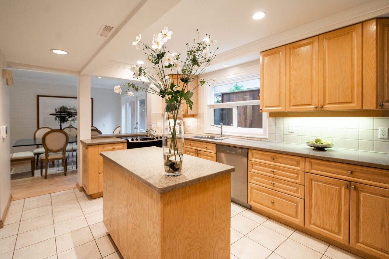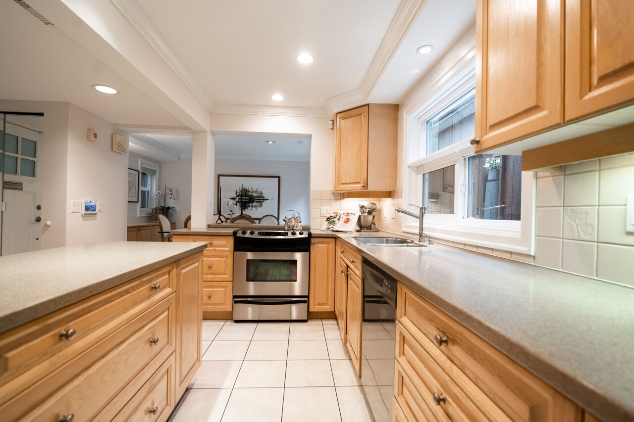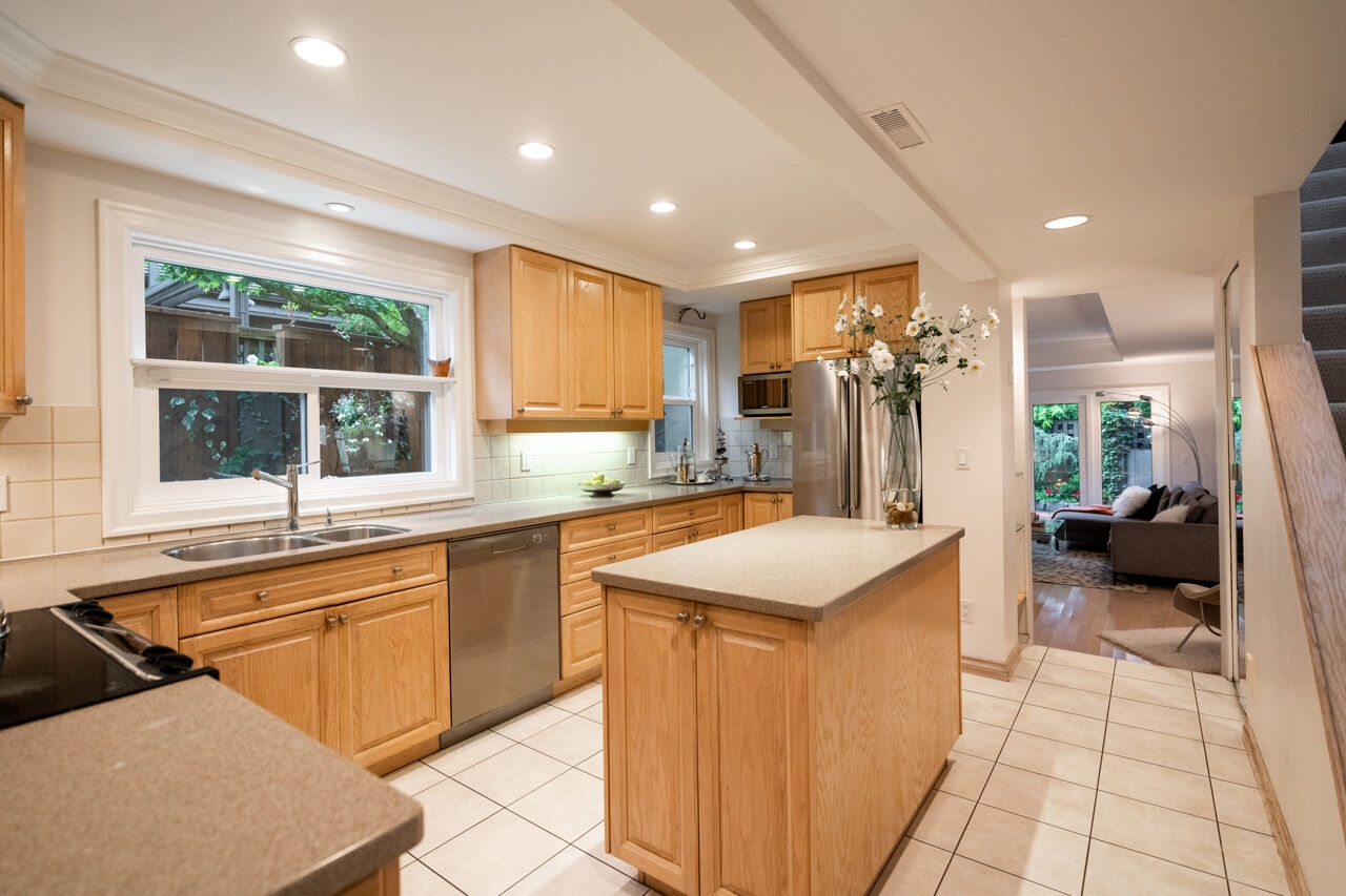 Spacious and functional well-equipped kitchen with garden view, bar seating, island, Stainless Steel appliances and plenty of counter space and storage