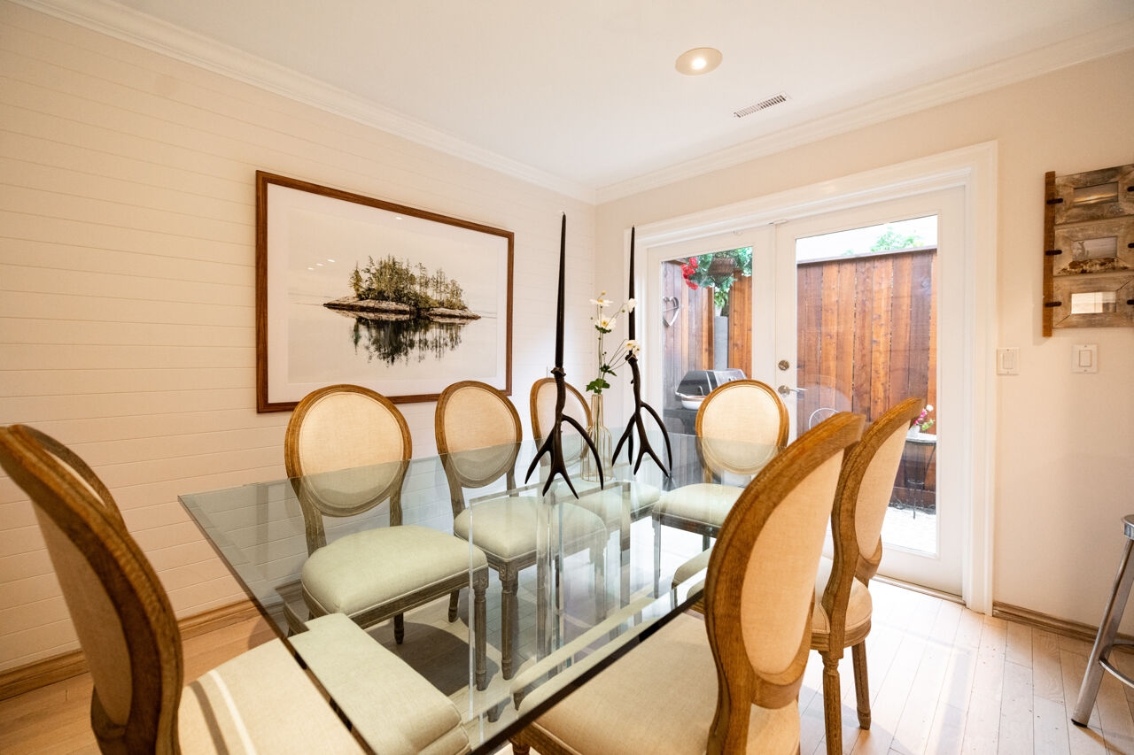 Family-size dining room with built-in storage and shiplap feature wall, and French doors opening to the intimate flagstone-paved side patio
