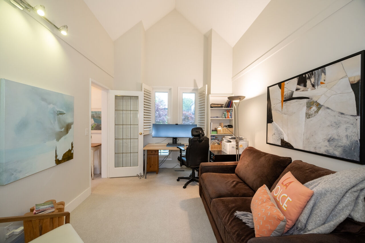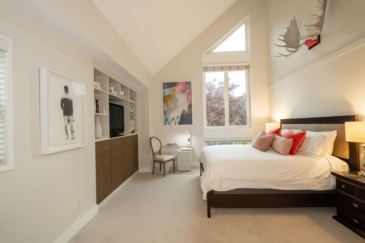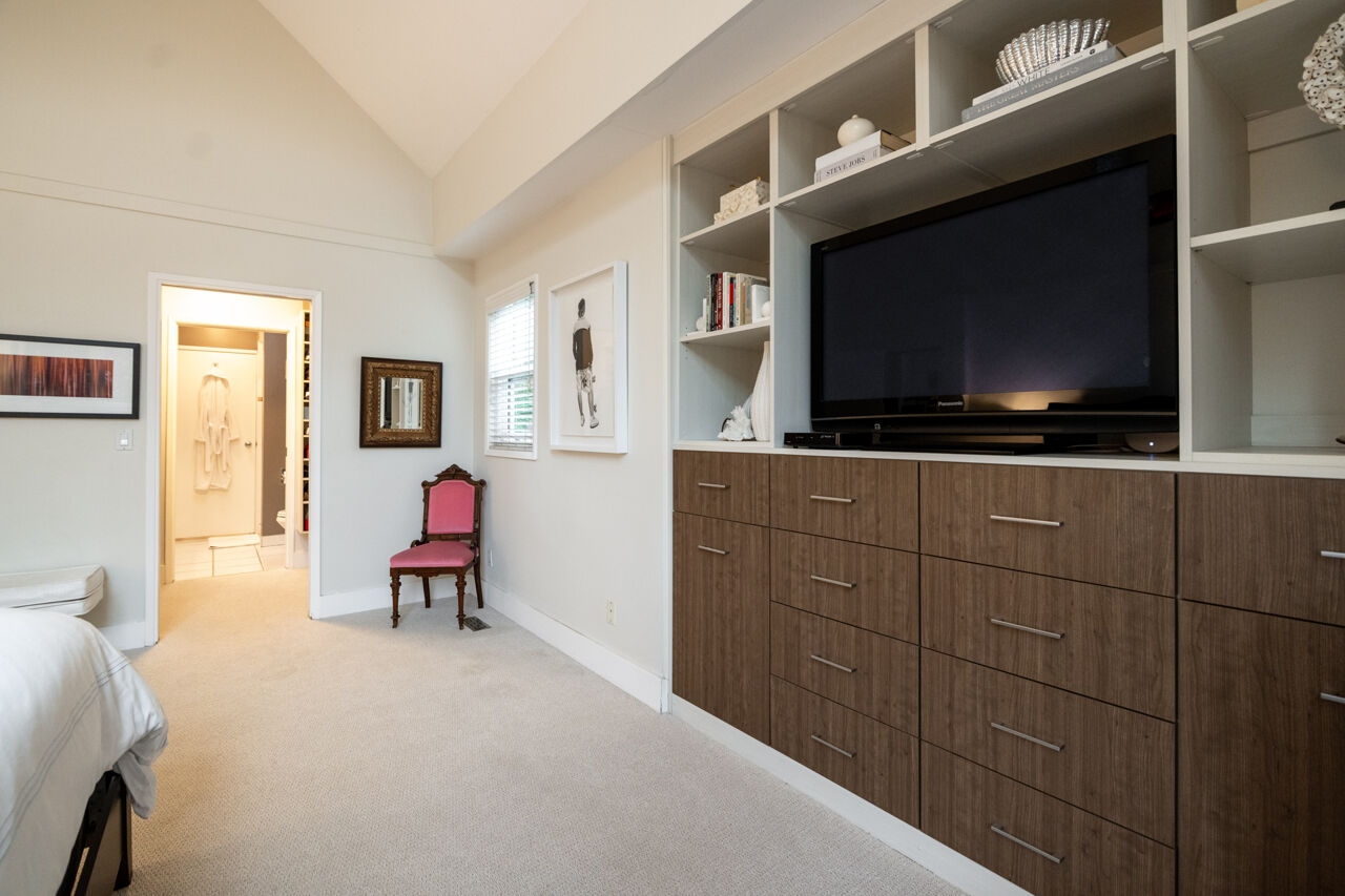 Massive 17' X 13' primary suite with soaring 20' vaulted ceiling, custom built-in shelving and storage, large over-height windows with wood blinds , his-and-hers closets and skylit 3-piece ensuite bathroom