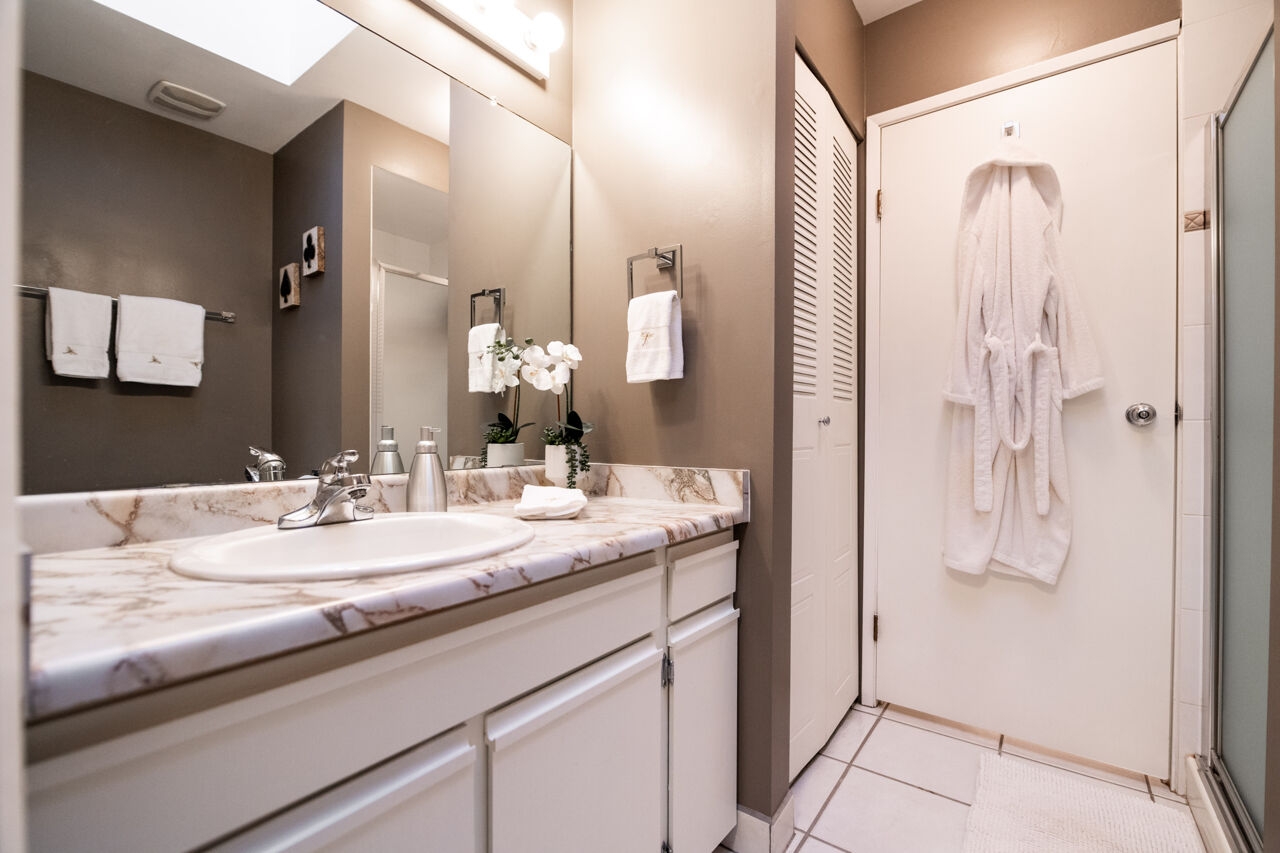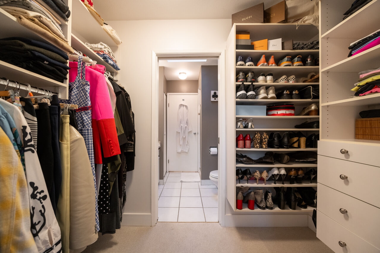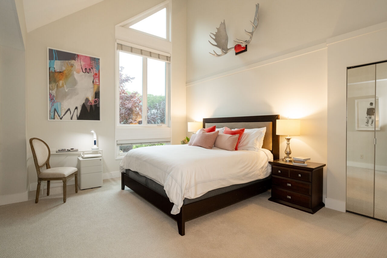 Massive 17' X 13' primary suite with soaring 20' vaulted ceiling, custom built-in shelving and storage, large over-height windows with wood blinds , his-and-hers closets and skylit 3-piece ensuite bathroom