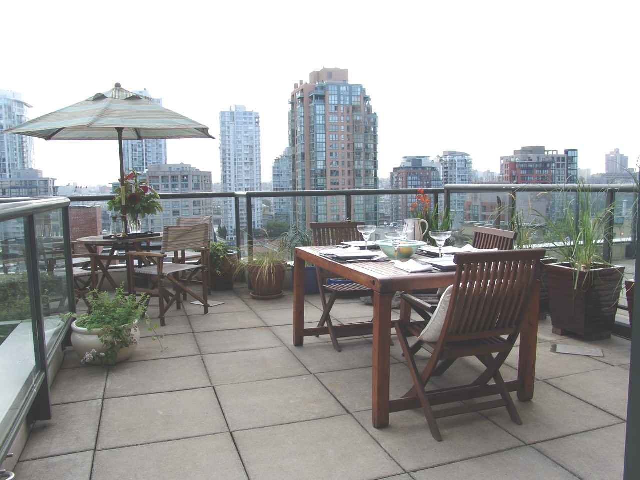 HUGE DECK IN THE HEART OF YALETOWN! Rarely available 2 bedroom and den, 2 bath condo with party size view deck, located in central Yaletown. This bright corner unit offers peek-a-boo water views to False Creek and expansive city-scape views over the rooftops of heritage Yaletown. The open-plan layout provides good separation between bedrooms. Interior features include French doors that open to the den/office, hardwood floors, sheerweave roller blinds and a spacious entrance hall. This unit has a storage locker and comes with one parking stall (rental of additional spot available). Built in 1994, CityCrest is a well maintained building offering a fitness centre and a large banquet room with patio. Rentals and pet are permitted. Enjoy the urban scene in this funky downtown neighbourhood, close to local coffee houses, trendy boutiques, high-end restaurents, and the False Creek seawall.