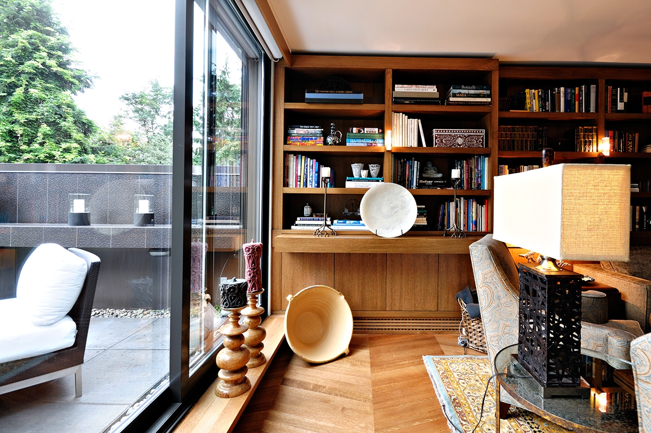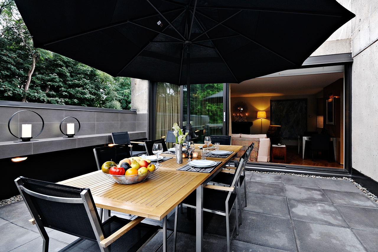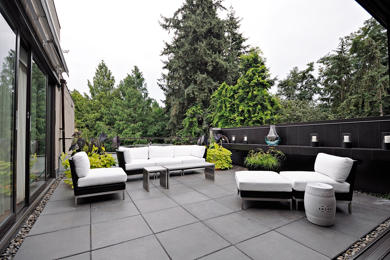 Sliding doors open to large lounging terrace with view to Van Dusen Gardens