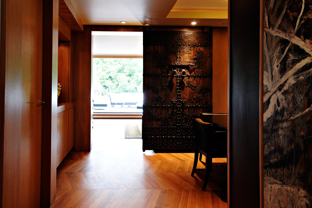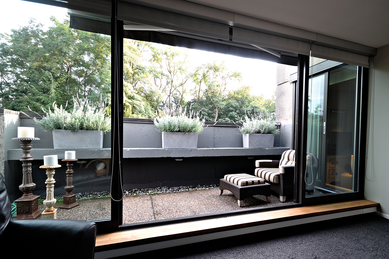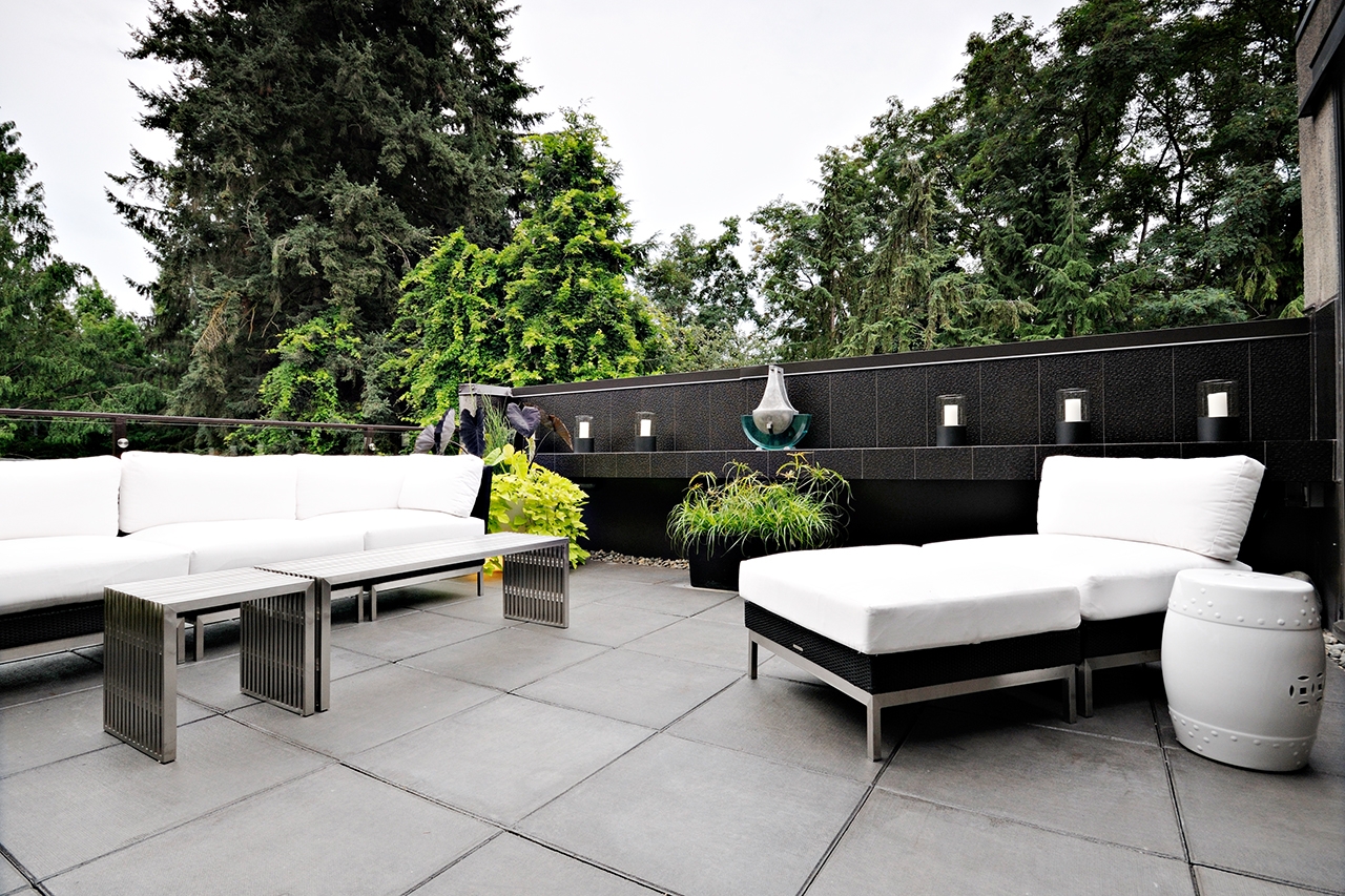 Sliding doors open to large lounging terrace with view to Van Dusen Gardens