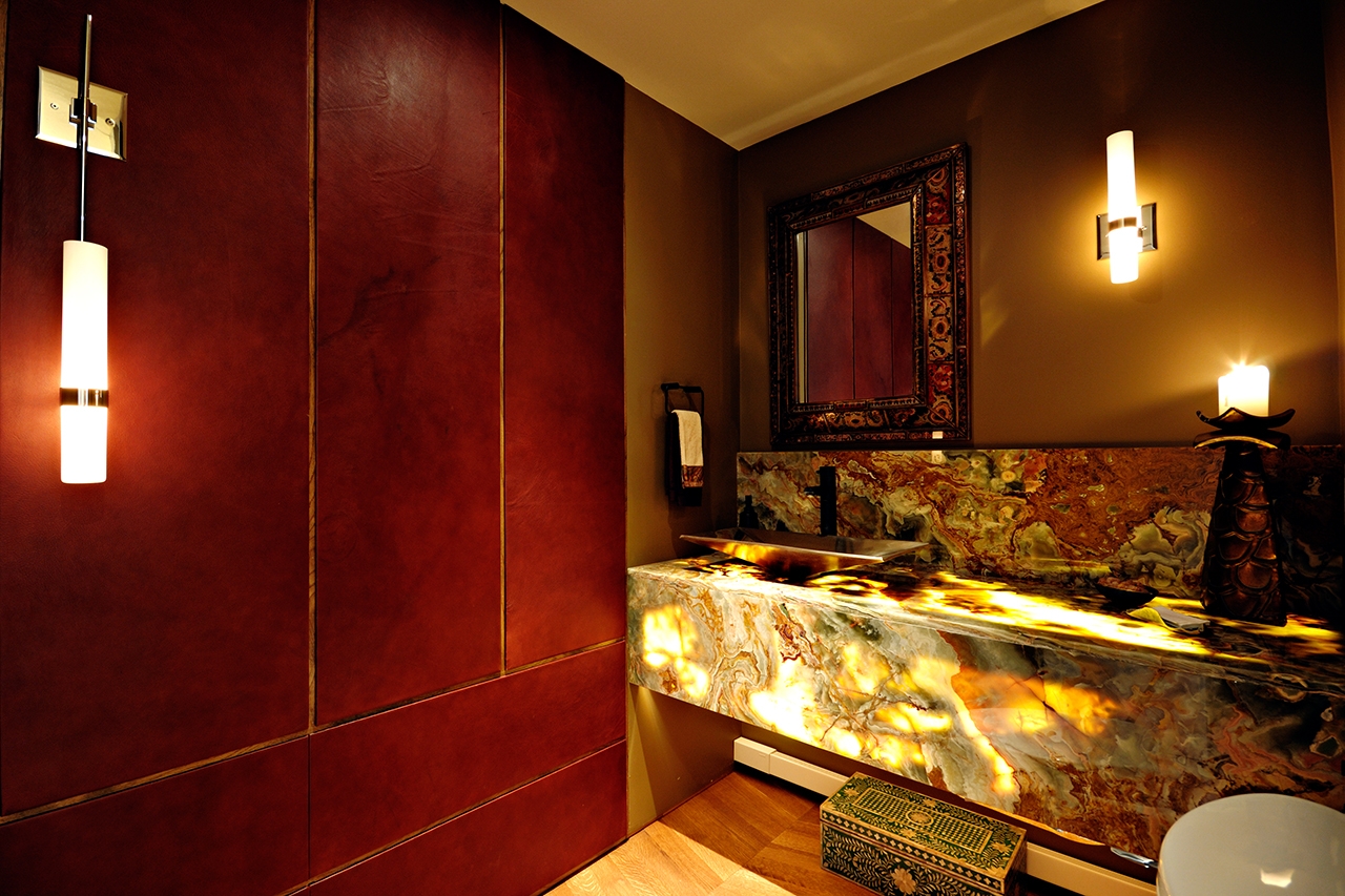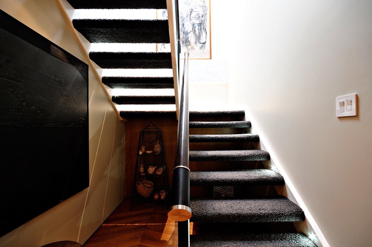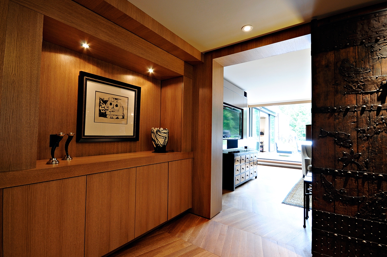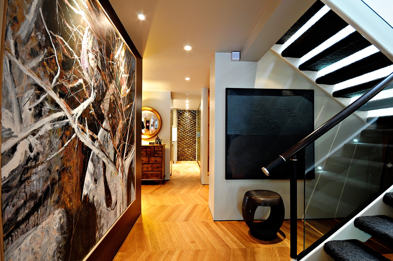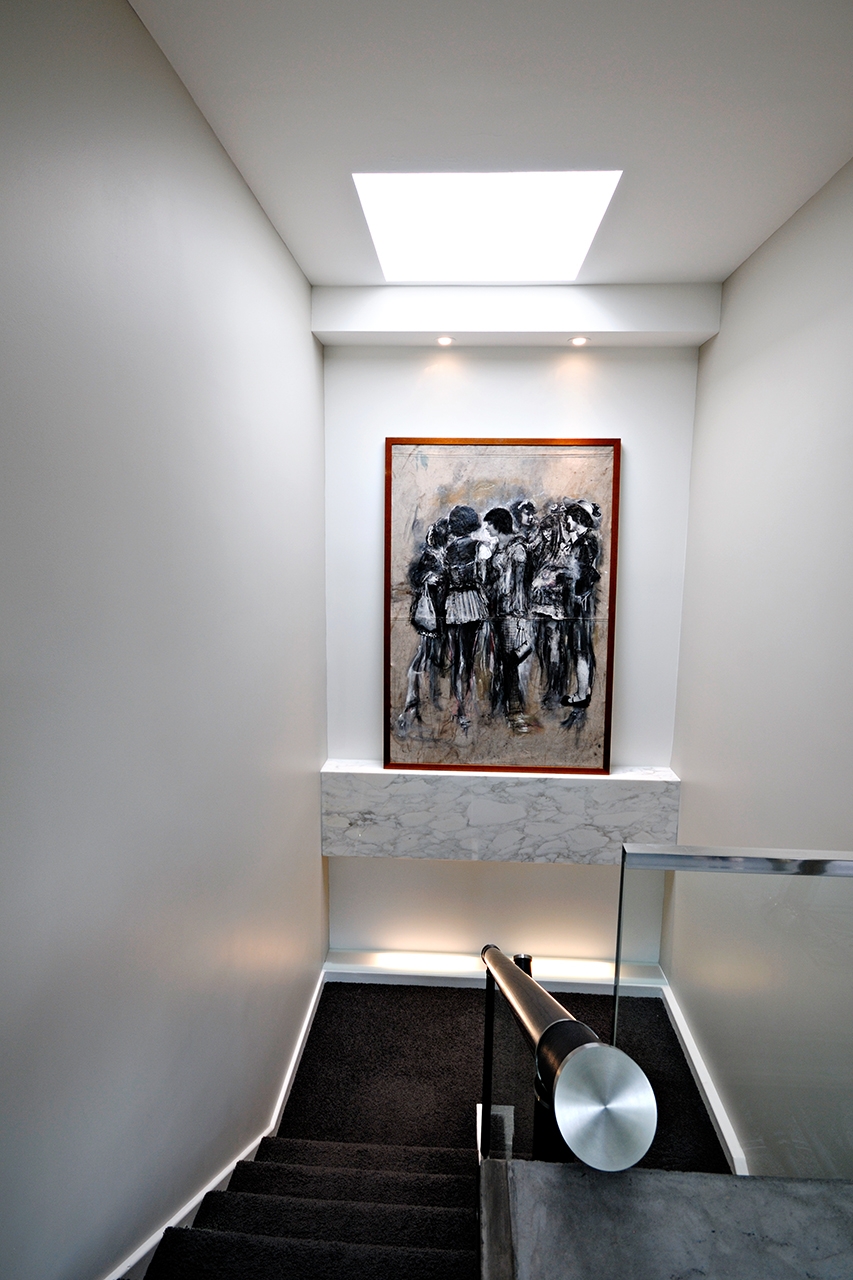 Skylit landing (new skylight) with marble clad beam ideal for art display