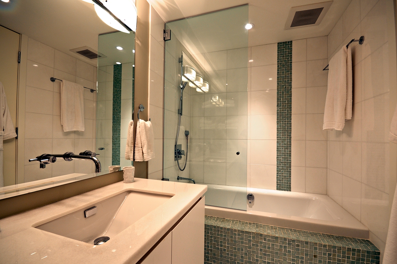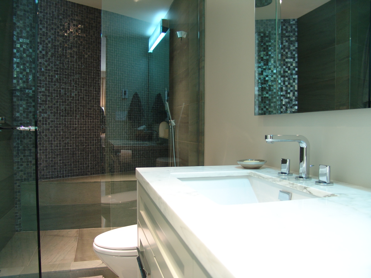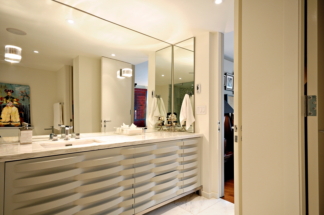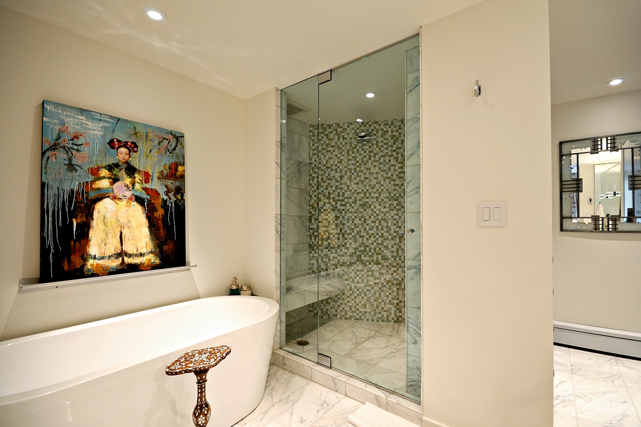 Master bath #2 features unique custom cabinet with slab marble countertop, separate make-up table, glass tile shower with Grohe Freehander dual showerhead and freestanding tub. This bathroom also has extensive drawers and two floor-to-ceiling storage cabinets. A small television is located inside the medicine cabinet.