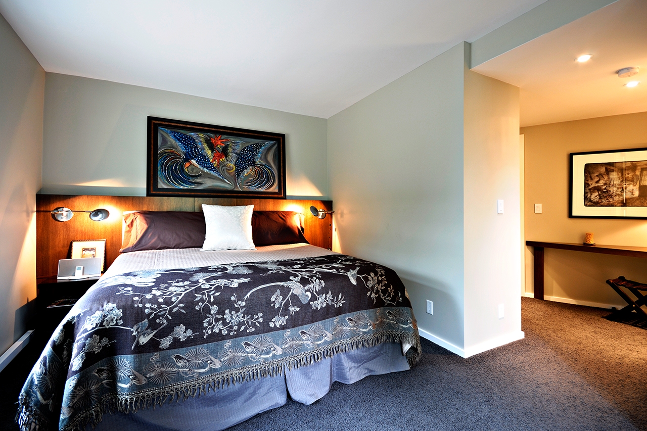Generous guest bedroom with custom headboard and built-in desk in separate dressing area with large closet