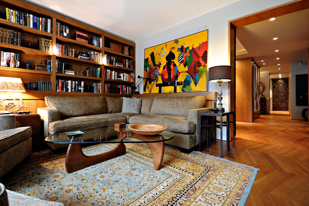 Custom white oak library shelves with accent lighting, pull-out shelf for display and storage cabinets below