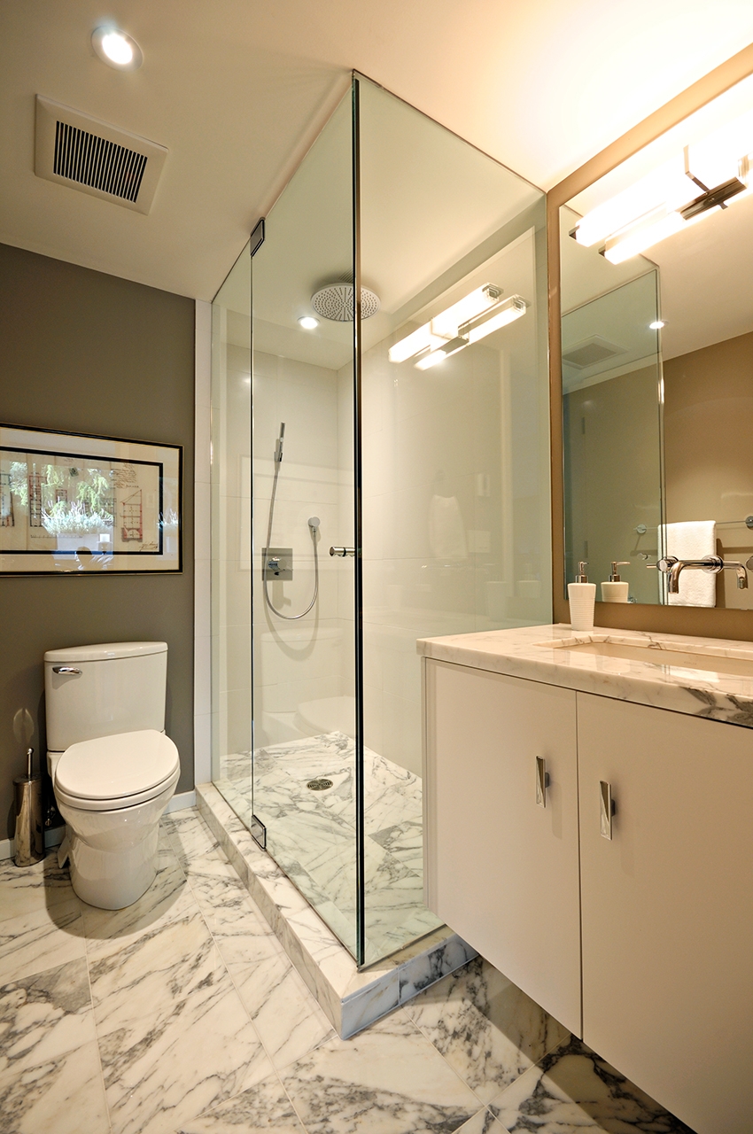 Second bedroom (currently used as office) with sliding doors to upstairs deck with views to Van Dusen Gardens,ensuite bath with marble floors and countertops and large shower with rain shower.