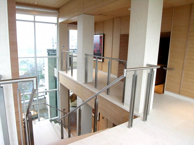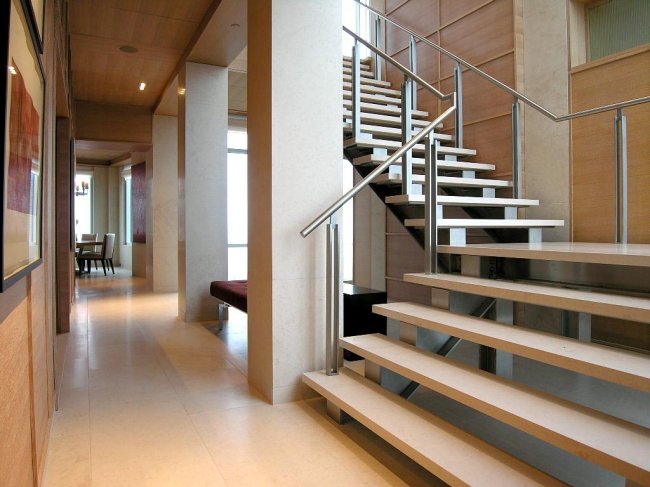 · Custom built floating stainless steel staircase with limestone stair treads.
