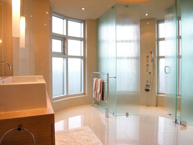 · Custom art glass shower enclosure in Master Ensuite with heated towel bar.