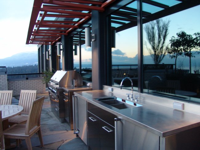 · Viking Stainless Steel Outdoor Kitchen complete with cabinetry, built in barbeque, Kohler outdoor sink and undercounter Sub Zero Refrigerator on Main Exterior Deck.