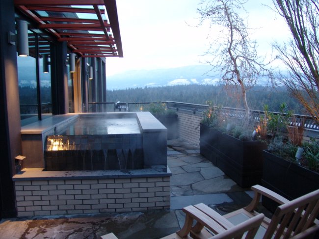 · Outdoor hot tub with Fiberstar fiber optic lighting beneath perimeter pool, coping edge and sheer descent waterfall.