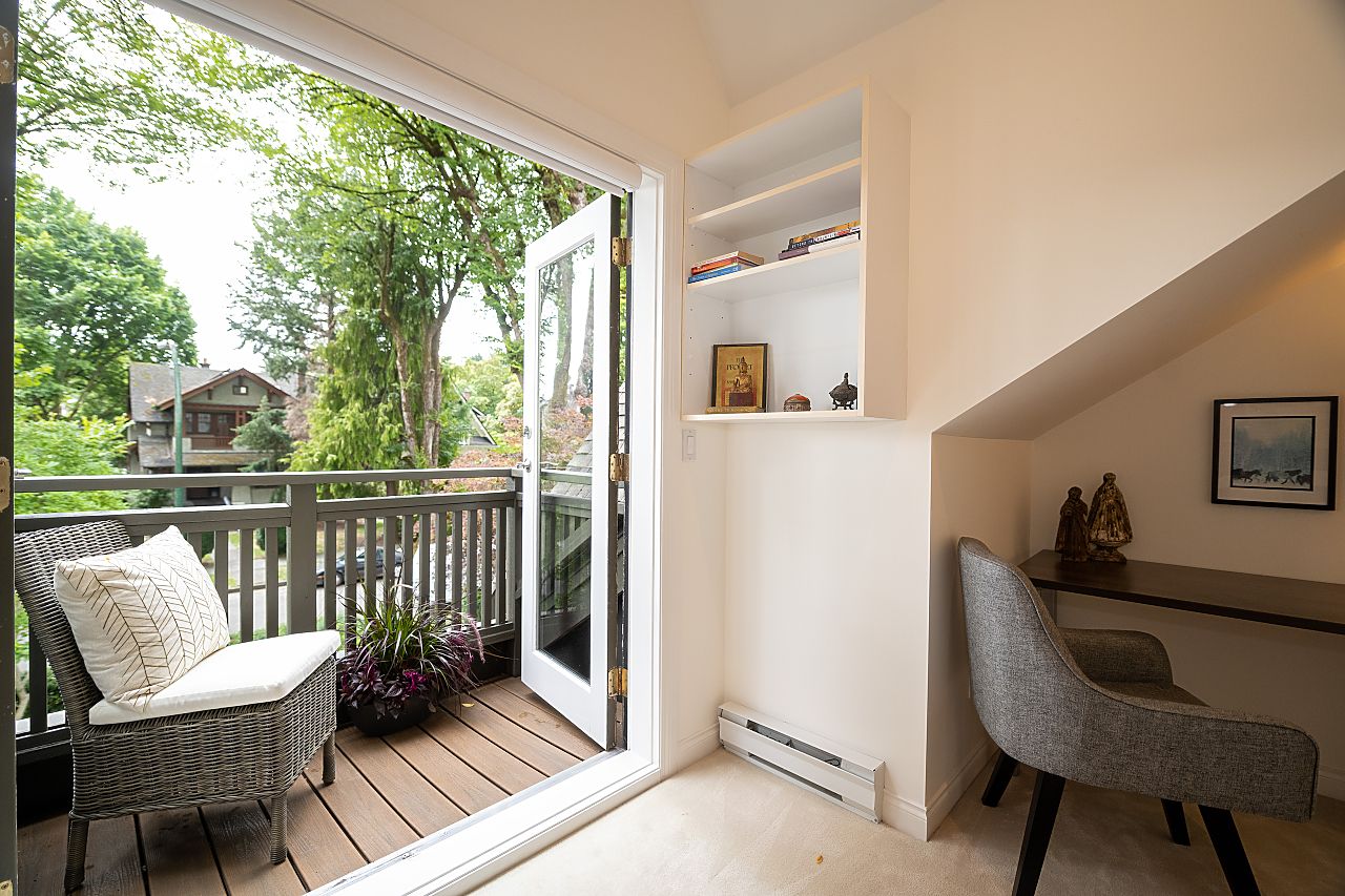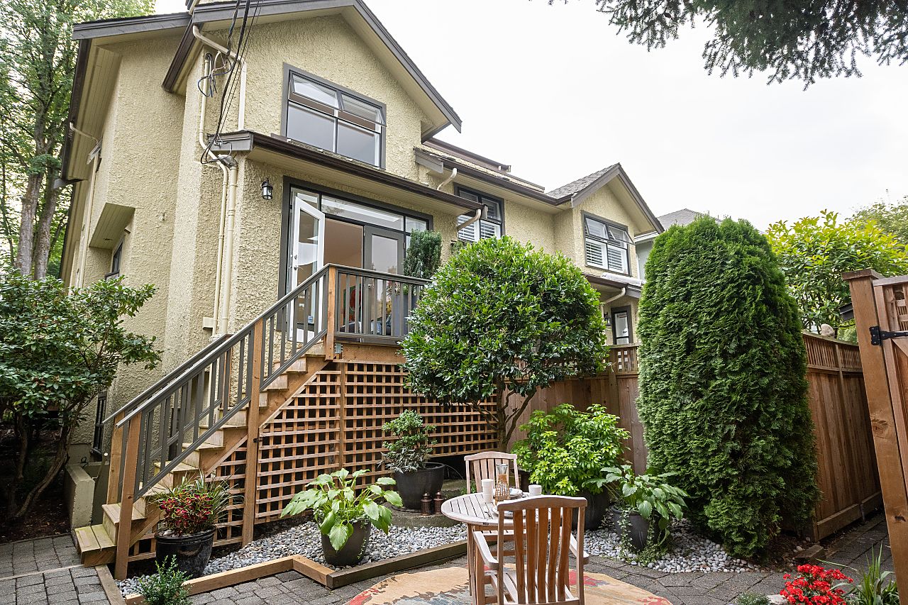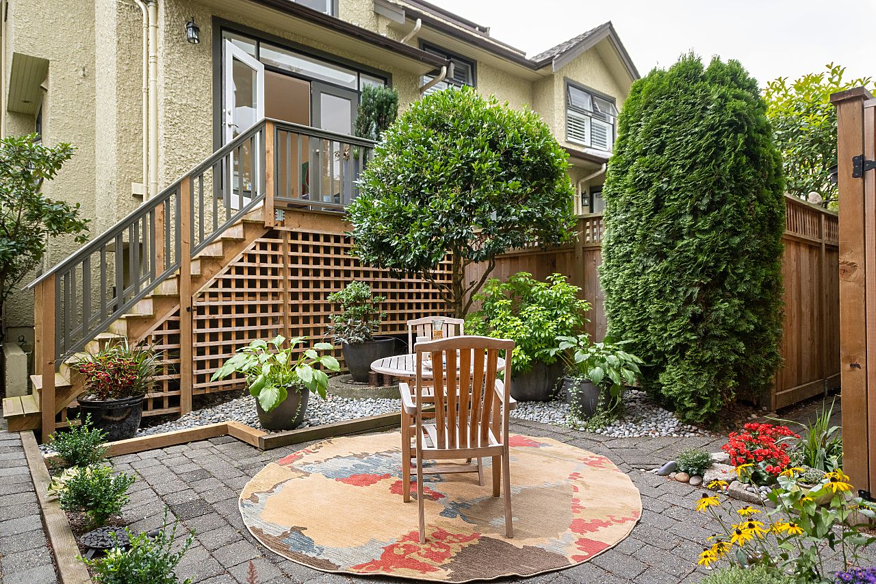 Beautifully updated 2-level townhome in meticulously maintained 4-plex set on lovely tree-lined street in coveted Lower Shaughnessy. Light-filled north, east and south exposure, and fabulous floorplan with spacious HOUSE-SIZE ROOMS. Generous outdoor spaces include large landscaped fenced patio and French doors opening to 2 balconies. Features include impressive dining room with soaring 2-story vaulted ceiling, updated kitchen with adjacent family room and cozy gas FP, king-size master bedroom with walk-in-closet and ensuite bathroom, and large 2nd bedroom. HUGE STORAGE ROOM, and private 1- car garage. Within minutes of Arbutus and South Granville shops and services and a short walk to Vancouver Lawn & Tennis Club. Shaughnessy Elementary and Kitsilano Secondary Schools. Pets and rentals OK.