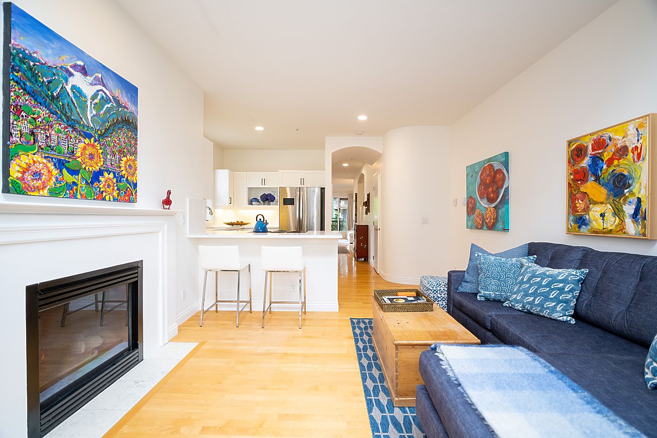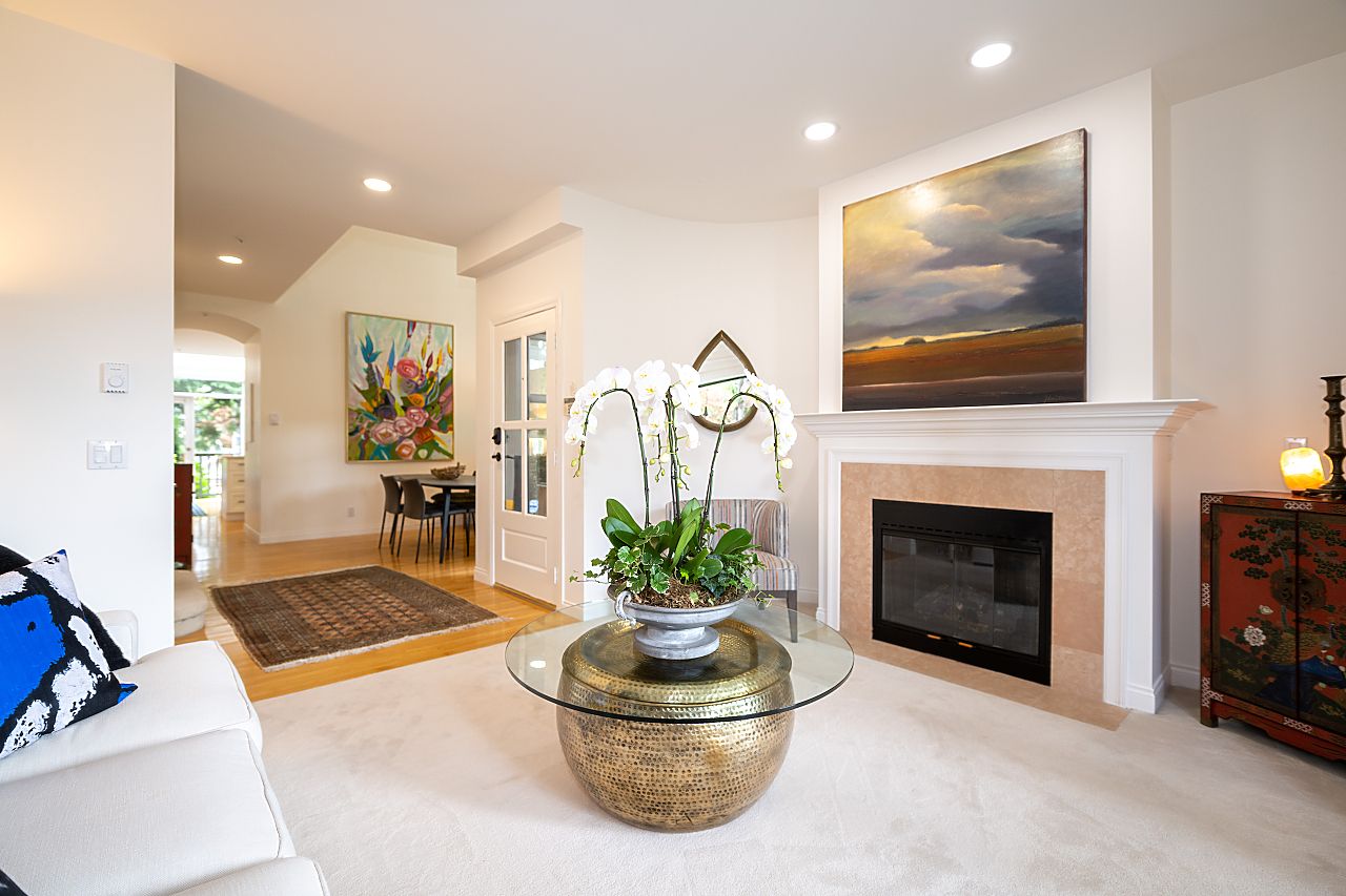 - Gracious living room with gas fireplace opens via French doors to Juliette balcony
