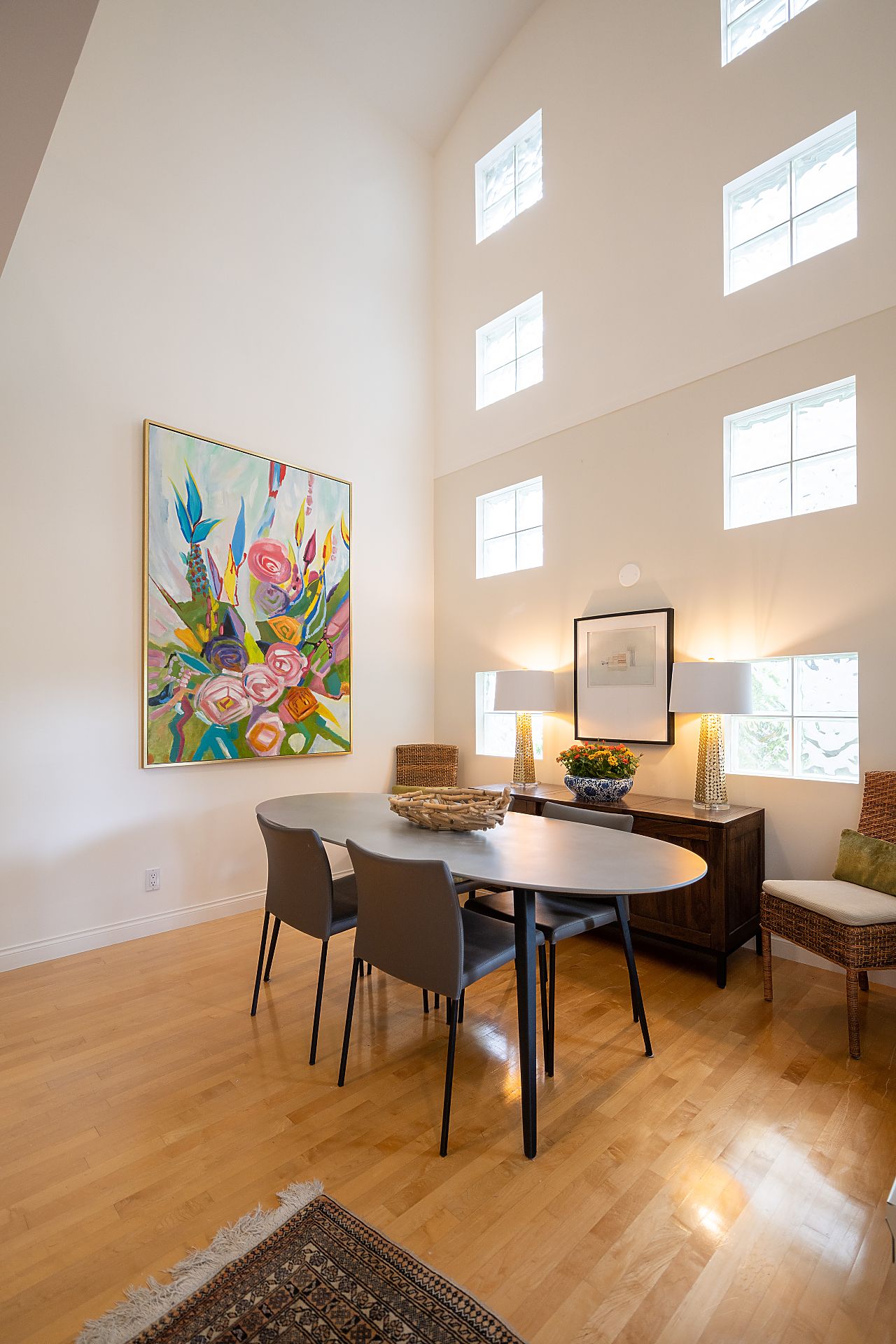 - Spectacular dining room with dramatic soaring two-storey arched ceiling and wall of inset glass-block windows