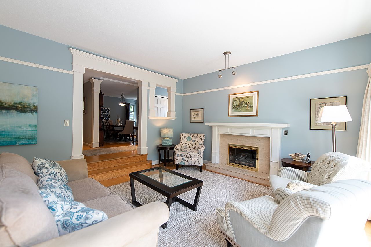 - Elegant spacious living room with cozy gas fireplace opens to large wrap-around south-facing patio