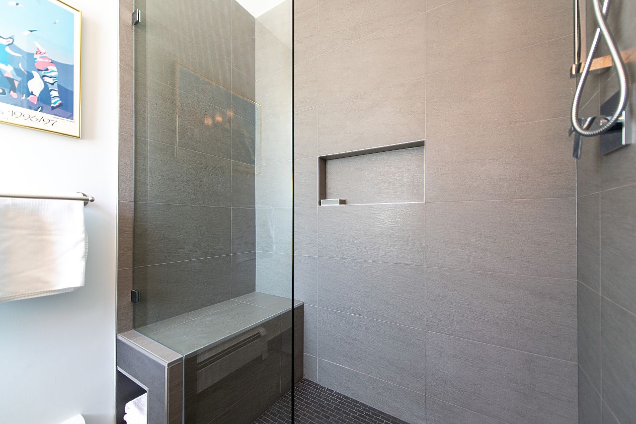 - NEW seamless glass bath/shower enclosure in upstairs bathroom