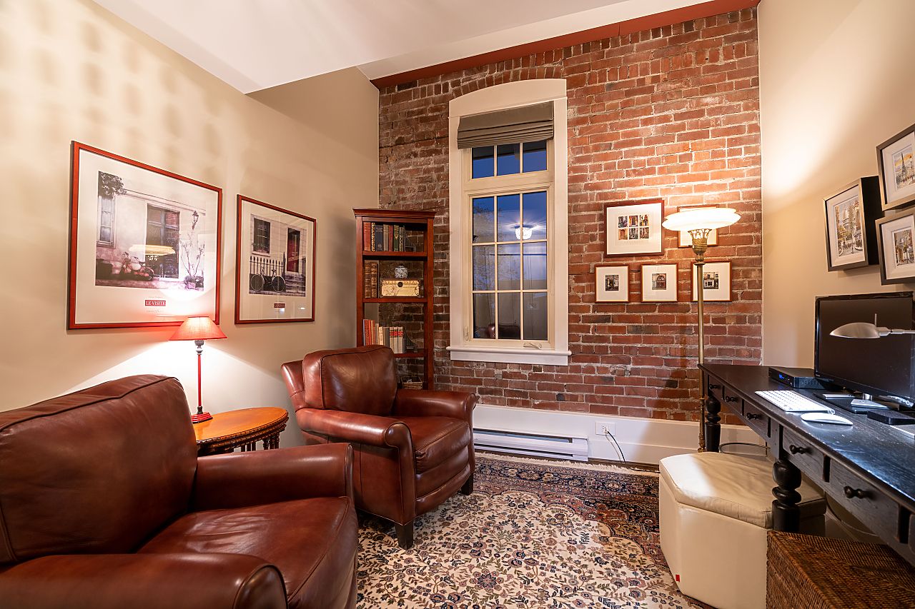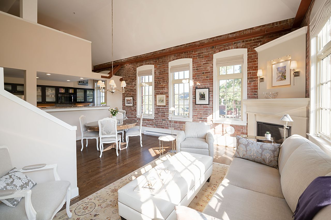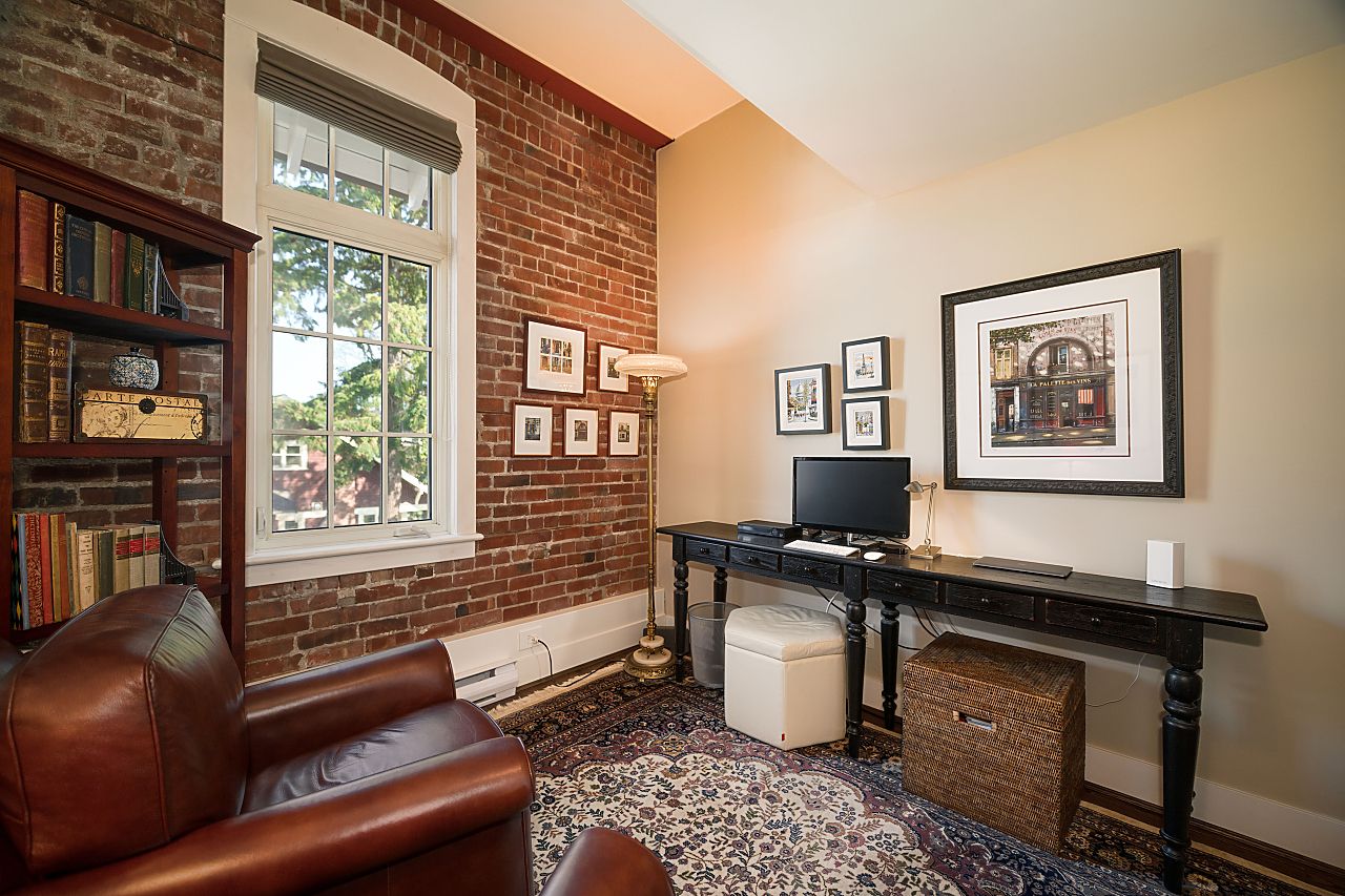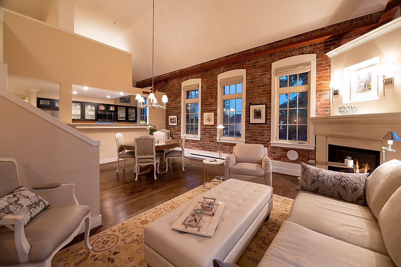 - Soaring 16’ ceilings and fabulous character features including exposed brick walls and steel beams, deep baseboard trim and crown mouldings