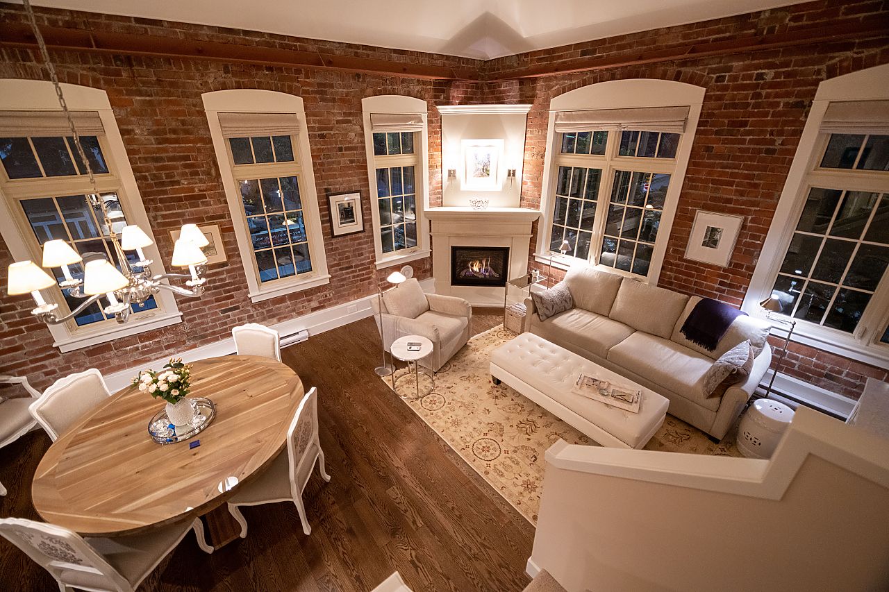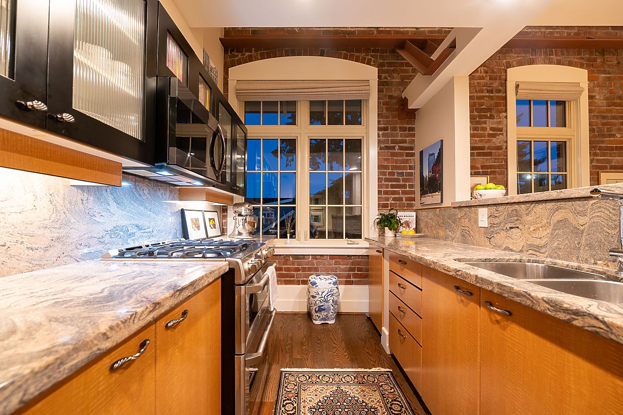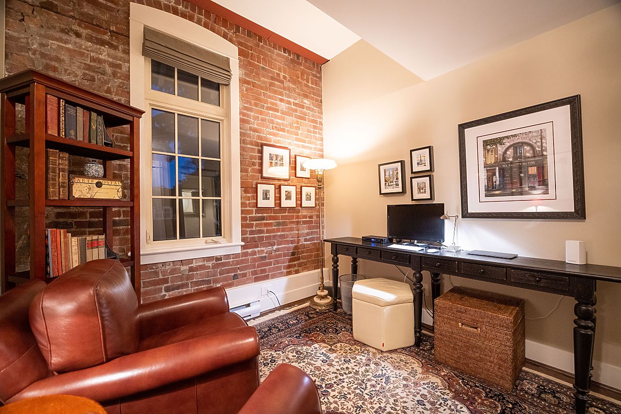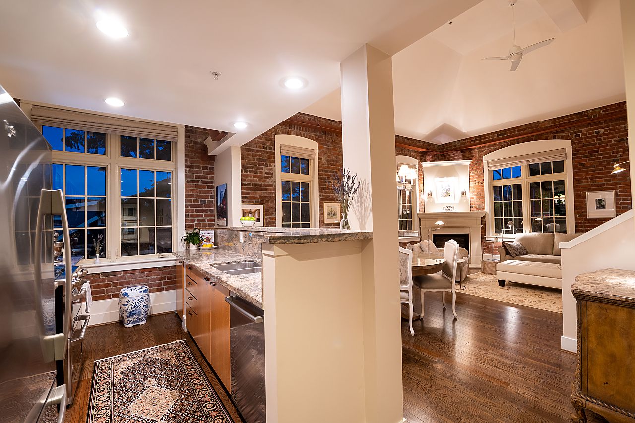 - Soaring 16’ ceilings and fabulous character features including exposed brick walls and steel beams, deep baseboard trim and crown mouldings