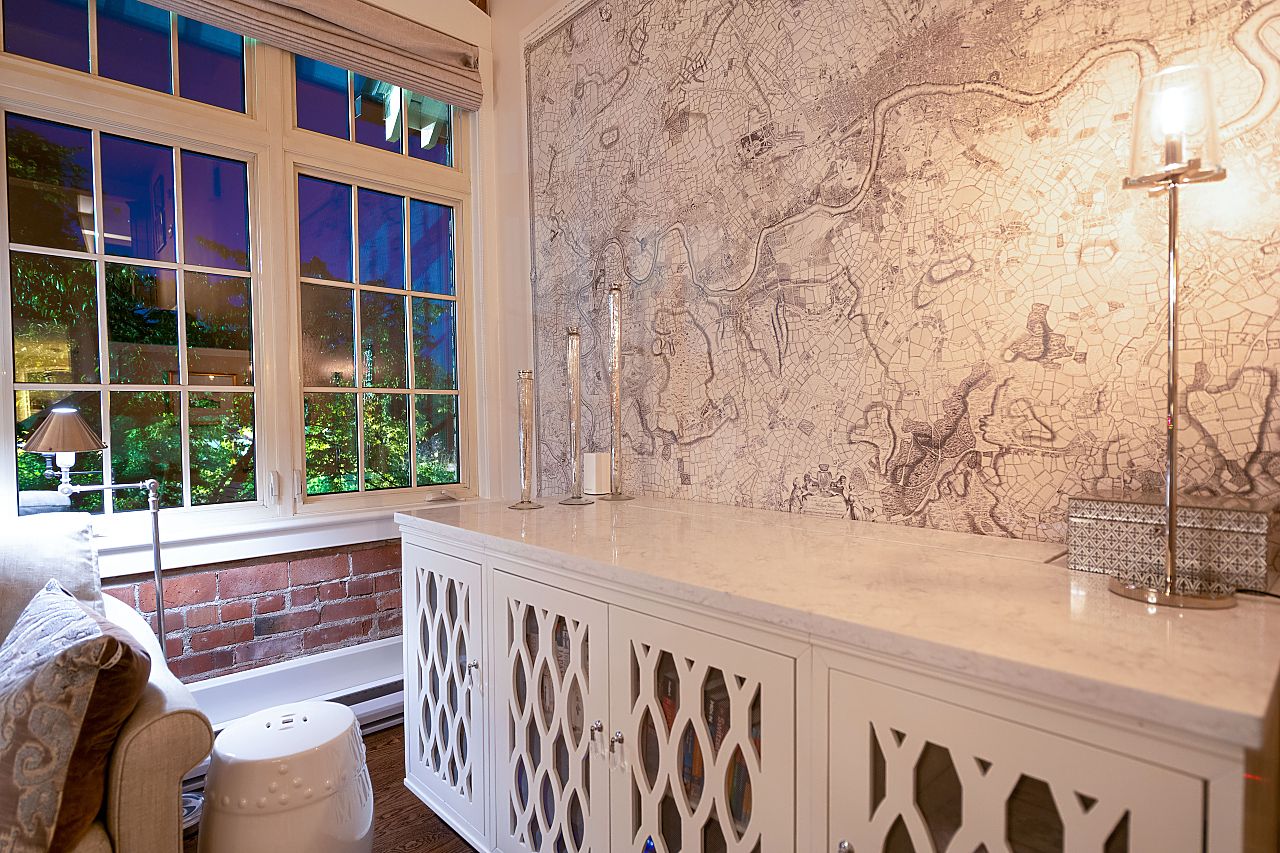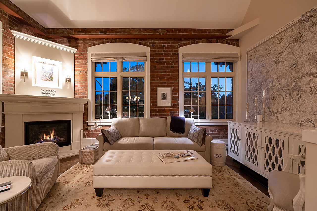 - Gorgeous living room with stylish French Country gas fireplace with lit inset art display, and designer inspired wall-mounted ancient map of London circa 1700