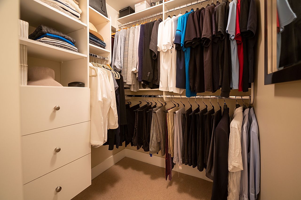 The carpeted upper level offers a spacious king-size master suite with walk-in closet with custom organizers, skylight with remote controlled blind, and seating area with lit built-in shelving. The new luxurious master bathroom features a walk-in shower with rain-shower and hand held adjustable shower, and sleek glass barn-door enclosure. The laundry room has extra shelving and a clothes hanging rack. A large 58 sq. ft. carpeted storage area (access door on east wall behind art) provides ample space for luggage and more.
