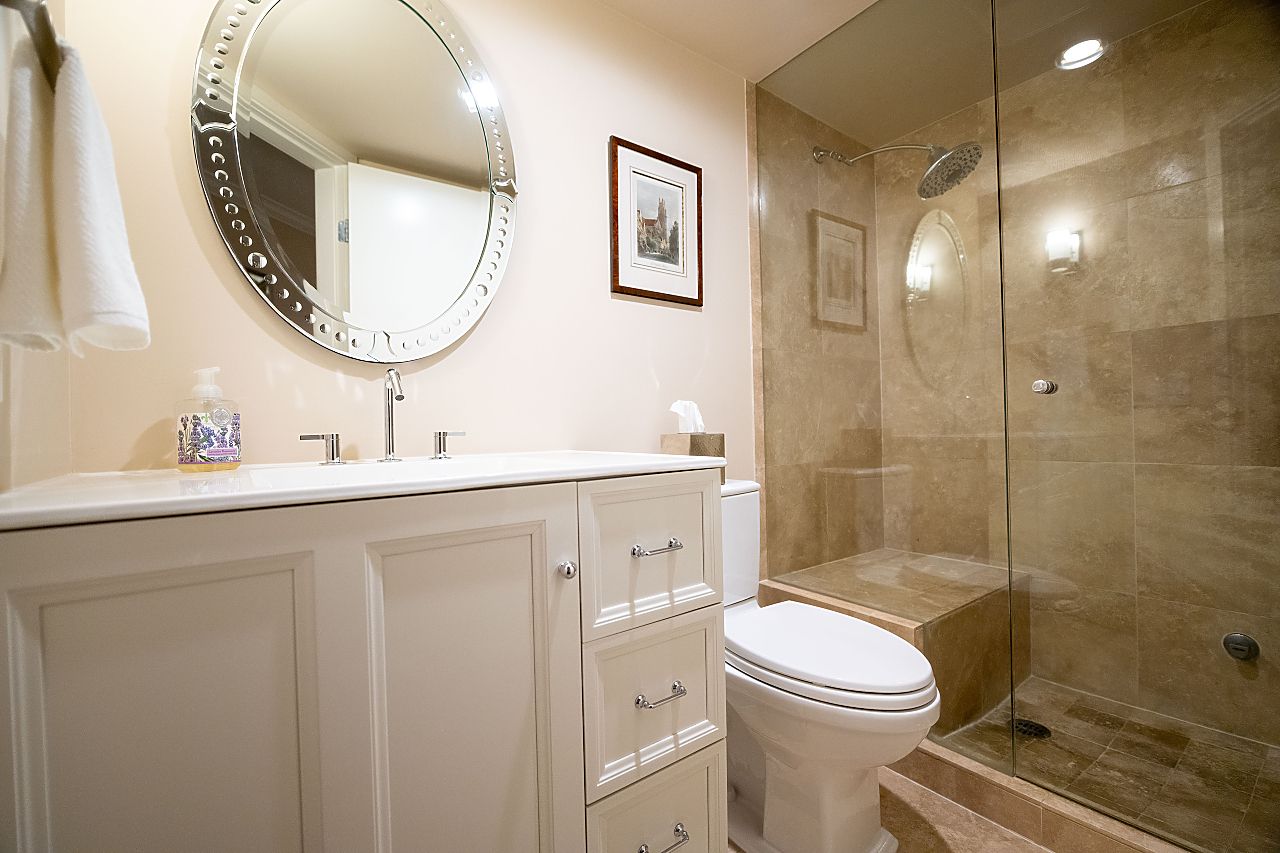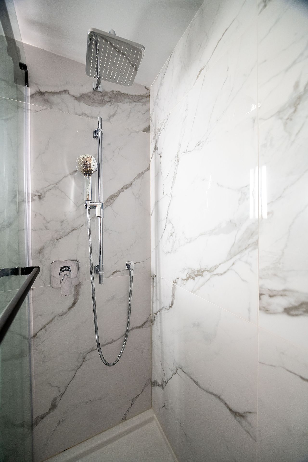 - Luxurious bathroom with marble clad steam-shower with seat and rain-shower head