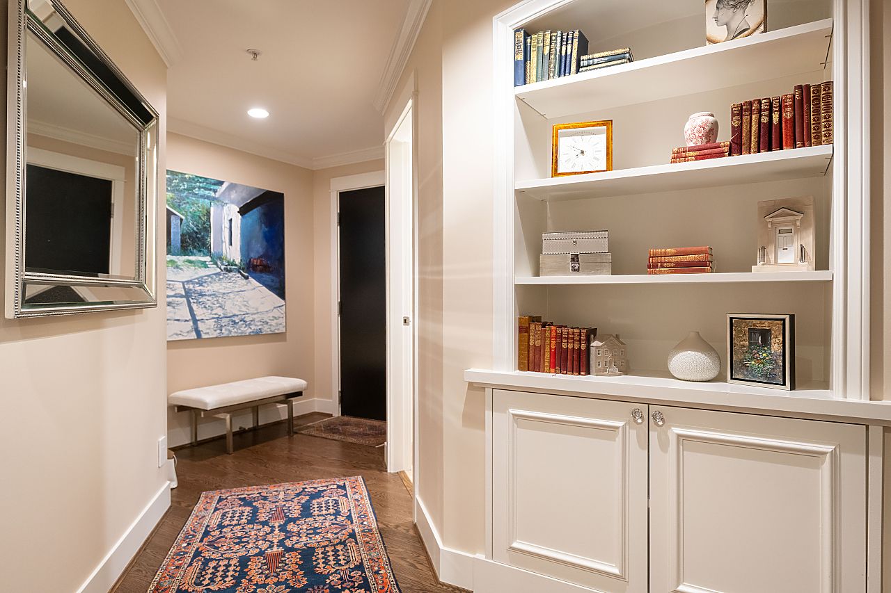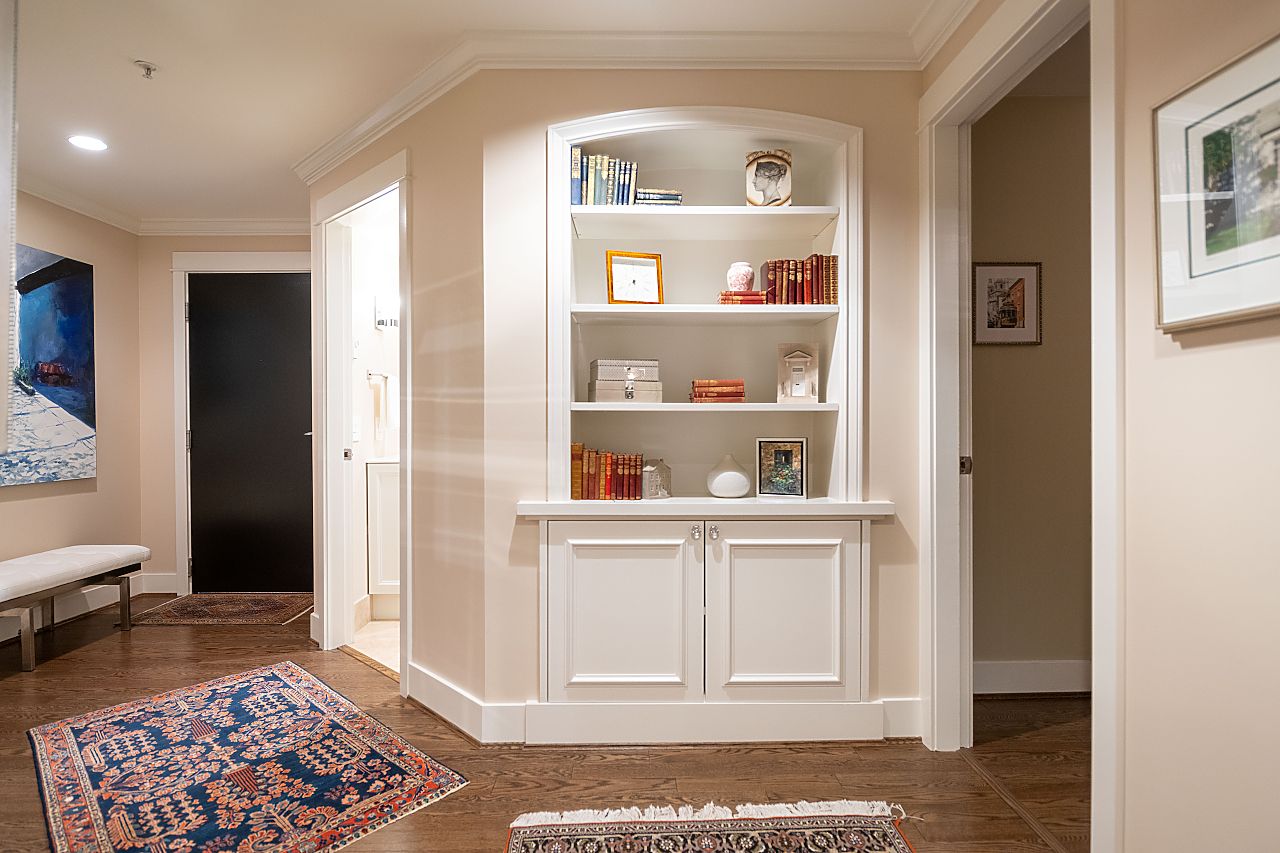 - Elegant custom-designed built-in TV cabinet with Carrera marble top and